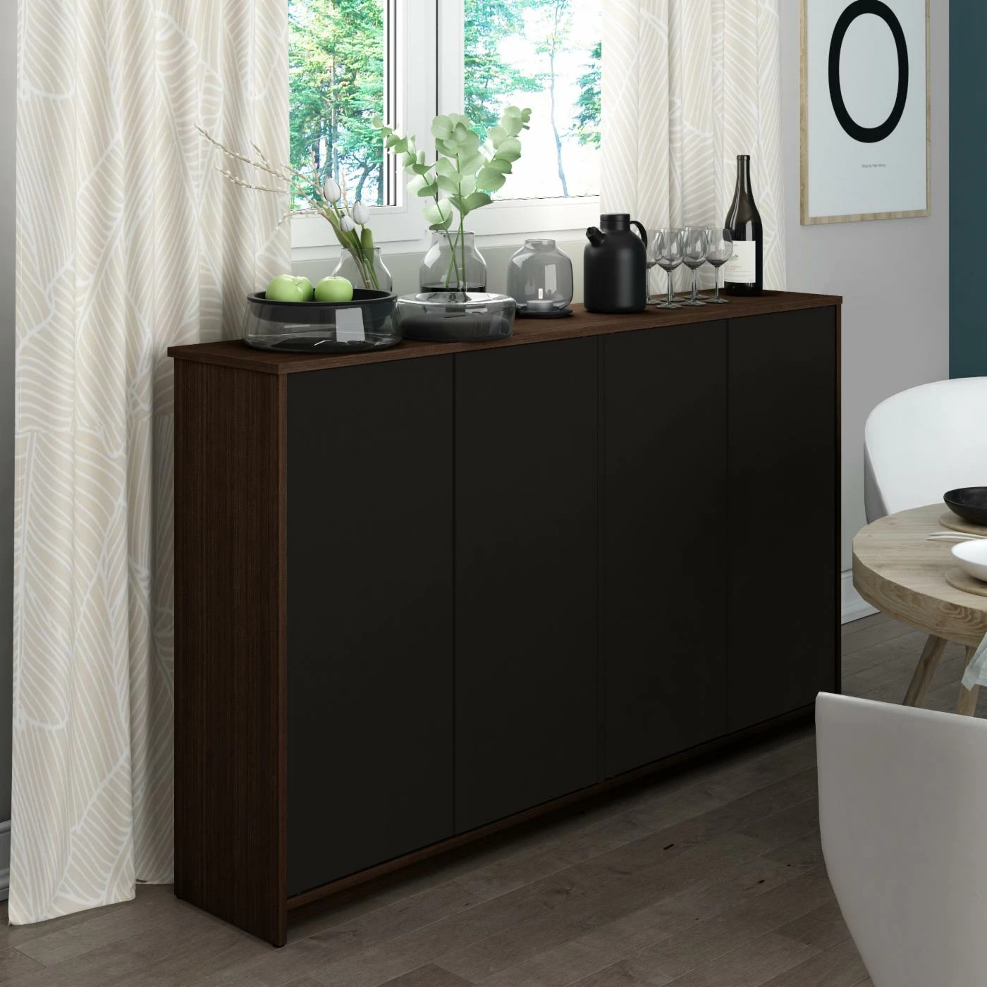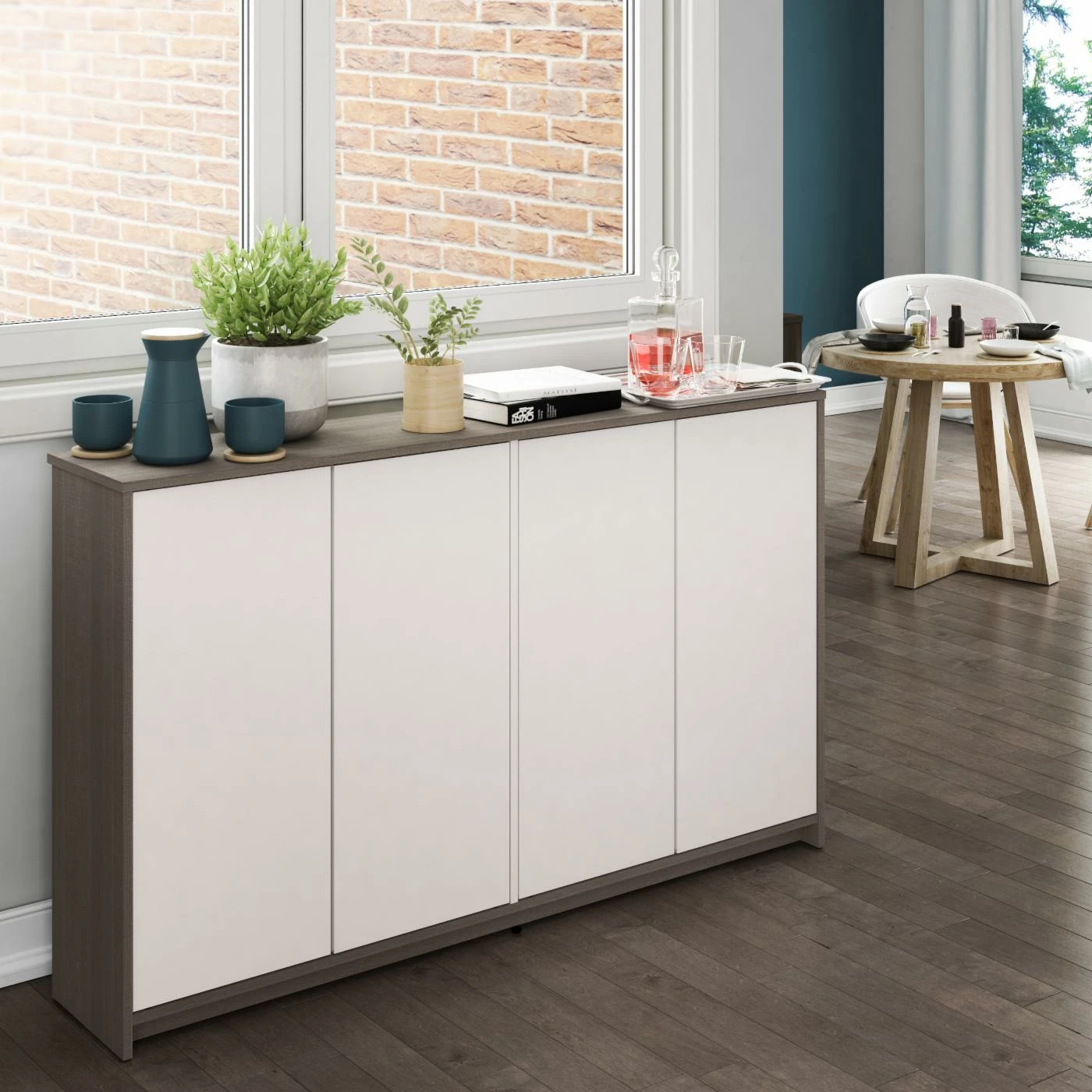 Introduce some better storage into your living room or bedroom with the Bestar Small Space Storage Unit. This wide storage unit features a two double-door cabinet, each with two interior shelves. Customize the interior any way you see fit to best suit your needs. The frame is constructed from robust engineered wood for a design that endures. Choose your desired finish from the available options.