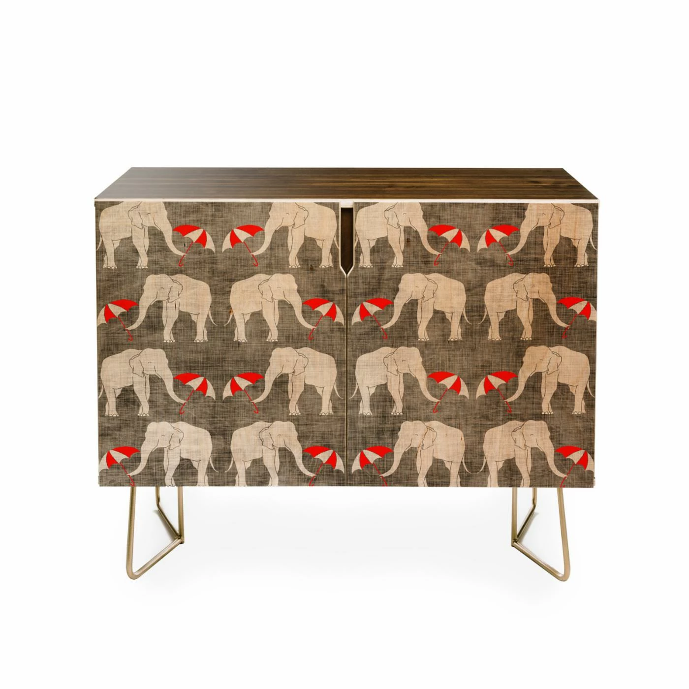 Artsy elephants hold jaunty red and white umbrellas to give the Deny Designs Holli Zollinger Elephant and Umbrella Credenza its modern art appeal. The artwork on the credenza’s double doors is protected by a smooth, durable high-gloss coating. Doors open on an adjustable shelf. This credenza is built from Baltic birch and stands on sleek metal legs in a gold finish.