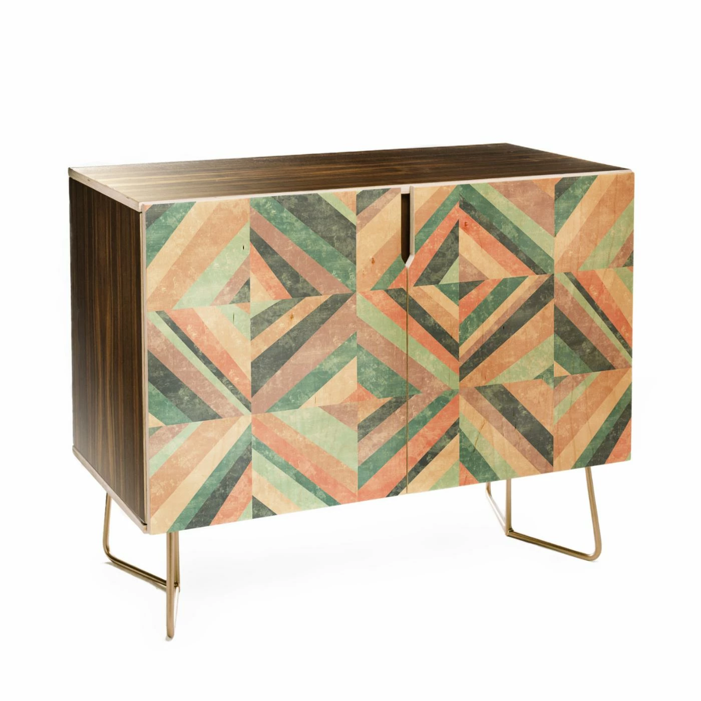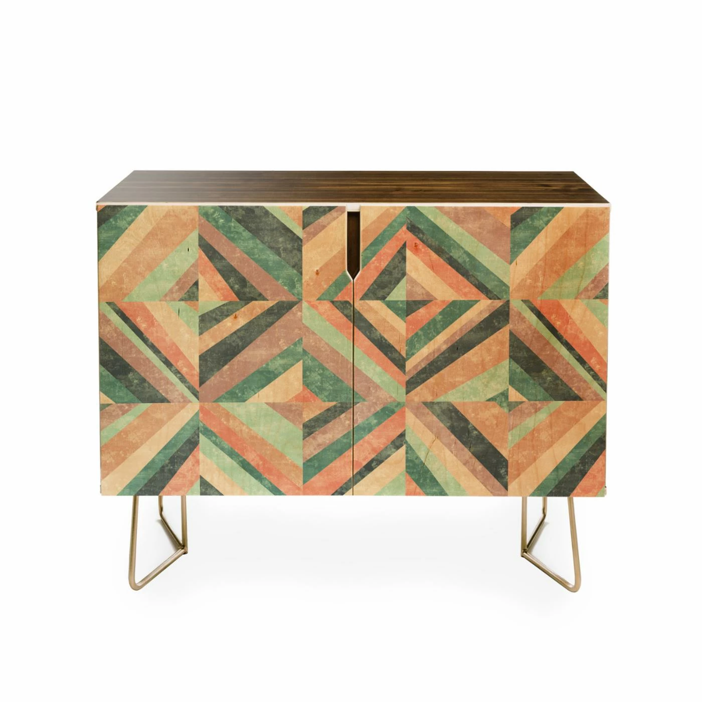Contemporary colors and a bold geo pattern make the Deny Designs Jacqueline Maldonado Hybrid Holistic Credenza perfect for glamming up your favorite space. The artwork is protected by a durable high-gloss coating. Double doors open on an adjustable interior shelf and abundant storage space. This credenza is built of Baltic birch in Colorado and stands on sleek metal legs in a gold toned finish.