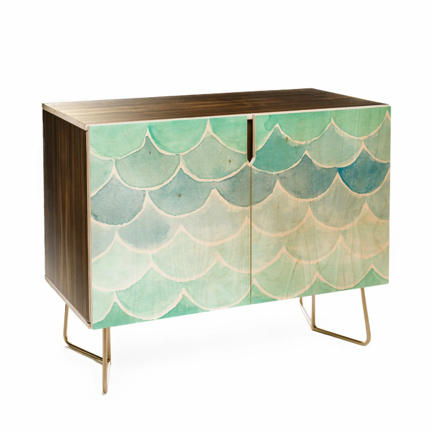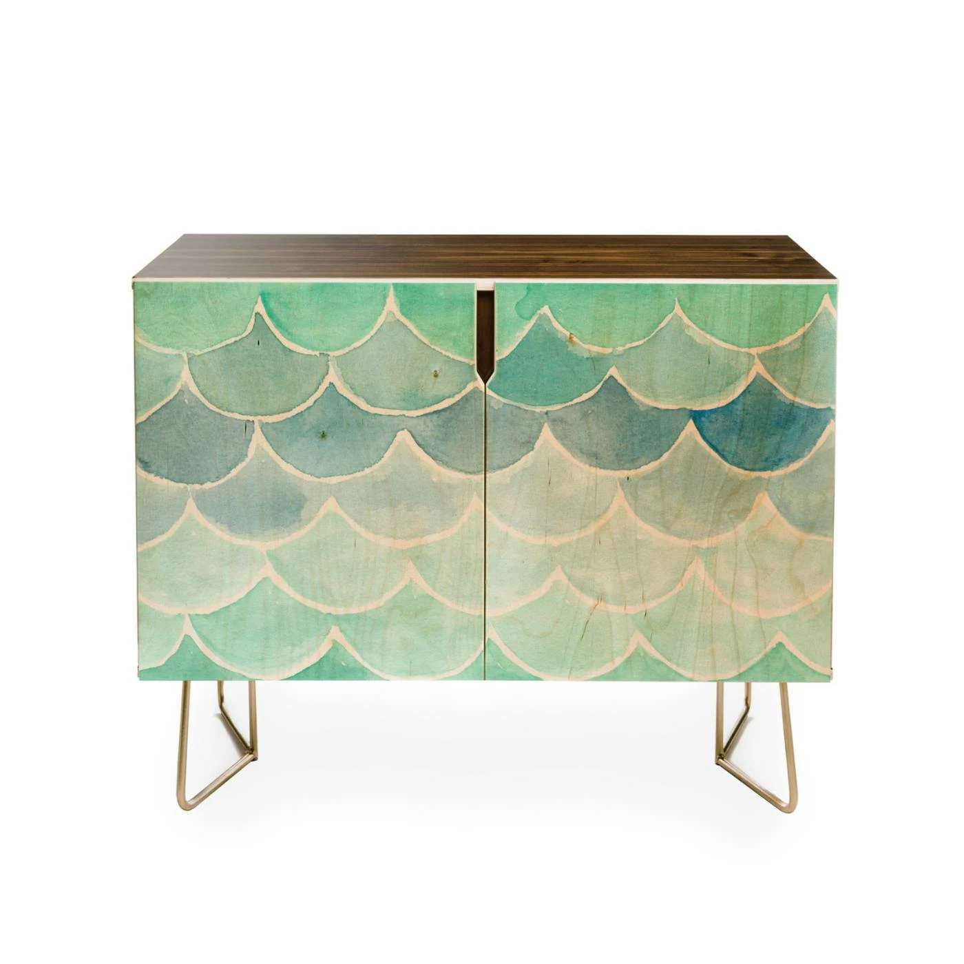 A green watercolor scale gives the Deny Designs Wonder Forest Mermaid Scales Credenza its underwater appeal. This magical credenza is crafted from scratch of Baltic birch in Colorado. Its original art print is protected by a smooth, durable high-gloss finish. To make this credenza smart and glamorous, it has an adjustable shelf behind its double doors and stands on sleek gold metal legs.