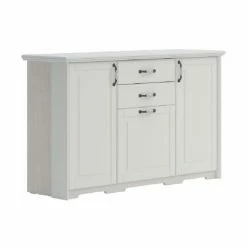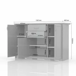 - Three cabinet doors hide 5 adjustable shelves