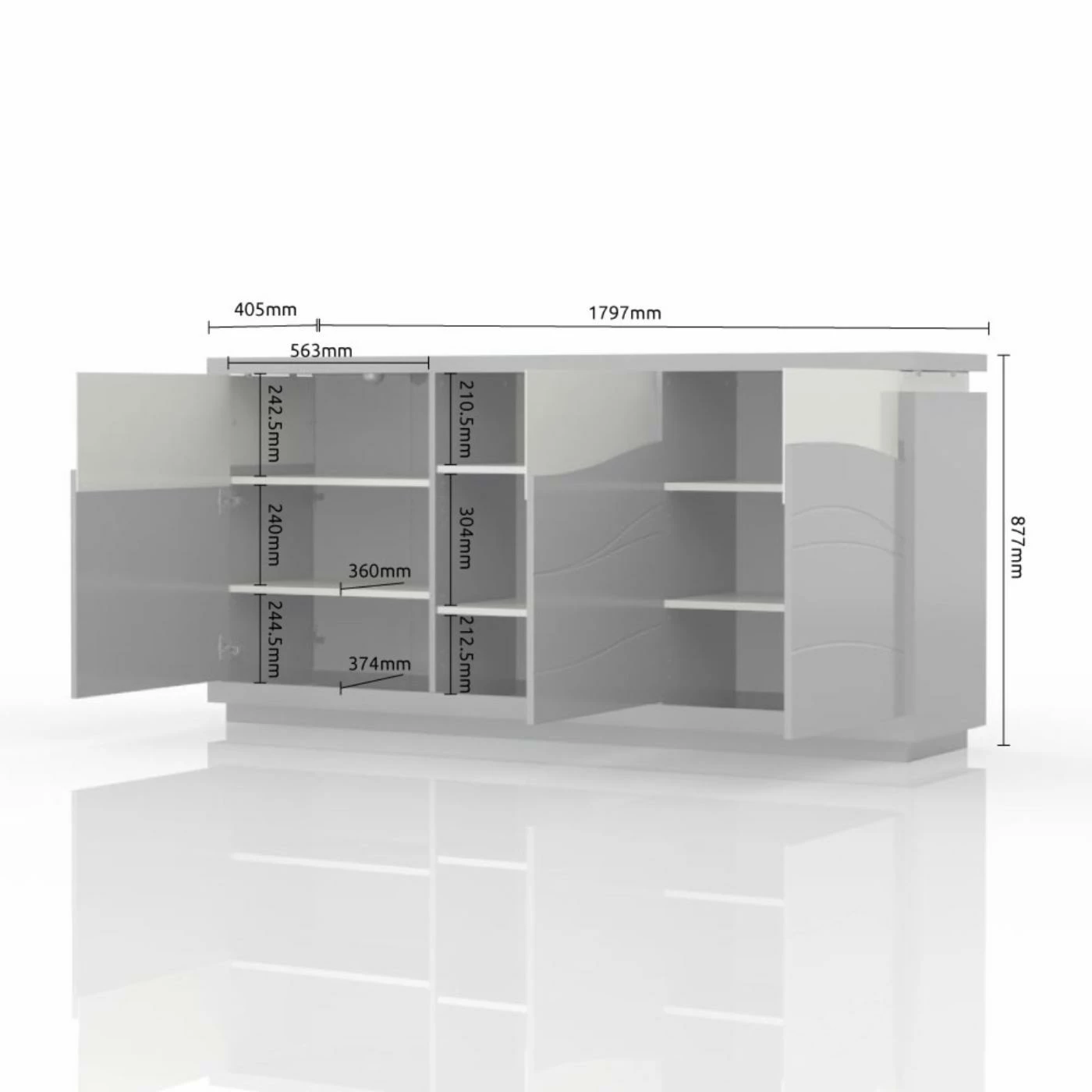 - 6 shelves behind 3 doors