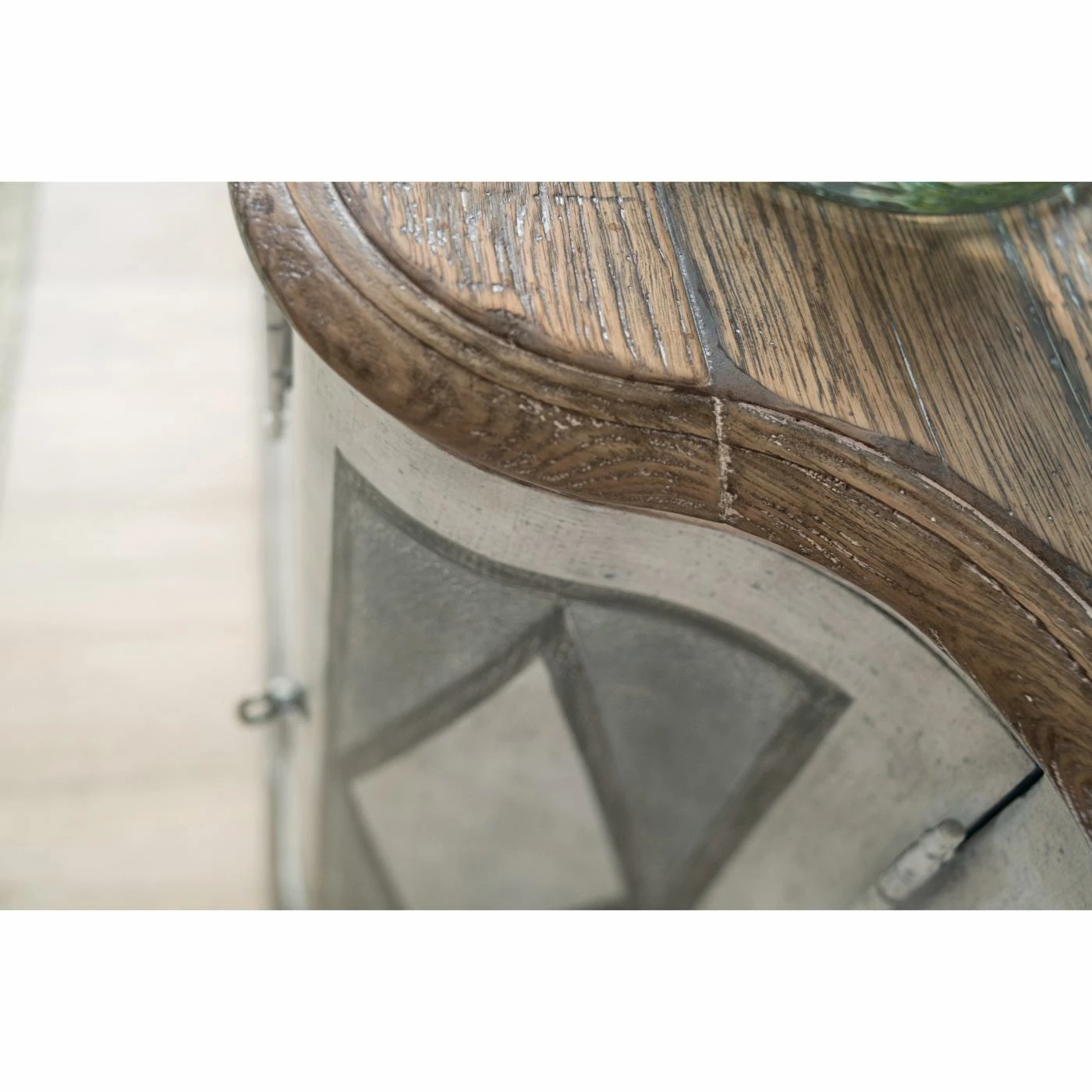 Organize your dishware, seasonal items, and table linens in the Hooker Furniture Boheme Saint Germain Server to keep your dining room clean and tidy. This server features four cabinet doors with bronze metal hardware that hide two drawers and ten adjustable shelves. You may also use the spacious top as a spot to decorate. This server is durably constructed from hardwood and poplar solids with white oak and maple veneers. It is finished with a whitewash background and middle diamond design, brown base and top, and gray box outline. The curves of this server add depth to the piece.