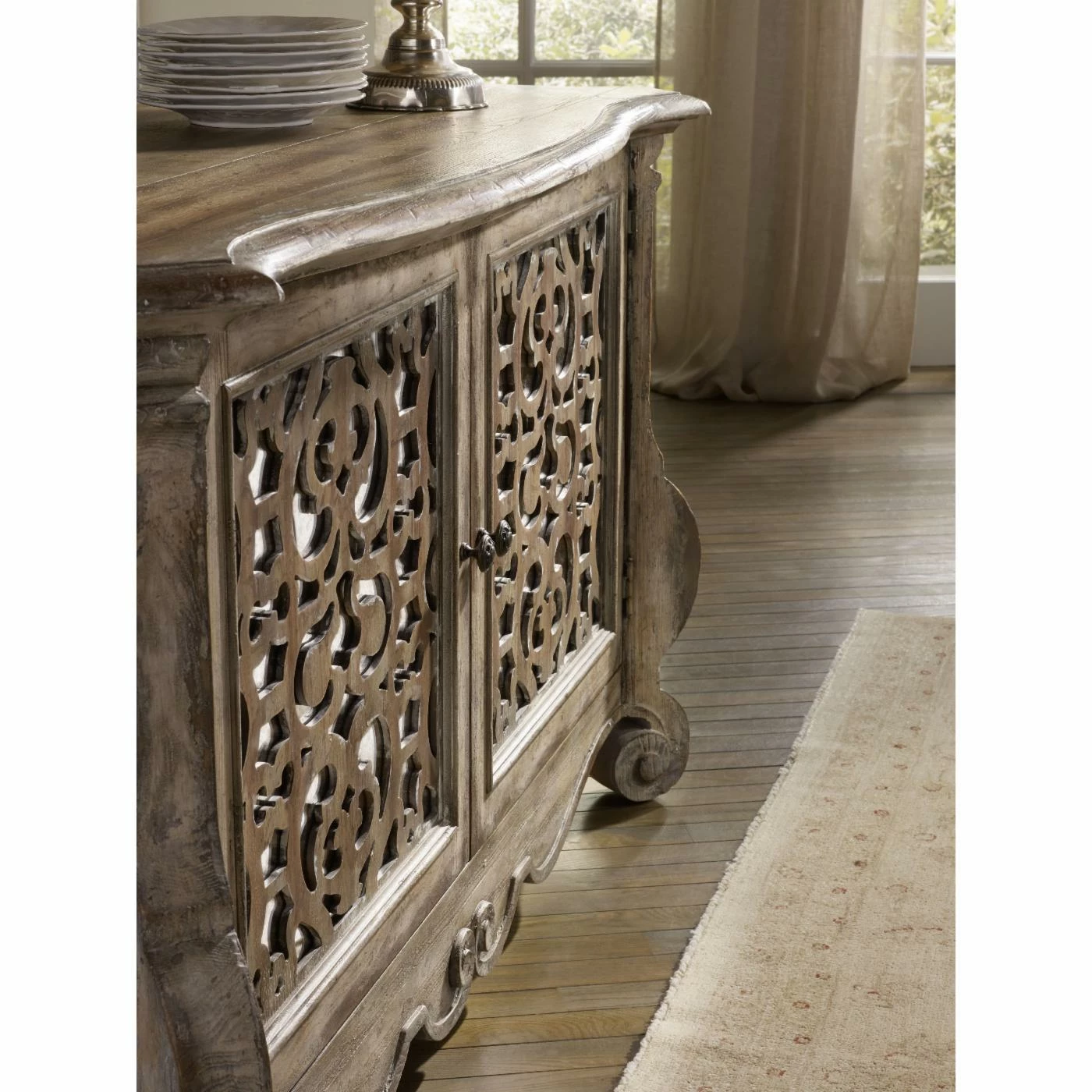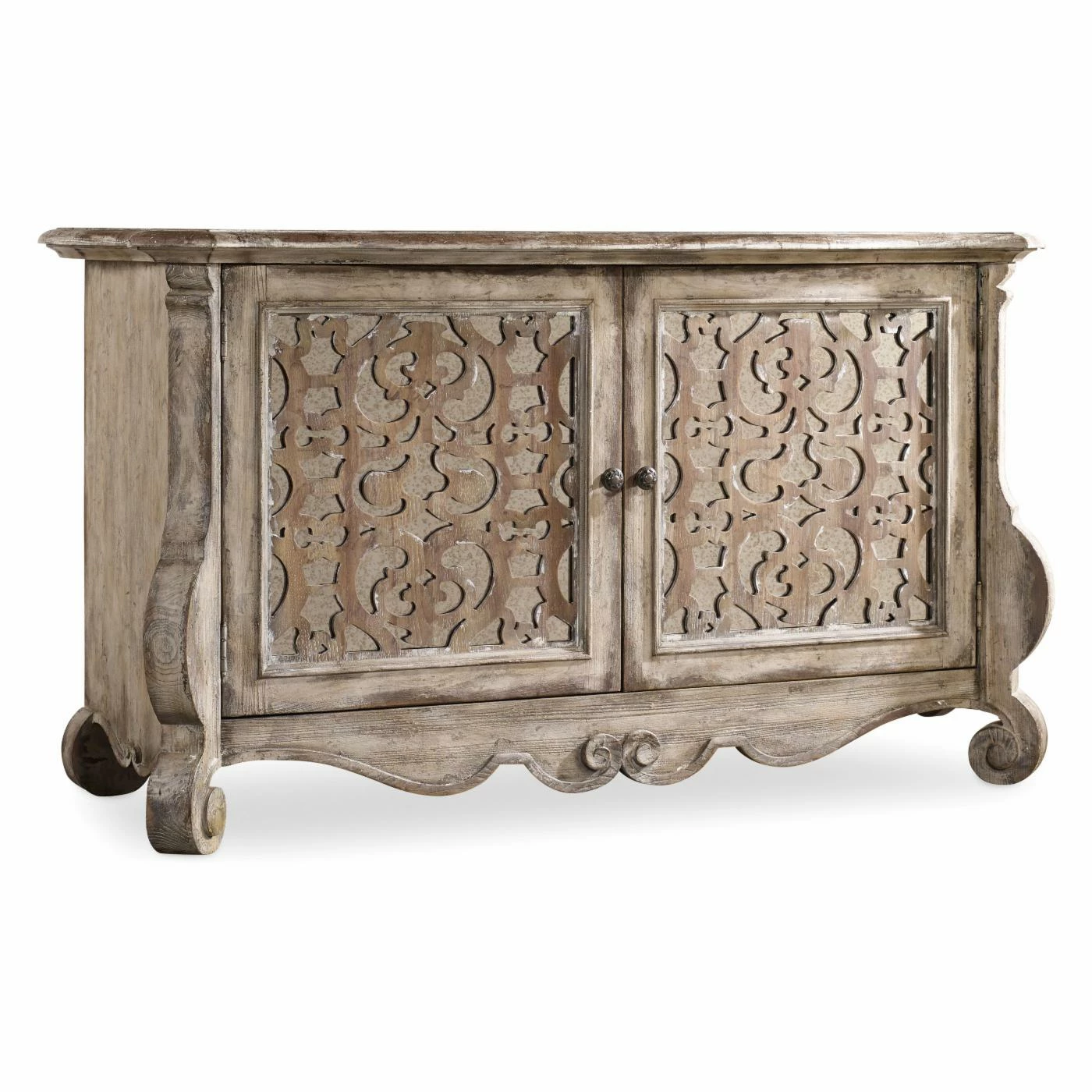 Inspired by timeless farm style antiques of Old World Europe, the Hooker Furniture Chatelet Cabinet is a unique and decorative piece that’s sure to make a statement in your dining room. Constructed of poplar and hardwood solids with pecan veneers, it features a multi-step finish process for a distressed look. The pecky pecan veneers feature a warm, soft amber color of Caramel Froth with a touch of aged white paint to highlight the wood’s grains and moldings. A Paris Vintage finish creates an overall distressed look. The two doors outfitted with antique mirror panels under ornate fretwork are completed by custom-designed, generously scaled door pulls in a burnished bronze finish. Open the doors to find an adjustable shelf for storing your china or other entertaining essentials.