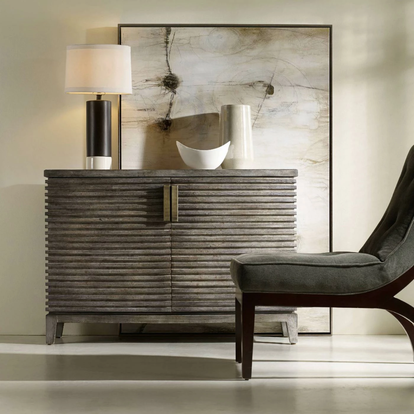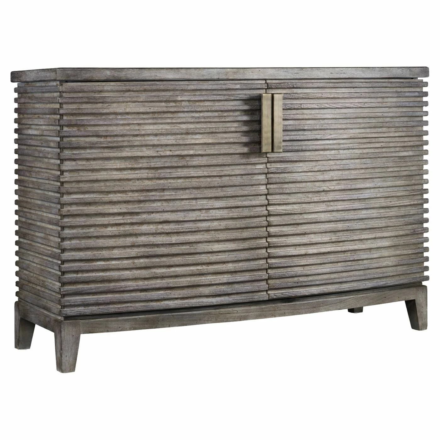 To create its rustic, sophisticated look, the Hooker Furniture Melange Delano Chest is wrapped in sleek, linear slats. This chest has a curved front, stunning vertical pull hardware, and a distressed wood finish. The two doors open to reveal two adjustable shelves.