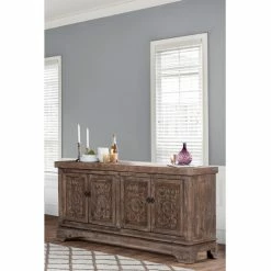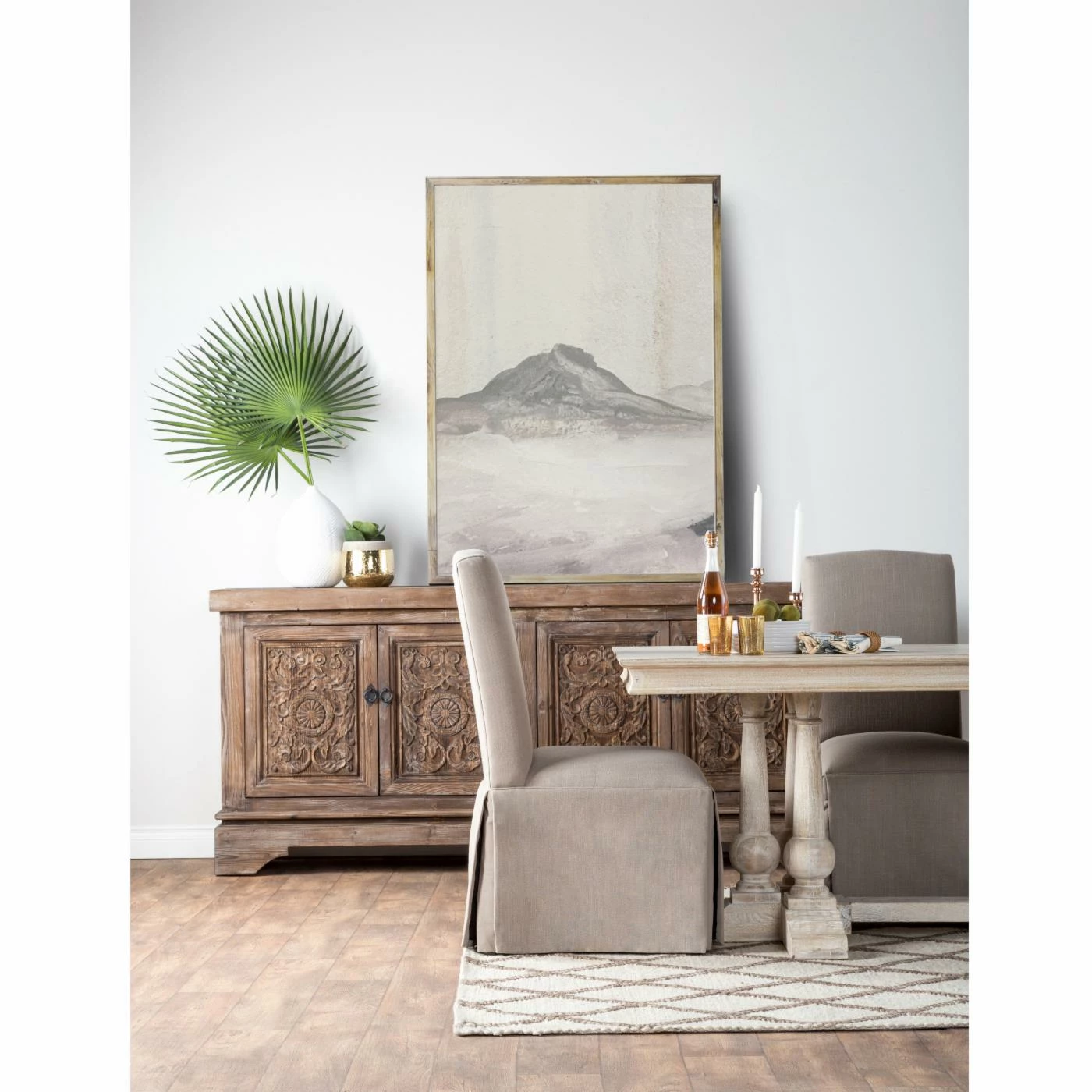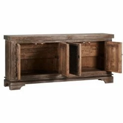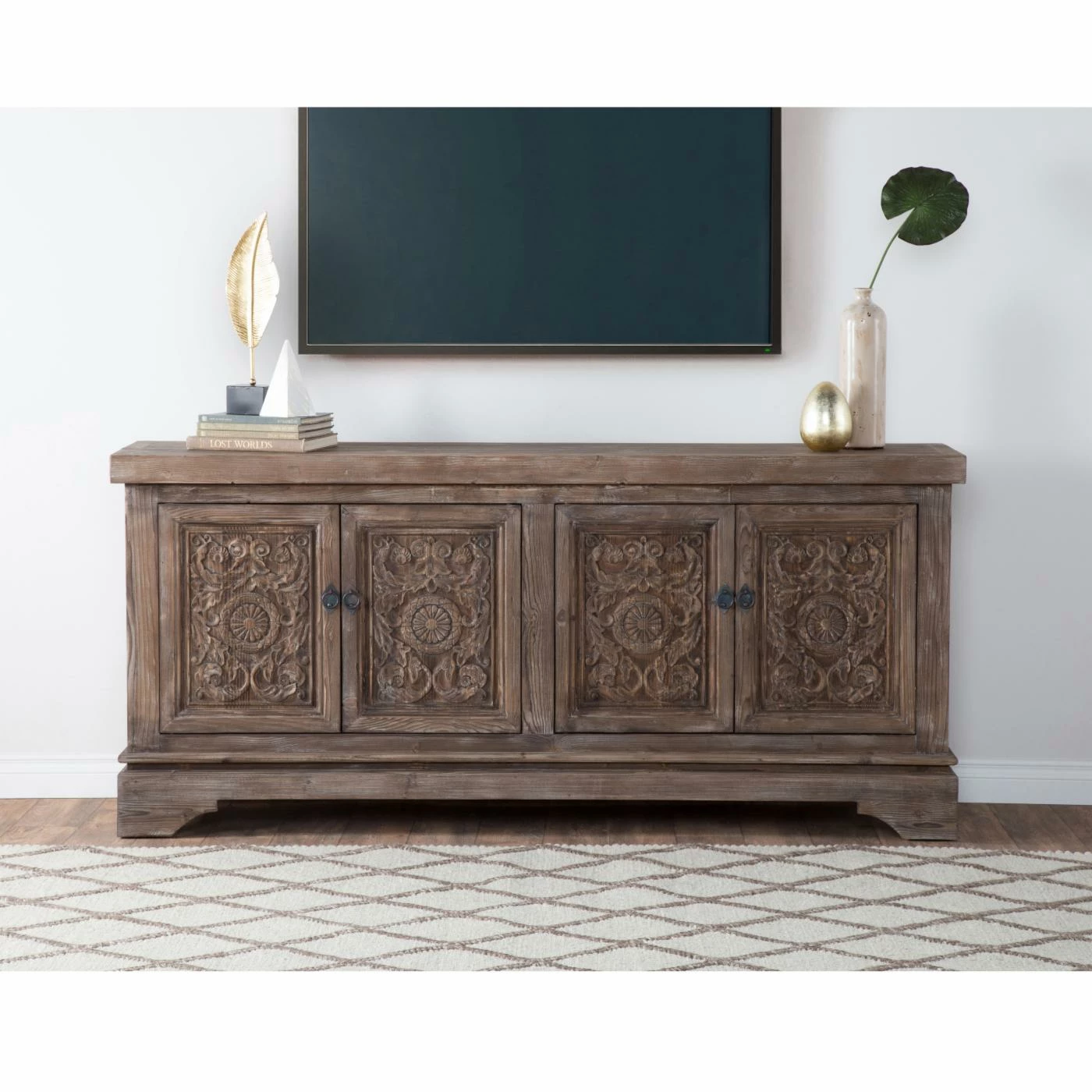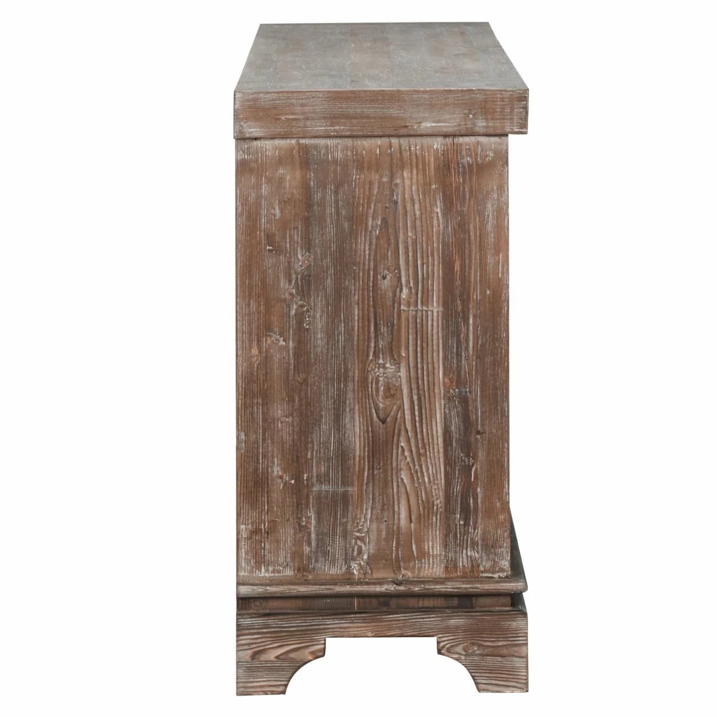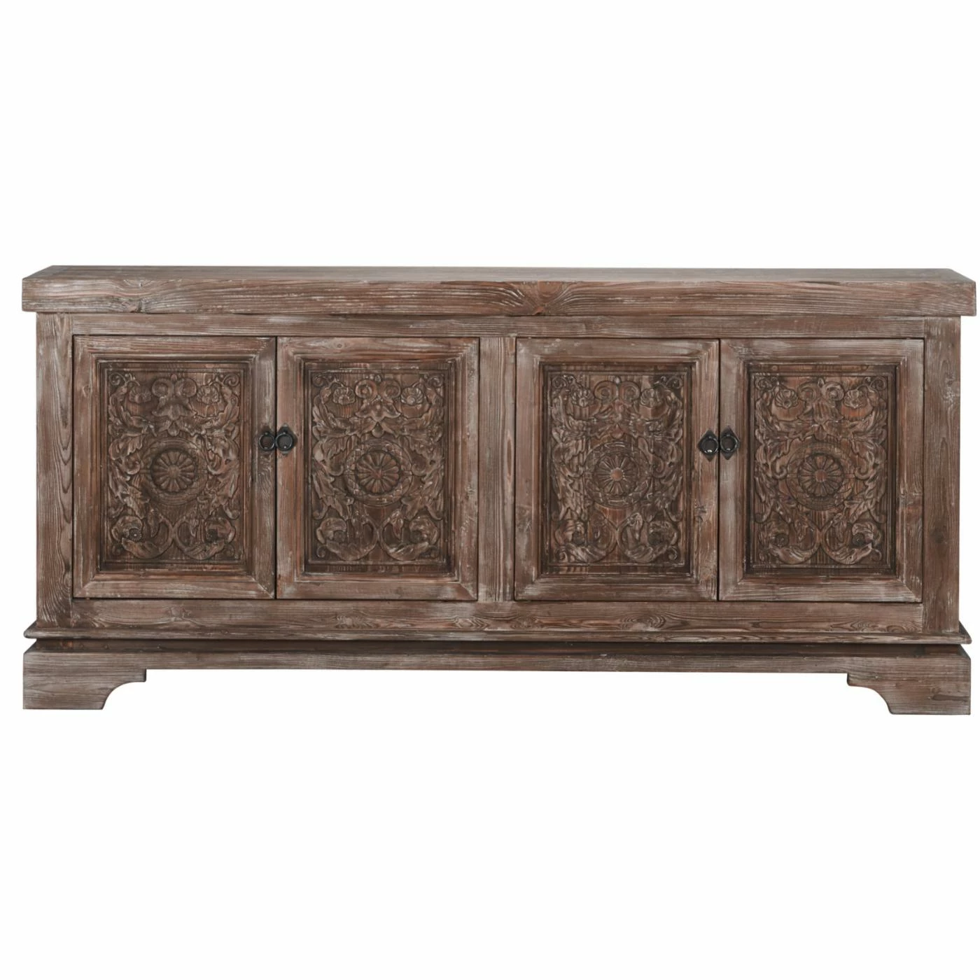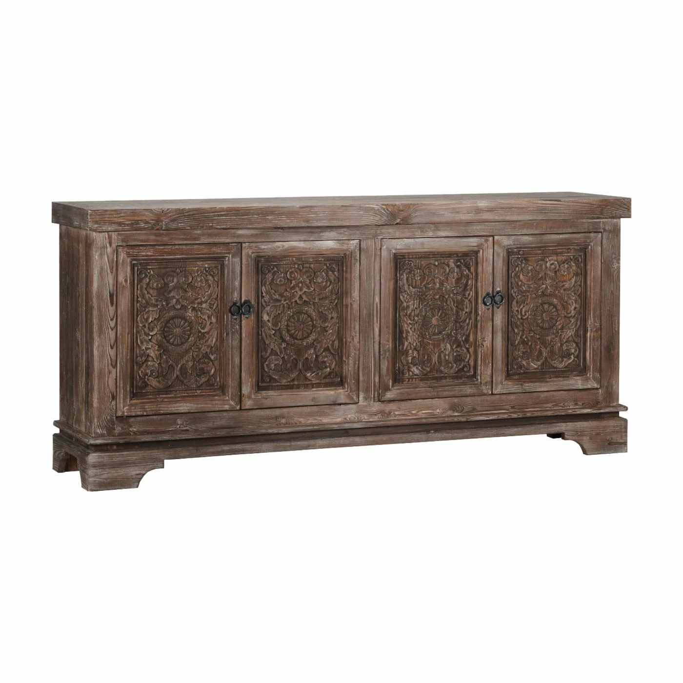 The beauty of the Kosas Home Allen Reclaimed Pine Sideboard lies in its reclaimed wood craftsmanship, as well as the intricate carvings on the doors. Constructed of reclaimed pine wood, this sideboard is sturdy, strong, and spacious. Four doors open to reveal two adjustable shelves for dishes, table linens, serving platters, and more. A hand-distressed, rustic brown finish accentuates the natural wood grain. For added style and visual interest, the doors feature pull rings and ornate floral carvings.