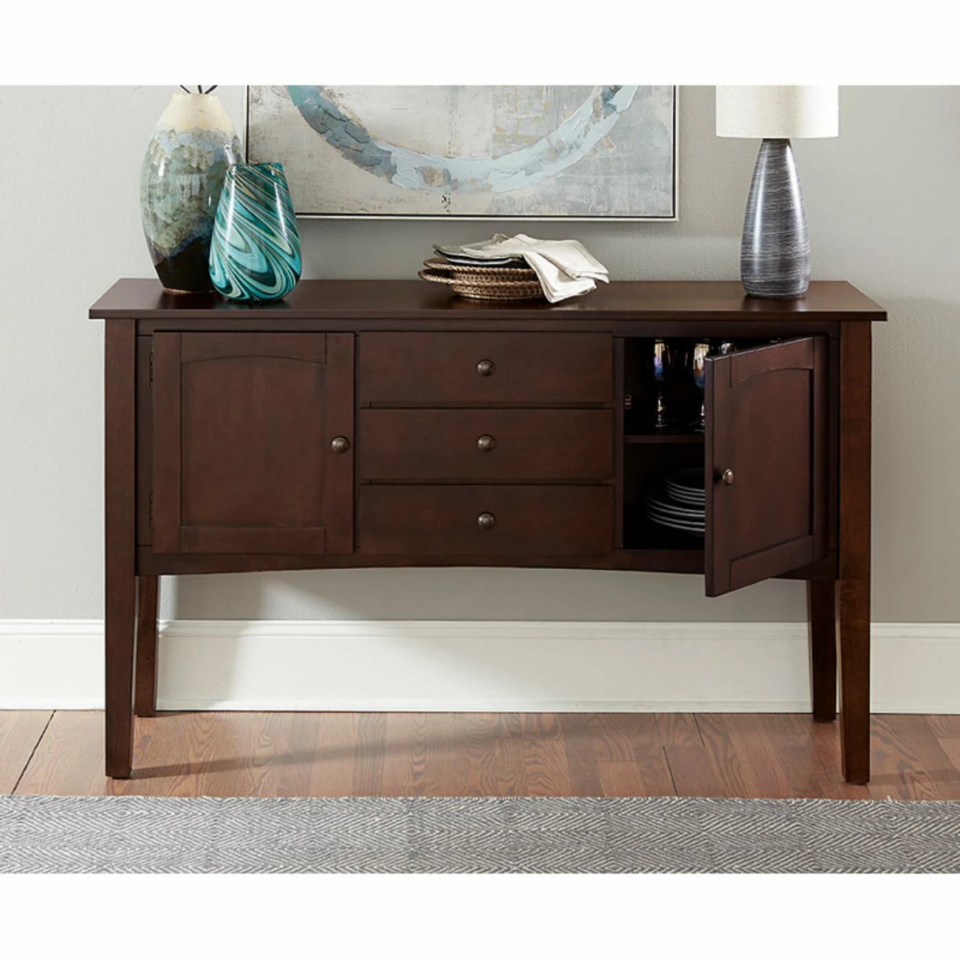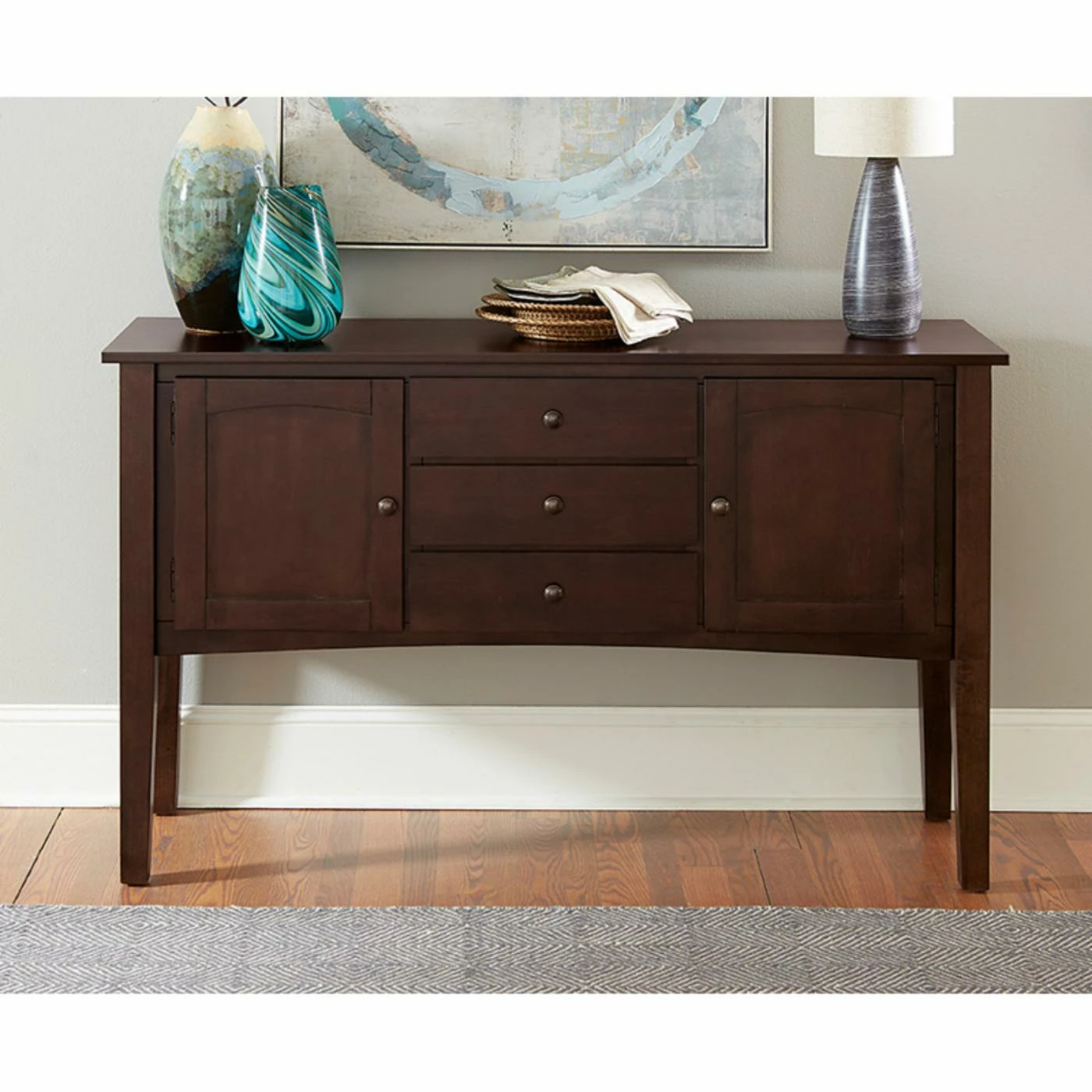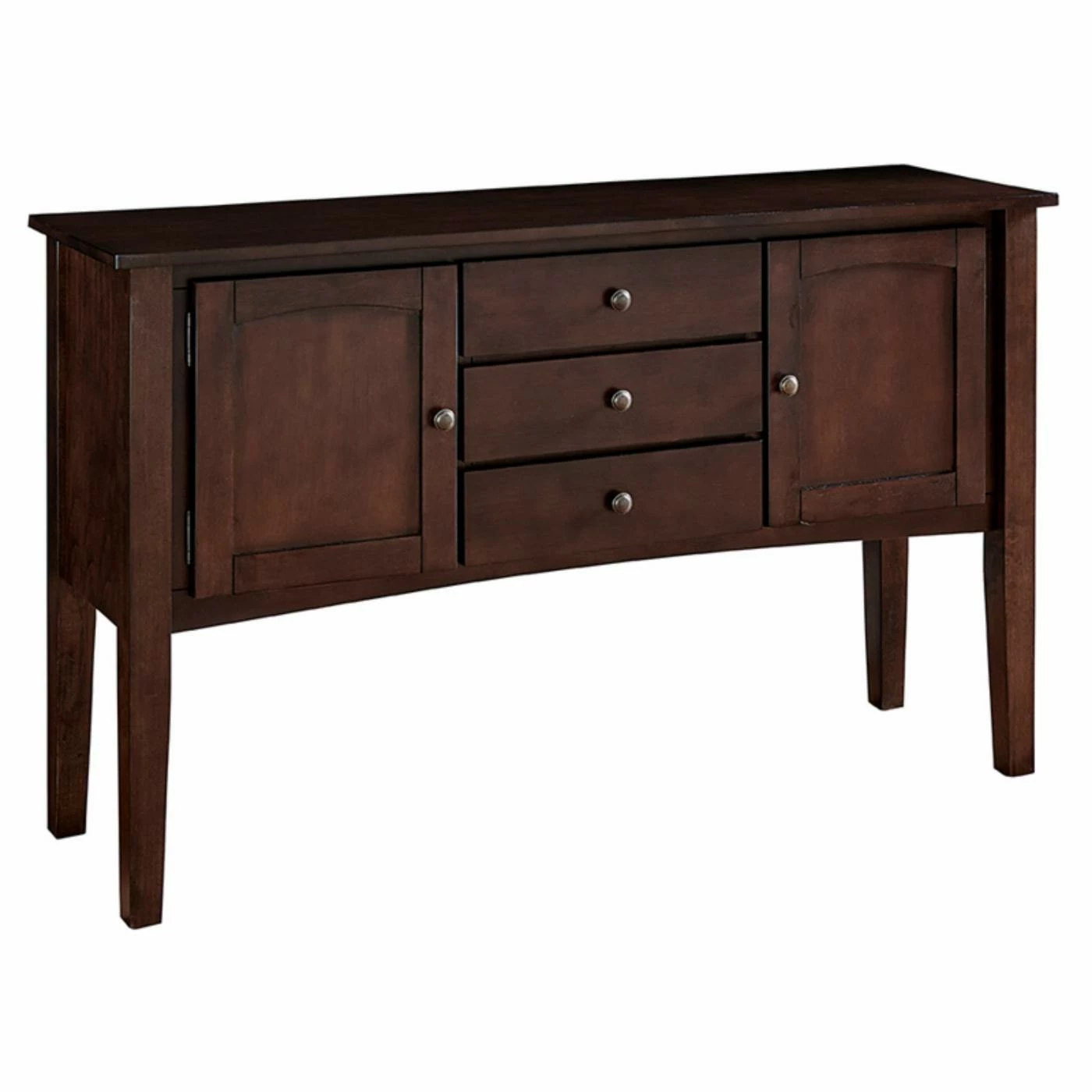 The sleek tabletop of the Progressive Furniture Kinston Server is balanced by the gentlest of curves on the lower part of the frame. Thinly tapered legs offer balance and symmetry. Two doors and three drawers offer endless options for storage while providing a clean and classic design. This server works well in any dining room or as an accent storage piece in a living room, entryway, or office.