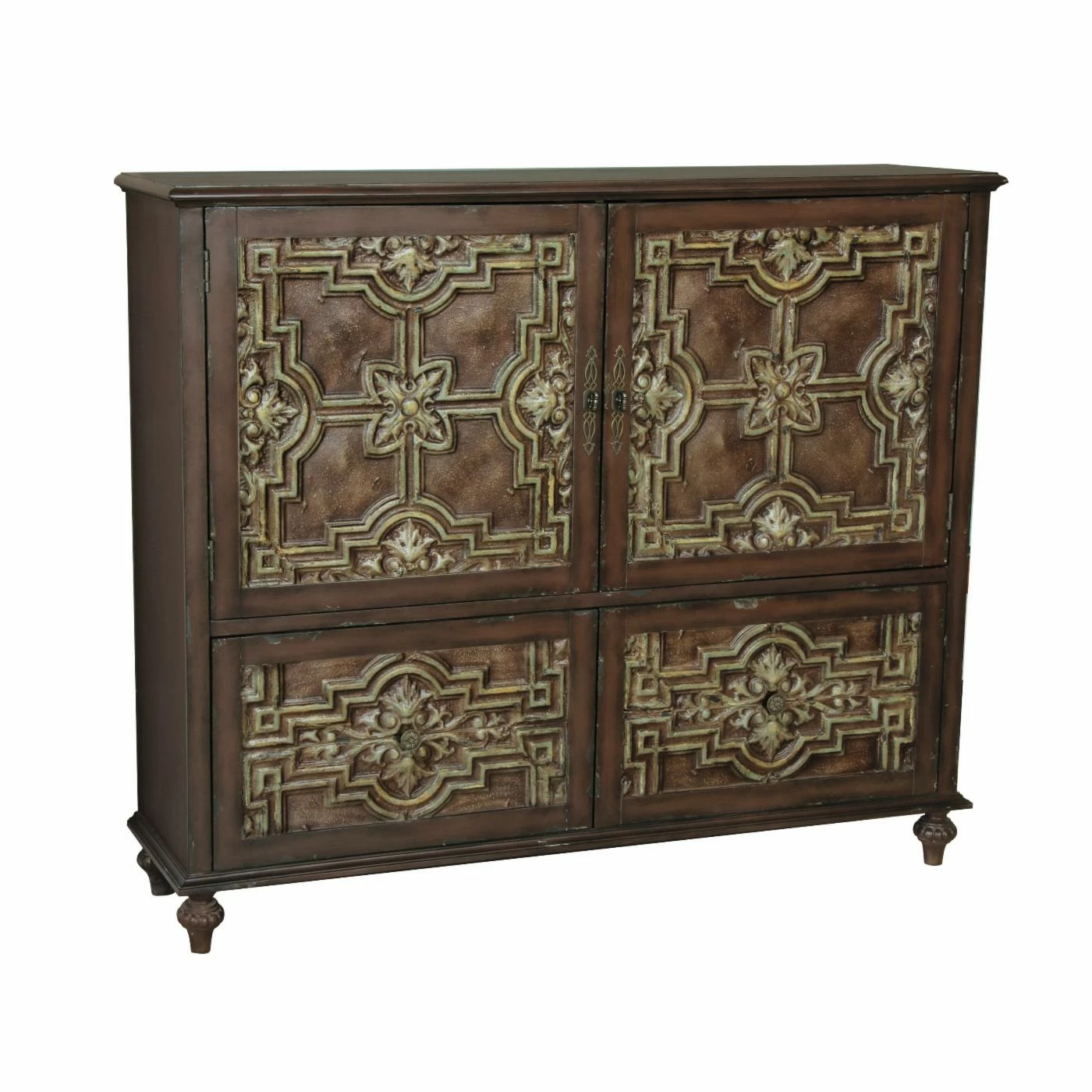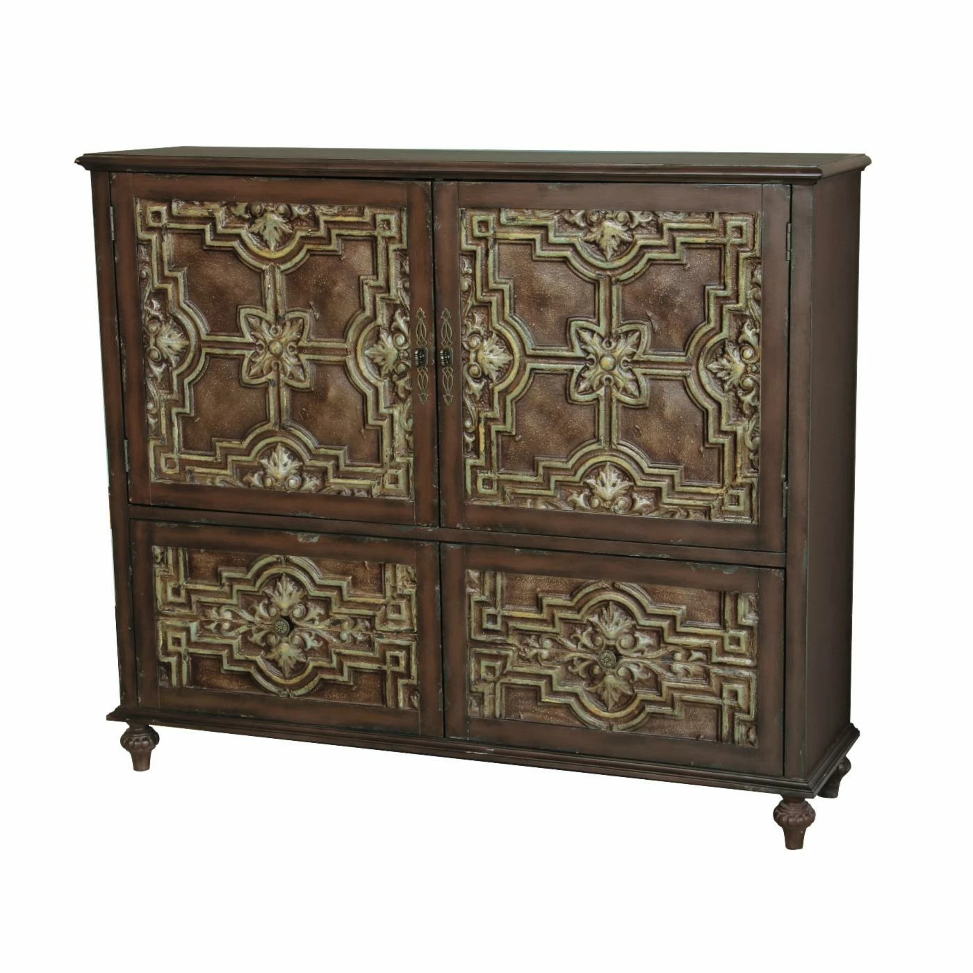 The Right2Home Lattice & Leaves Credenza helps lend your kitchen or dining room some appreciable classical storage space. A shelved double-door cabinet and two drawers are incorporated into this piece, each featuring a molded lattice and leaf design imprinted on their faces. The frame is constructed from wood with carved turned feet. A deep brown finishes the wood.