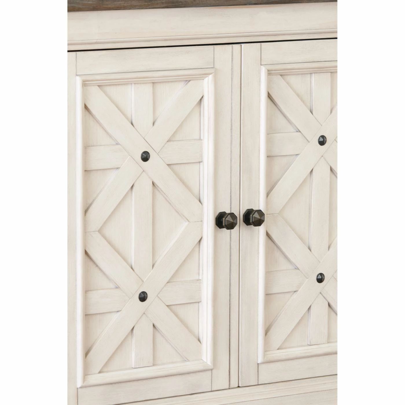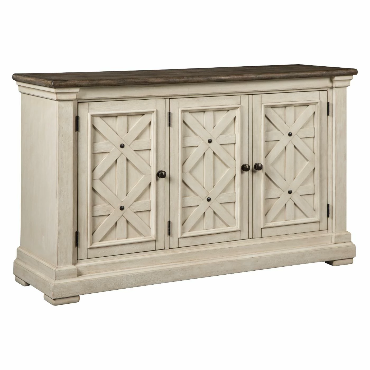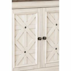 Craving extra storage for your farmhouse/cottage dining space? The Signature Design by Ashley Bolanburg Server comes to the rescue in a charming two-tone finish. Cabinet doors with βasteriskβ fretwork are pretty as an old barn door. This server is built of oak and acacia with pre-weathered finishes for an authentic feel. Keep kitchen gadgets or serving items protected from dust behind the cabinet doors.