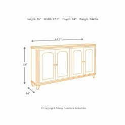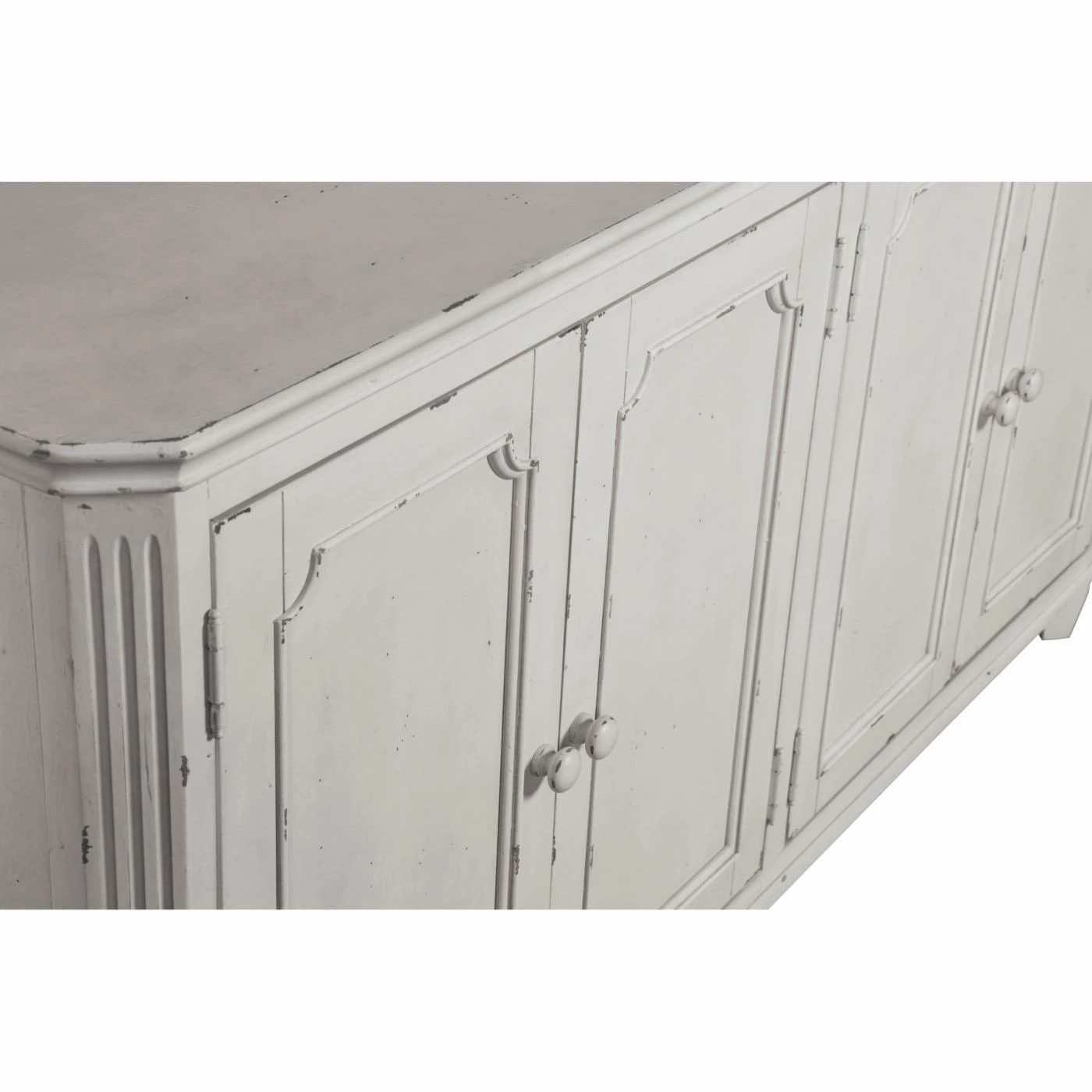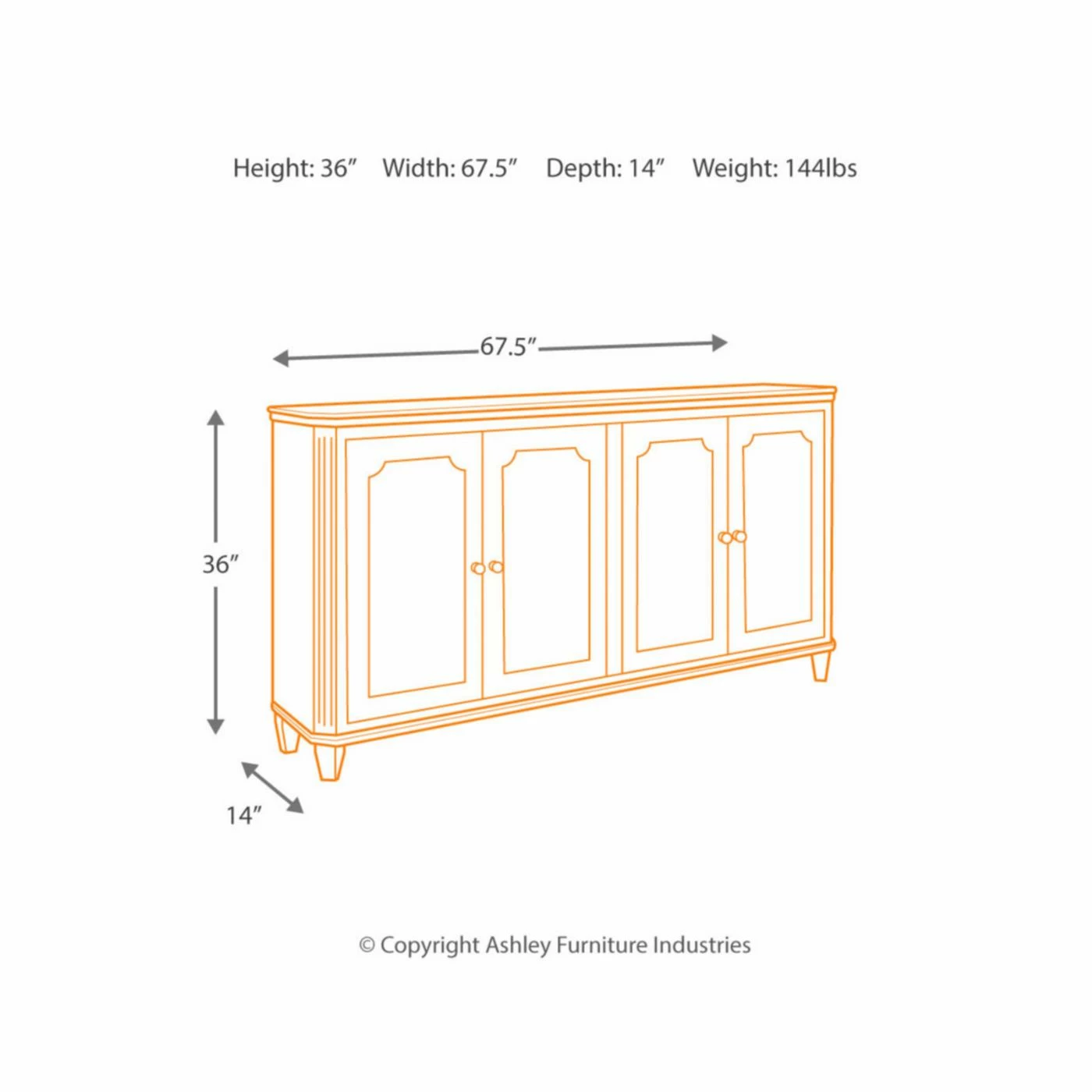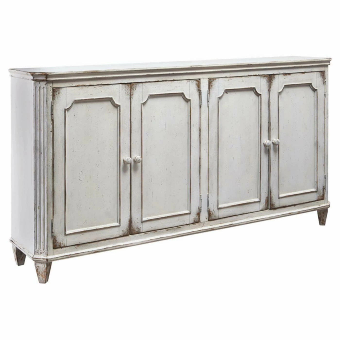 Get the vintage, romantic aesthetic you’ve always dreamed of with the Signature Design by Ashley Mirimyn Sideboard. Adjustable shelves hidden by four wood-paneled doors make this cabinet an eminently practical choice for storage in your dining room, foyer, or bedroom. But it is the delicate French-inspired molding and lightly distressed antique white paint that gives it charm.