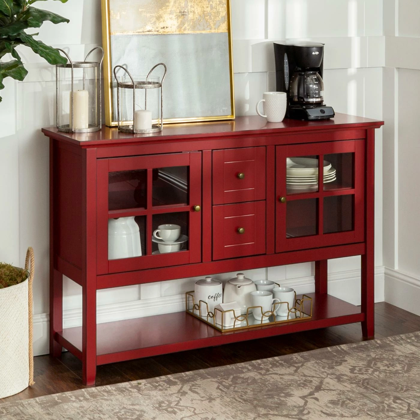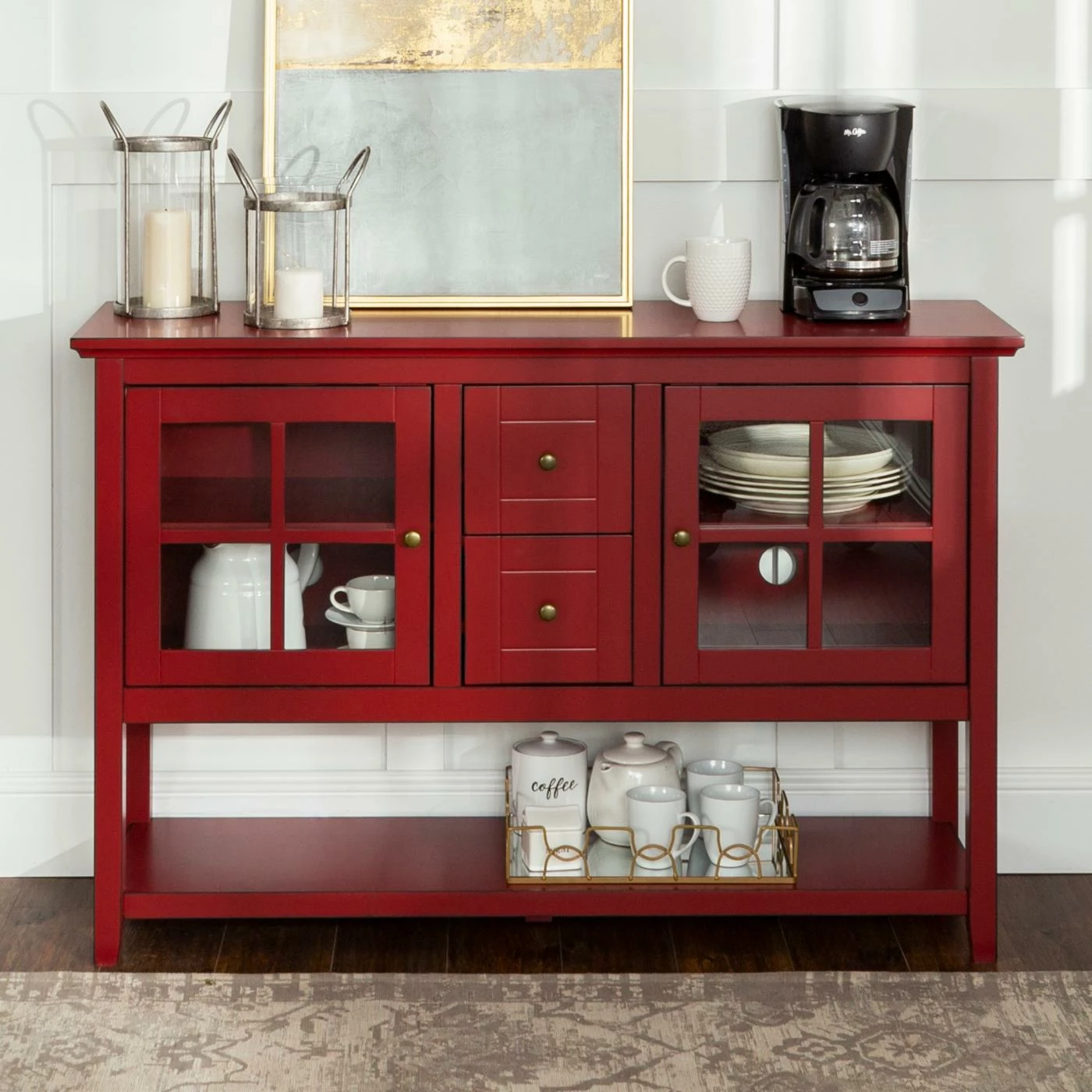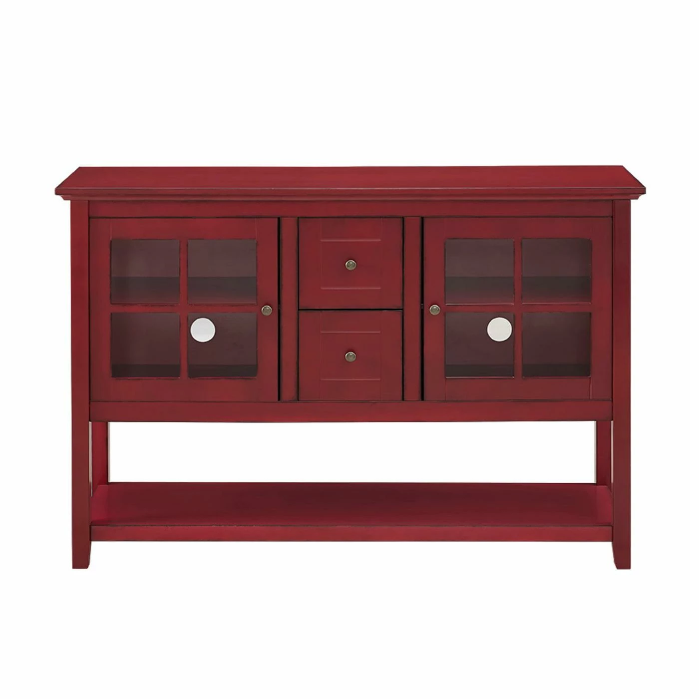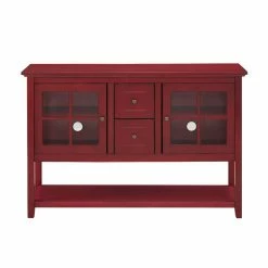 With so many uses, the Walker Edison 52 in. Wood Console Table / Buffet – Antique Red is a fashionable fit in most any room of the house. Use it as a buffet in the dining room, as a console table in the foyer, or even as TV stand in the living room – it can accommodate most TVs up to 55 inches wide. It’s crafted of high-grade engineered wood (MDF) in an antique red finish, and you’ll love the storage setup. It includes two tempered safety glass doors, each with an adjustable shelf inside, as well as two center drawers and a full-length lower shelf. The antique red finish instantly brightens your dΓ©cor, too.