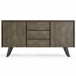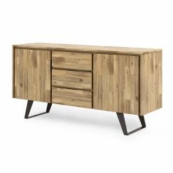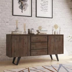 Elevate modern dining with the clean lines of the Brooklyn & Max Fulton Modern Industrial Sideboard Buffet handcrafted from Solid Acacia Wood and Metal. The refined design provides generous storage behind drawers and doors with hidden self-pulls, creating a streamlined look. Metal legs provide a mixed-material accent. Each door conceals an adjustable shelf, and has the look of a modern industrial design to your dining area.
