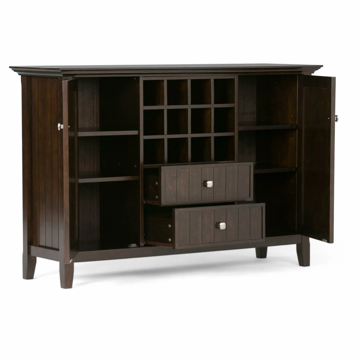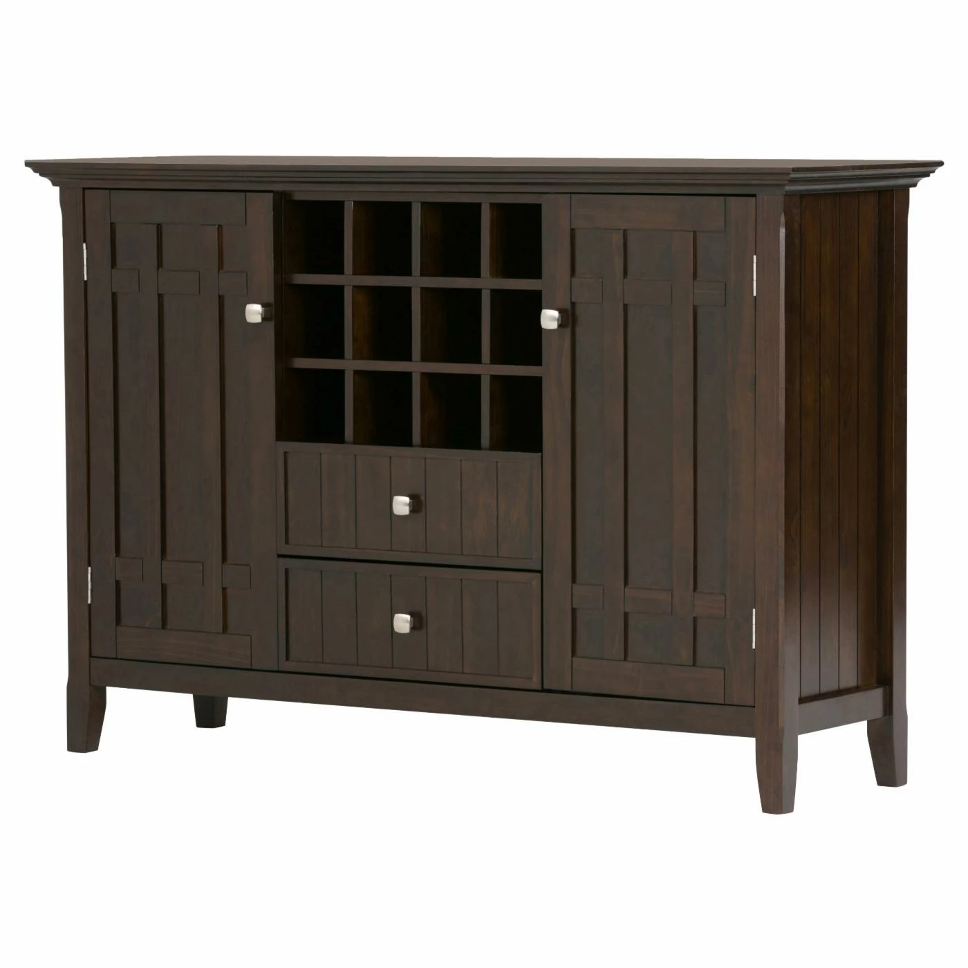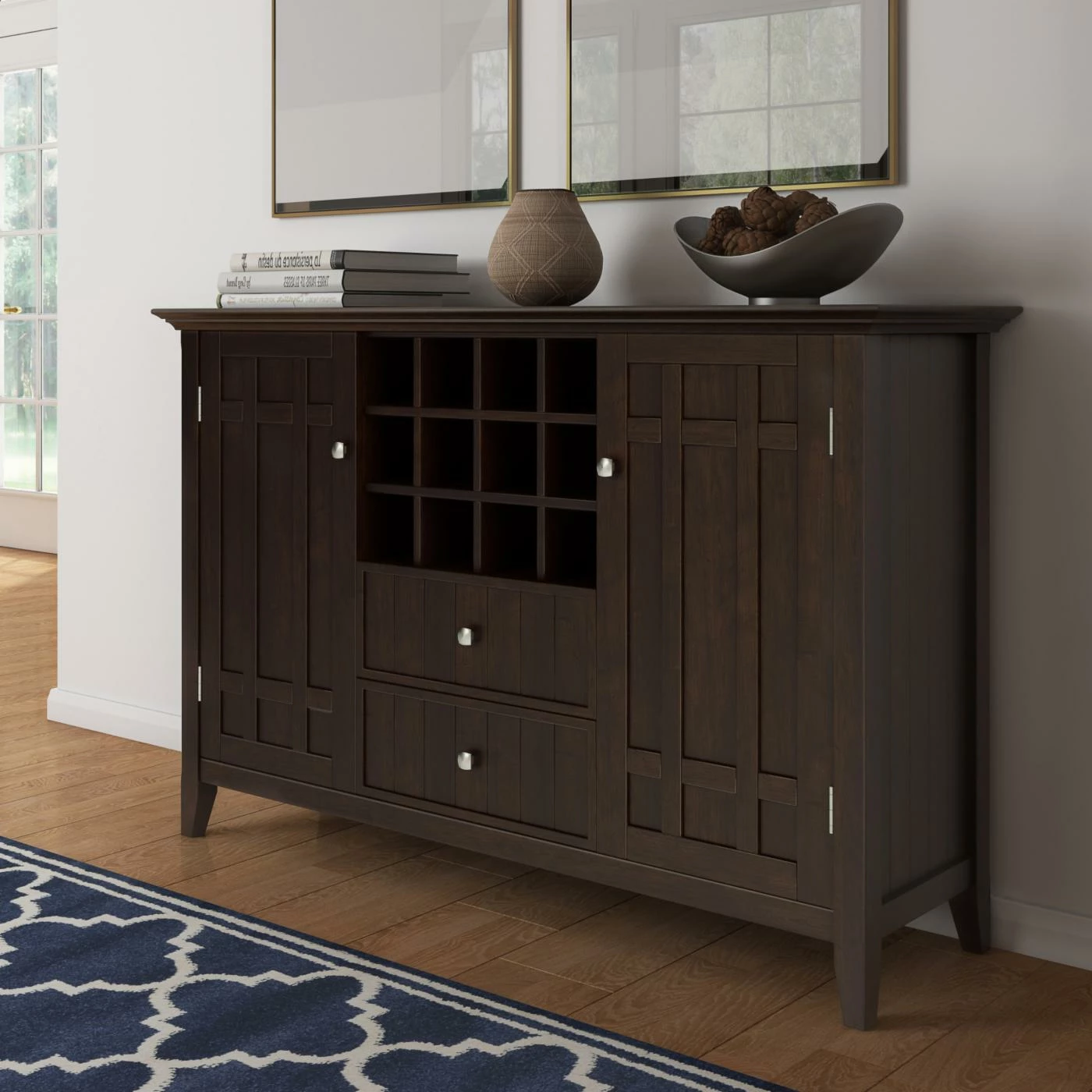 Dark and handsome, the Brooklyn + Max Hampton Pine Wood 2 Drawer Buffet Credenza with Wine Rack is a wine-lover’s dream. Perfect for any dining space or kitchen with its choice of finish, this sideboard features a 12-bottle wine rack storage in the center. Beneath are two drawers, while the two side doors each have two shelves behind for enclosed storage. The solid panel doors have cross-hatch style mullions to complete the look.