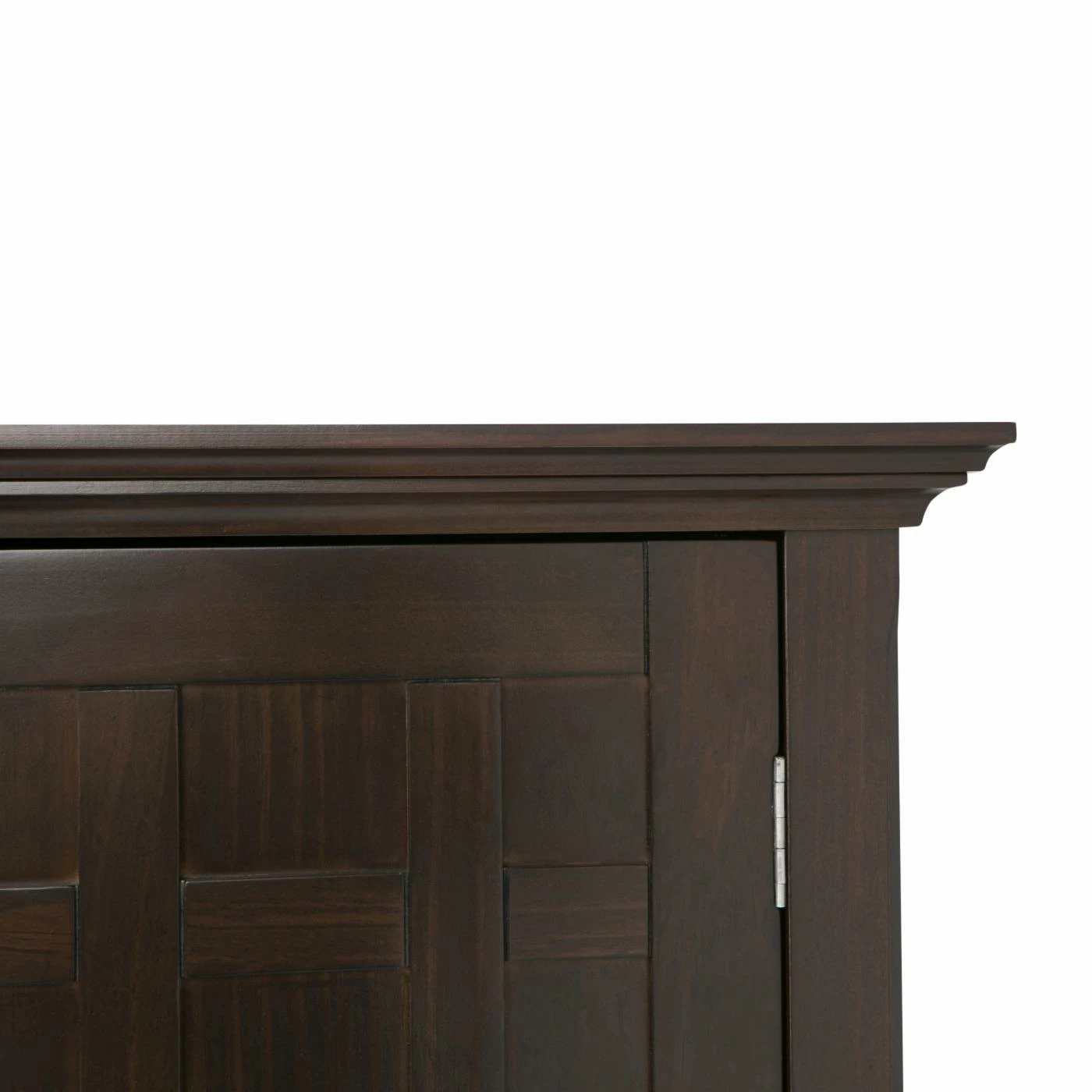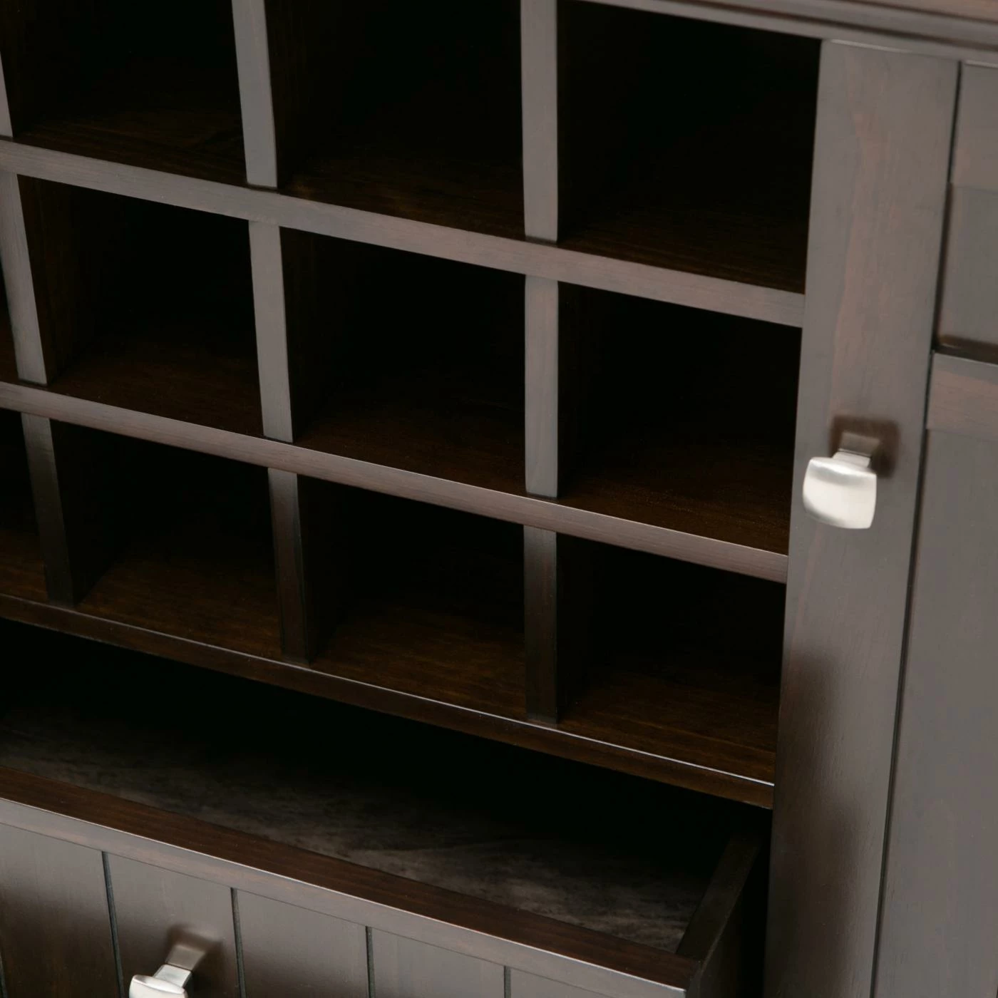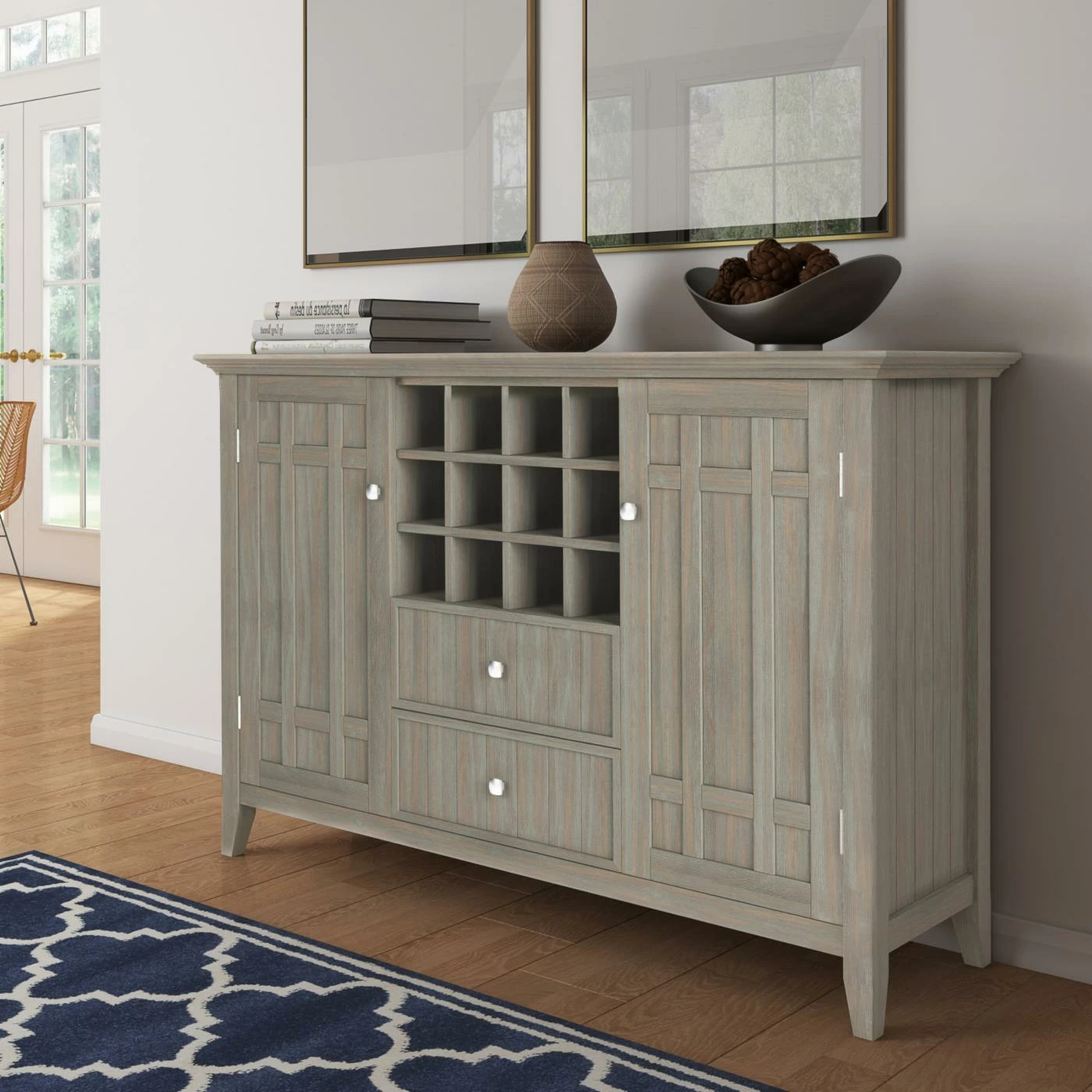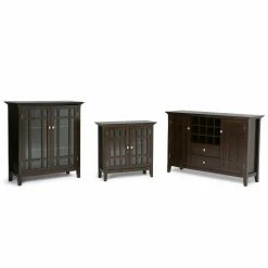 Dark and handsome, the Brooklyn + Max Hampton Pine Wood 2 Drawer Buffet Credenza with Wine Rack is a wine-lover’s dream. Perfect for any dining space or kitchen with its choice of finish, this sideboard features a 12-bottle wine rack storage in the center. Beneath are two drawers, while the two side doors each have two shelves behind for enclosed storage. The solid panel doors have cross-hatch style mullions to complete the look.