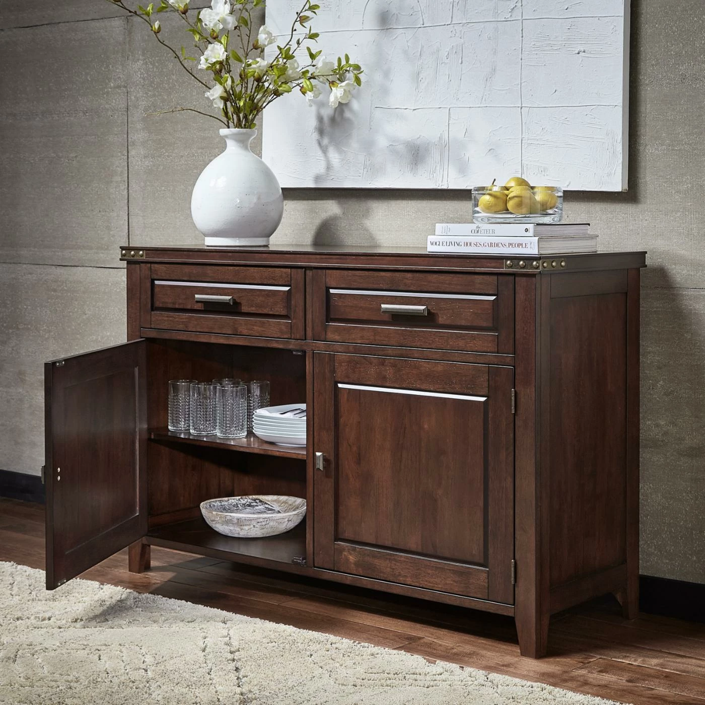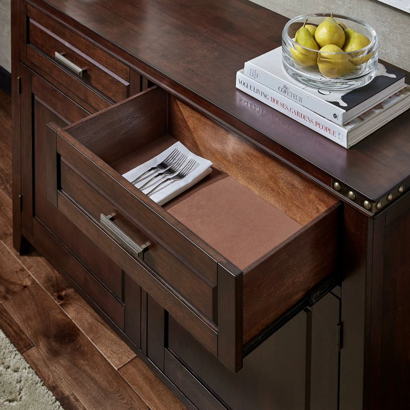 Store serving dishes and flatware in the A-America Carter Server. This buffet table is durably constructed from kiln-dried rubberwood and finished in a rich tobacco brown color. Two cabinets with interior shelves and two drawers are equipped with metal hardware.