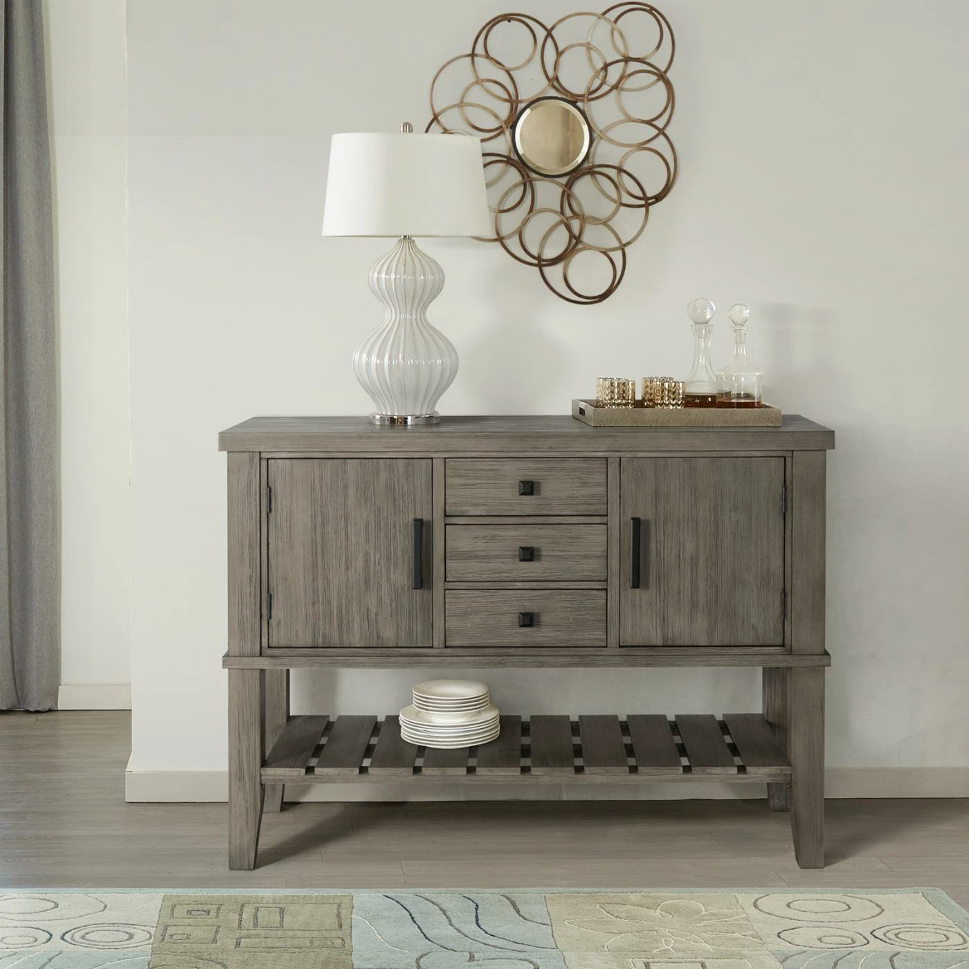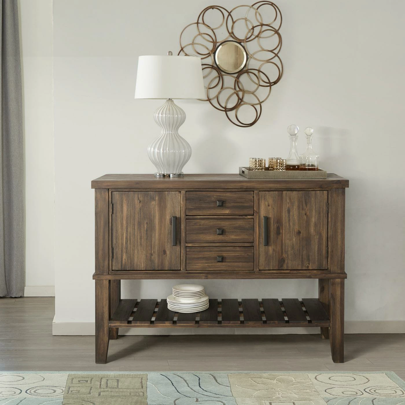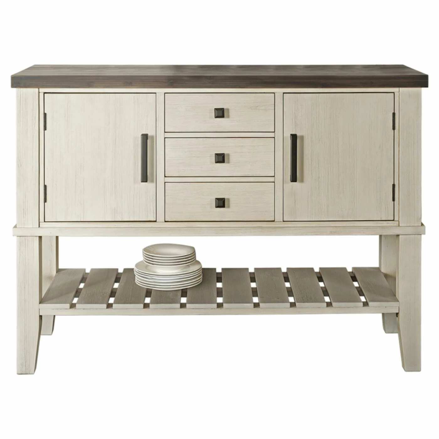 The A-America Huron Server brings functionality and transitional style to your dining space. Crafted from kiln-dried solid acacia hardwood and featuring a 16-inch butterfly leaf, this server is available in your choice of available finish option. The Huron server features three drawers fit for silverware and serving utensils while two large cabinets anre ideal for storing tablecloths, placemats, and napkins. Tapered square legs lend added stability while a lower slatted shelf allows for ample open storage for plates and bowls. This server requires some simple assembly and is covered by a manufacturerβs limited 1-year warranty.