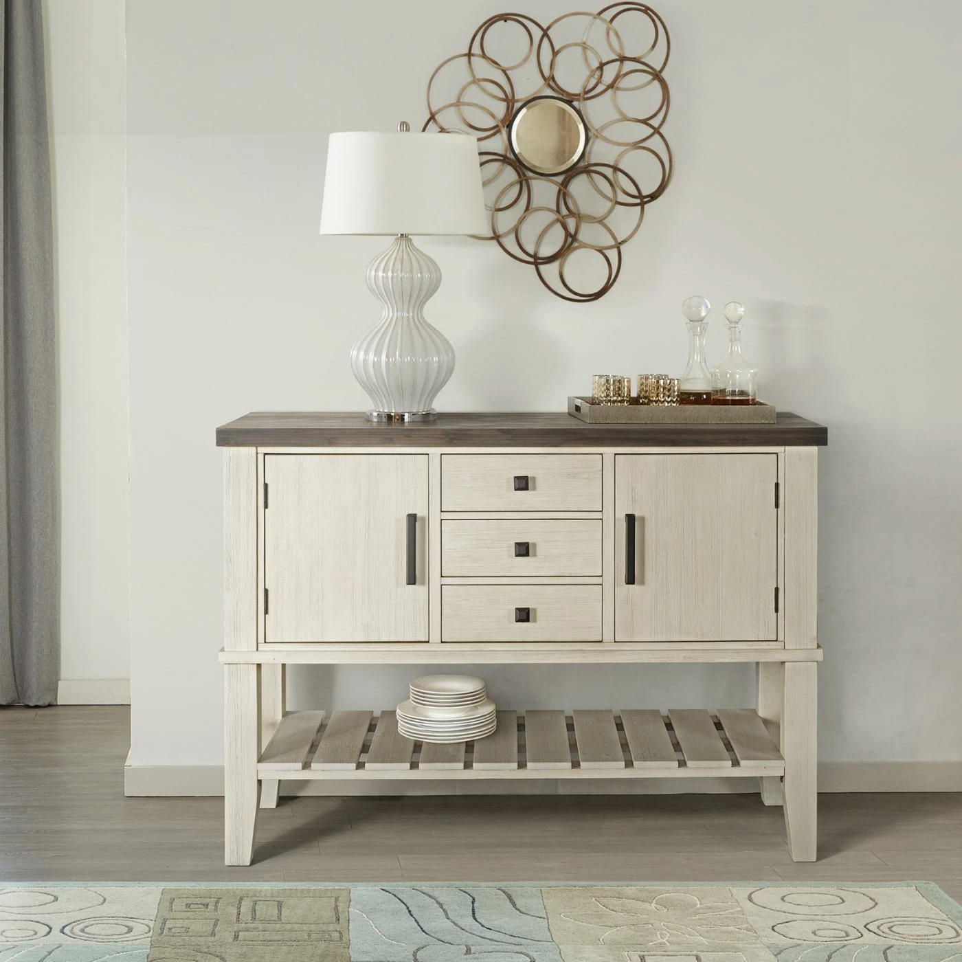 - Lower slatted shelf lends ample open storage
