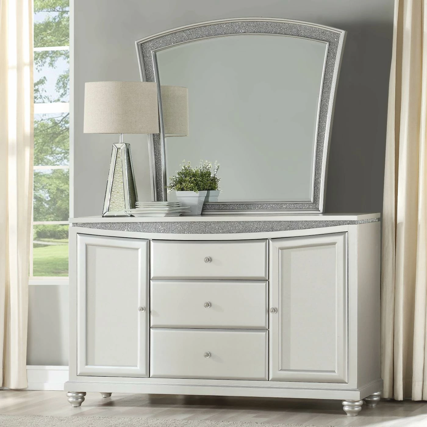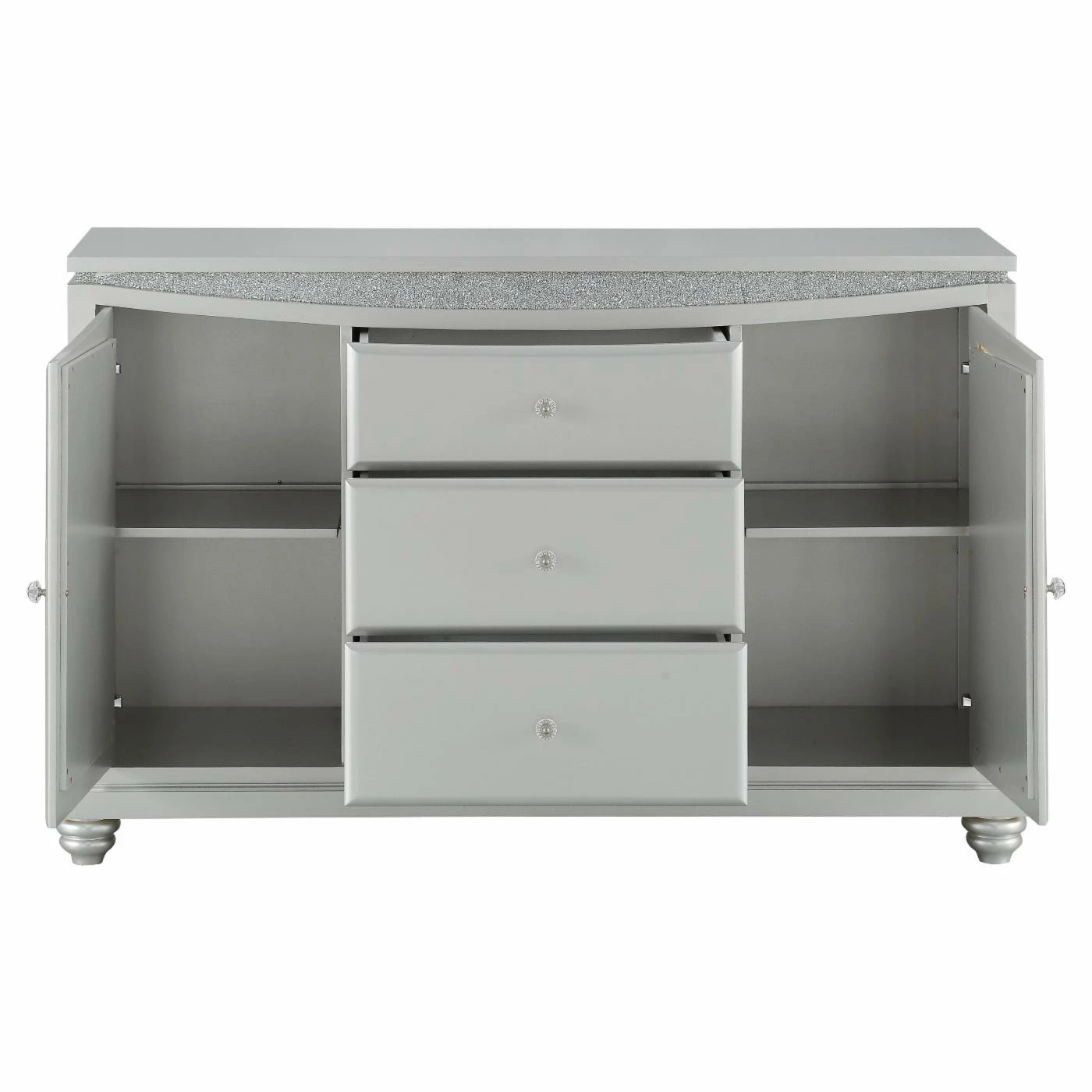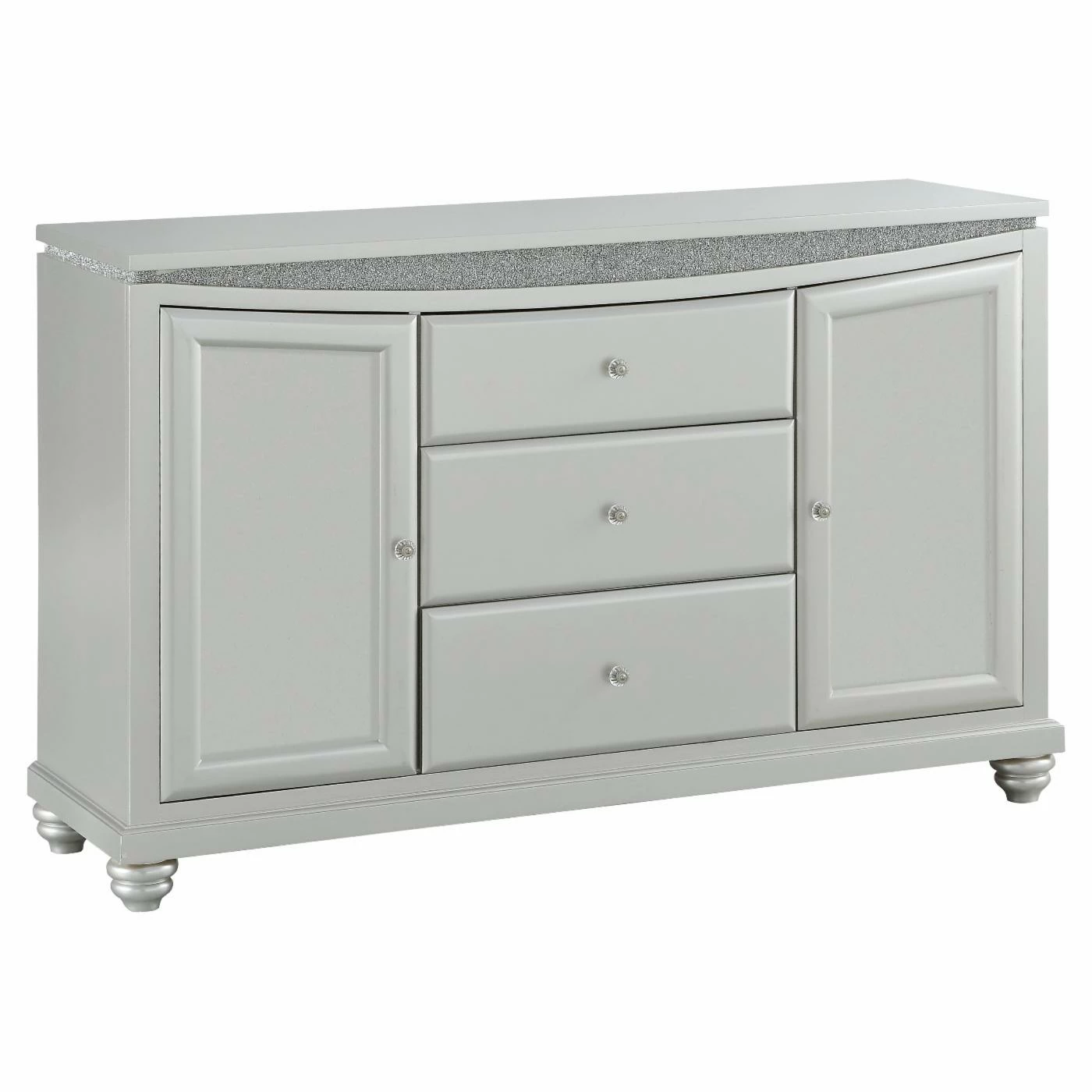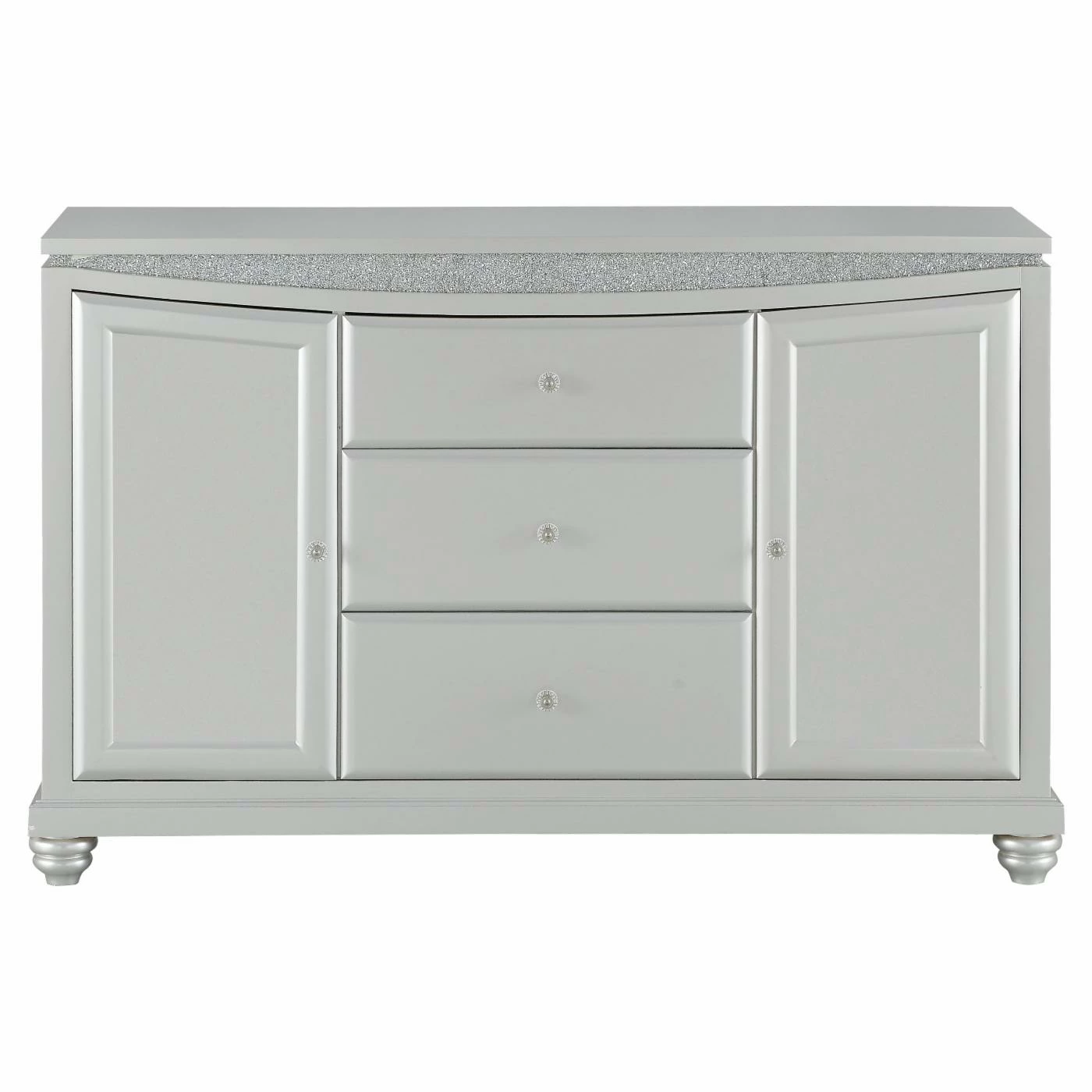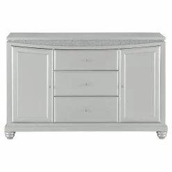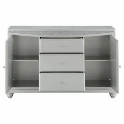 Make your dining room the centerpiece of your home with the Acme Furniture Maverick Dining Buffet Server with Optional Mirror. This unique server features a platinum finish with sparkling rhinestone trim resting on bun-turned legs that is both elegant and inviting. This beautiful server has two cabinets with doors and an additional three drawers, providing plenty of storage and display options. The optional curved mirror features a beveled edge with a sparkling rhinestone inlay a luxurious platinum finish. This server is a welcome addition to any dining area.