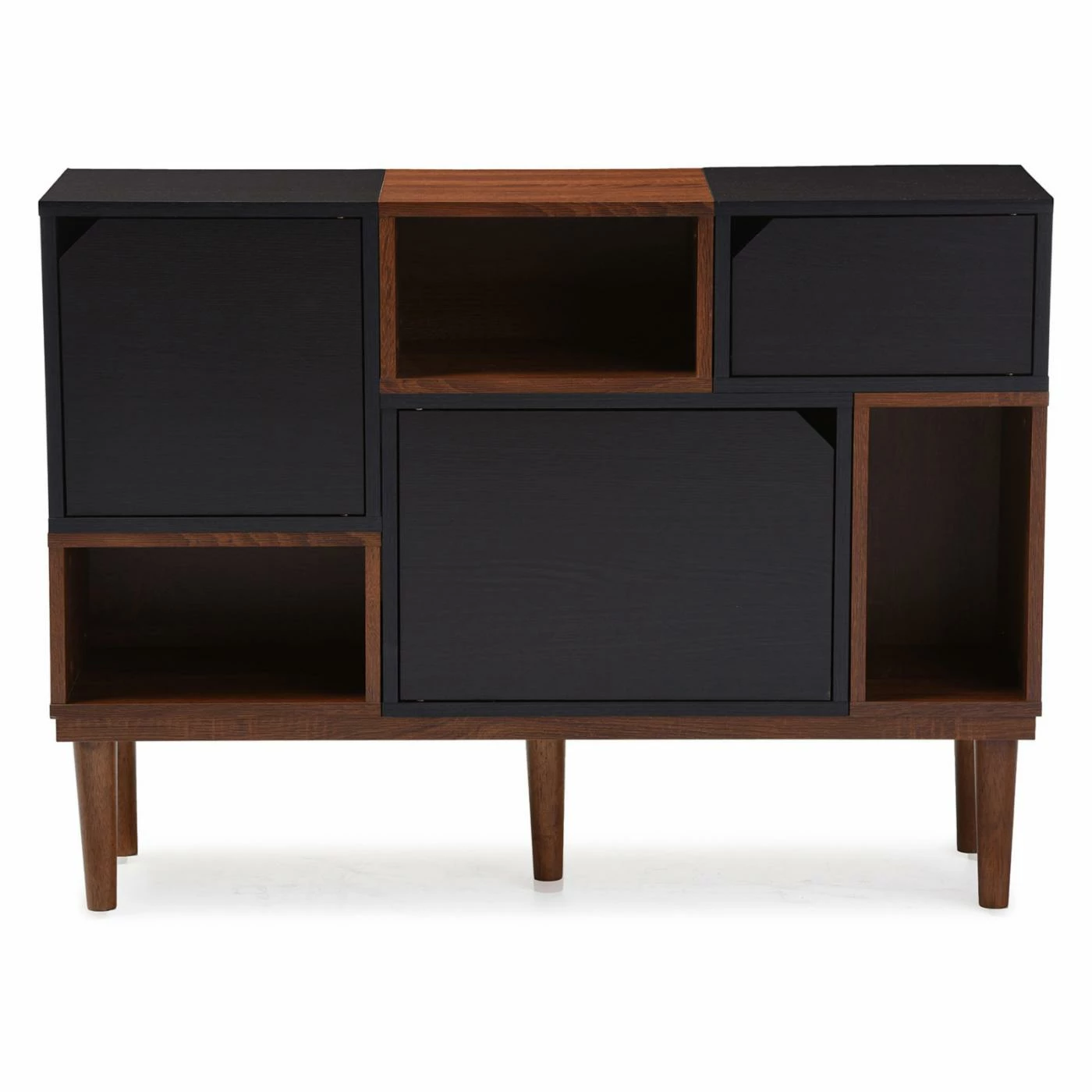 With its two-tone black and dark brown polyurethane veneer finish and round legs, the Baxton Studio Anderson Sideboard Cabinet brings a retro vibe to living rooms, dining rooms, and entryways. The solid rubber wood and engineered wood cabinet provides the perfect balance of open and closed storage with three cubbies and three cabinet doors. Magnetic latches ensure you can quickly access whatever is stored inside.