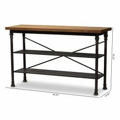 Add attractive storage space to your kitchen with the Baxton Studio Velera Vintage Kitchen Storage Shelf Unit. This shelf unit features a tabletop finished with distressed ash veneers. It is durably crafted with engineered wood. Store kitchen essentials or display dΓ©cor on the two lower, metal shelves. The legs and metal shelves are finished in a rich dark bronze. Simple design and distinct details give the shelf unit a chic, industrial feel. Update your kitchen with this convenient and stylish shelf unit.
