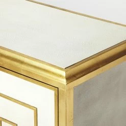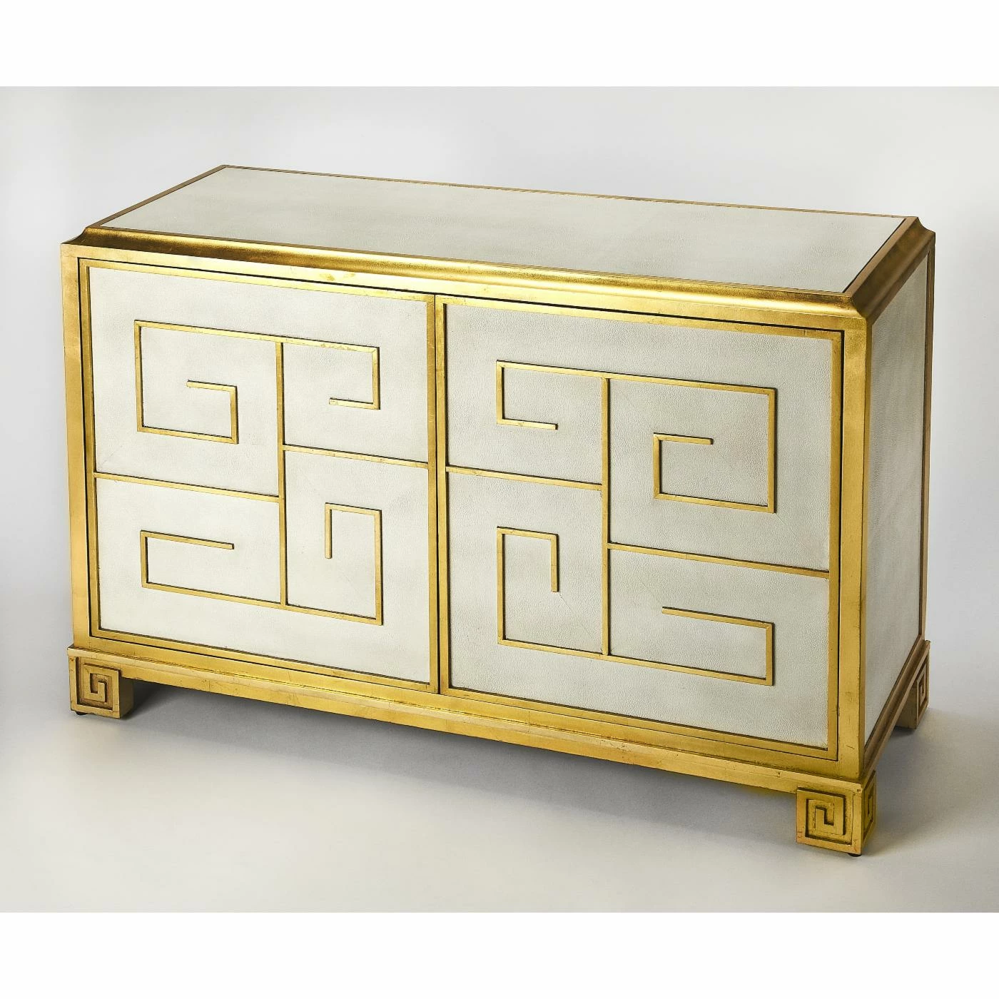 Ancient style arrives to organize your seasonal dΓ©cor, fine china, and serving dishes with the Butler Specialty Bello Leather Console Sideboard. The two click-open cabinet doors hide one long shelf for all of your items. The outside is where the fun begins with the white and gold finish and intricate geometric design. The block feet match the design for a cohesive look in your home. This sideboard is constructed from gemelina wood solids with maple veneer and stingray leather.