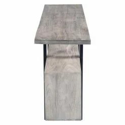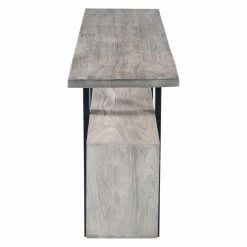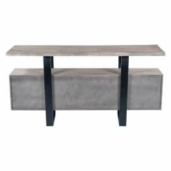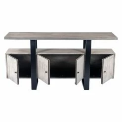 A unique design arrives to organize your dining area, living room, or entryway with the Butler Specialty Raitis Sideboard. The spacious top may be used to decorate for the season while the long middle shelf may hold books, plants, or baskets. Open the four cabinet doors by their black finished, round handles to store your seasonal decorations, extra dinnerware, or table settings. The double leg design comes in a square shape that holds up the top of this sideboard. It is constructed from durable acacia wood and iron with a two-tone finish of gray sandwash and black.