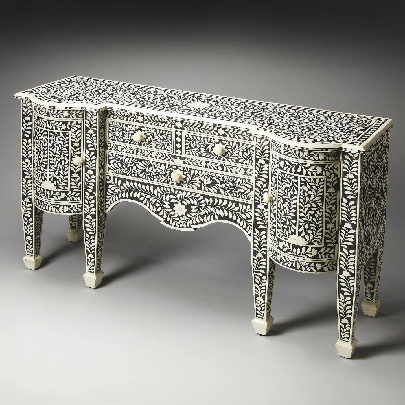 The Butler Specialty Victoria Buffet features stunning artistry and craftsmanship. The finish on this handsome buffet isn’t painted. It’s hand-placed bone inlay that are individually formed and applied. We’re not even joking. The body is crafted from MDF and features three pull-out drawers with a pair of interior storage cabinets covered by curved doors with matching floral knobs.