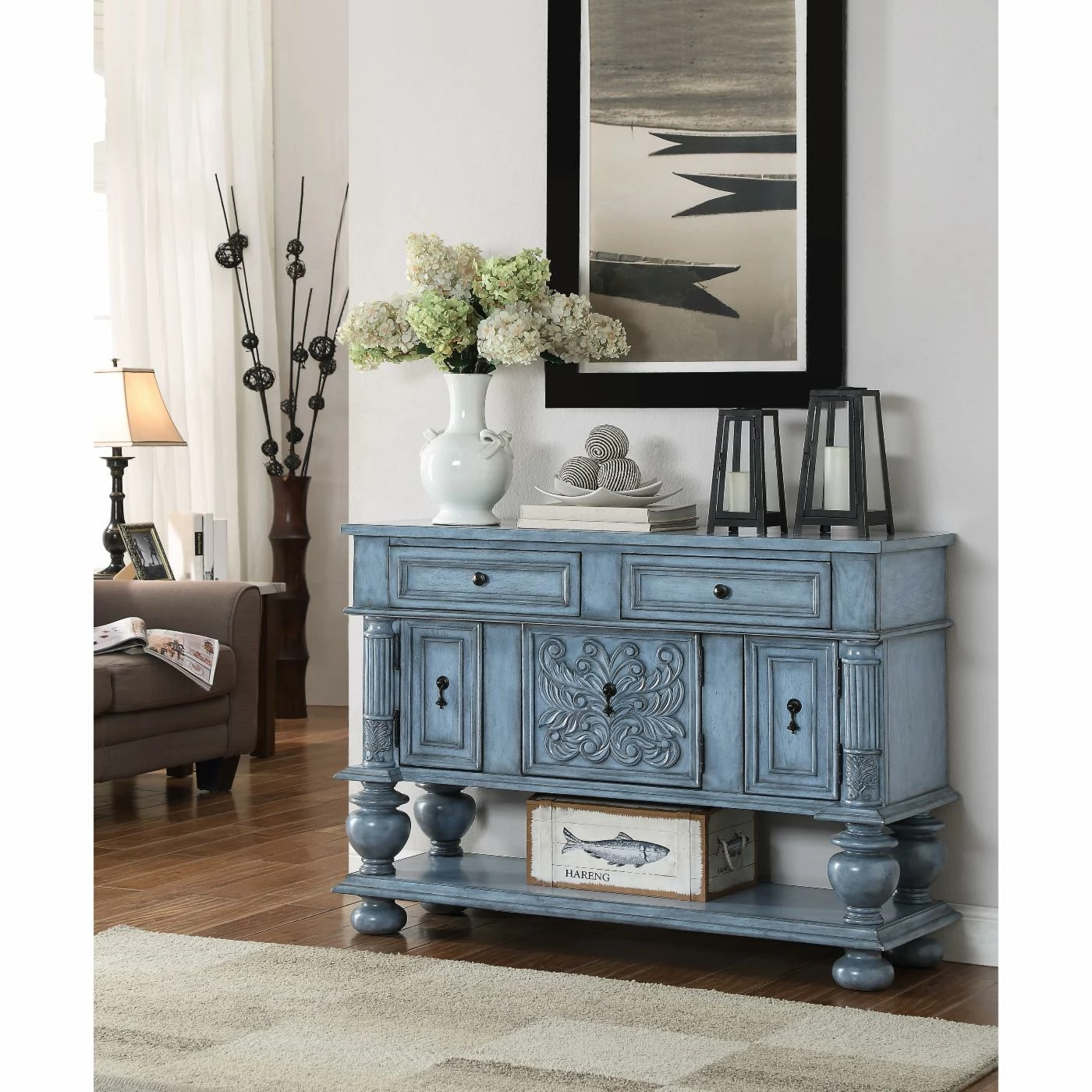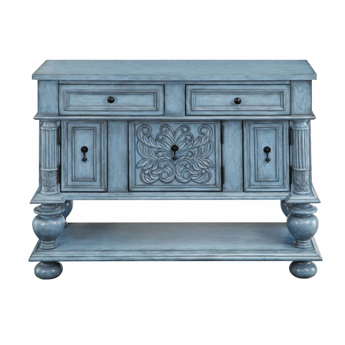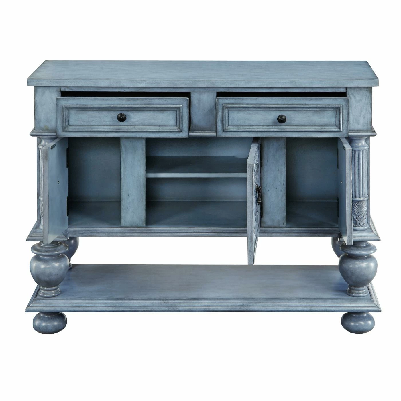 Revel in the ornate beauty of the Coast to Coast 3 Door 2 Drawer Sideboard. Poplar hardwoods and lightweight engineered wood with walnut veneers make up the frame. Turned bun feet elevate this sideboard, which features two drawers and three doors. Carved side columns balance the carved acanthus design on the center cabinet door. Four urn pedestals stand atop the stretcher base providing an additional storage or display area. A burnished blue finish and acorn teardrop pulls make this piece an heirloom-worthy addition to your kitchen or dining room.