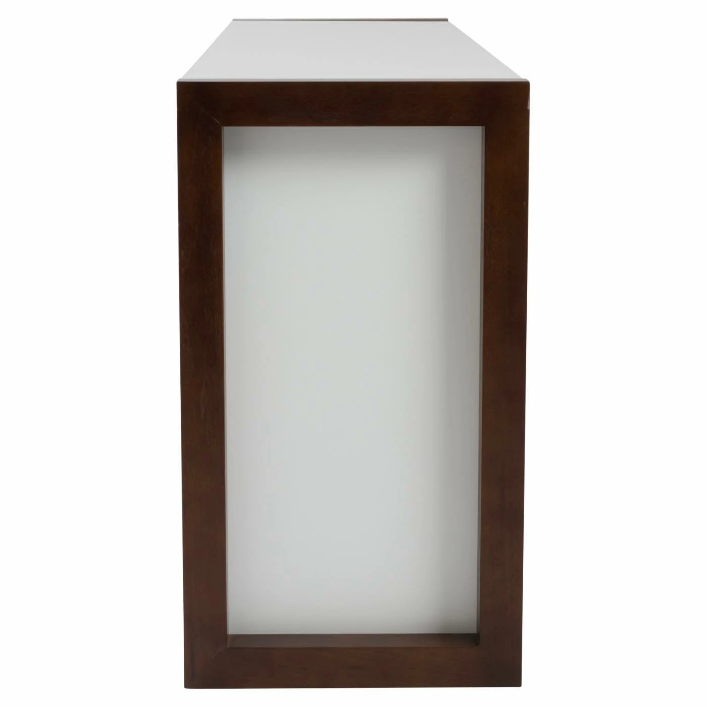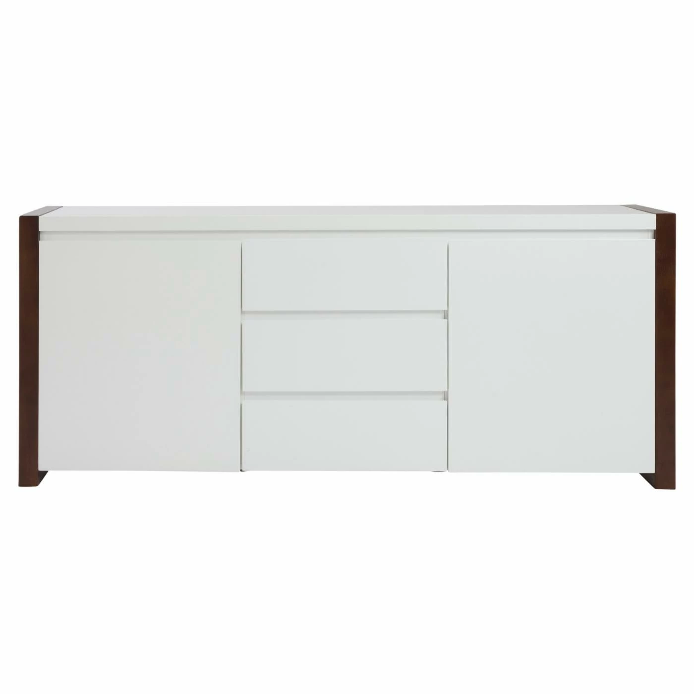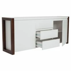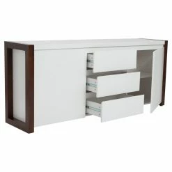 Organize your dining accessories in style with the Euro Style Manon Sideboard – White/Dark Walnut. Made of durable wood, the clean, contemporary style of this sideboard features a white finish. An accenting dark walnut finish graces the ends of this piece adding a contrasting look and feel. This sideboard has three wide center pull-out drawers and large storage compartments on the left and right side. Store dish plates, bowls, glassware, and silverware neatly within this stylish entertainment piece.