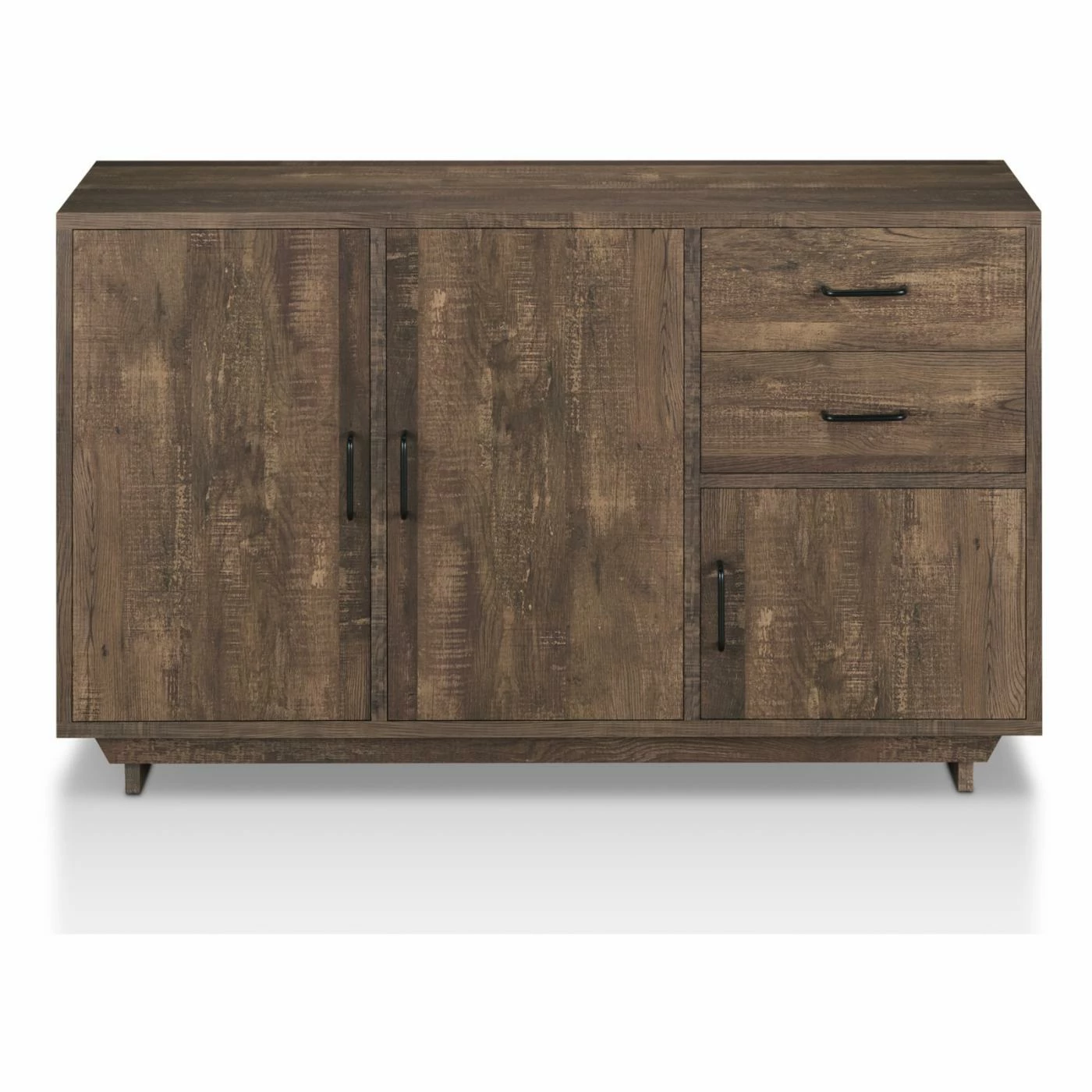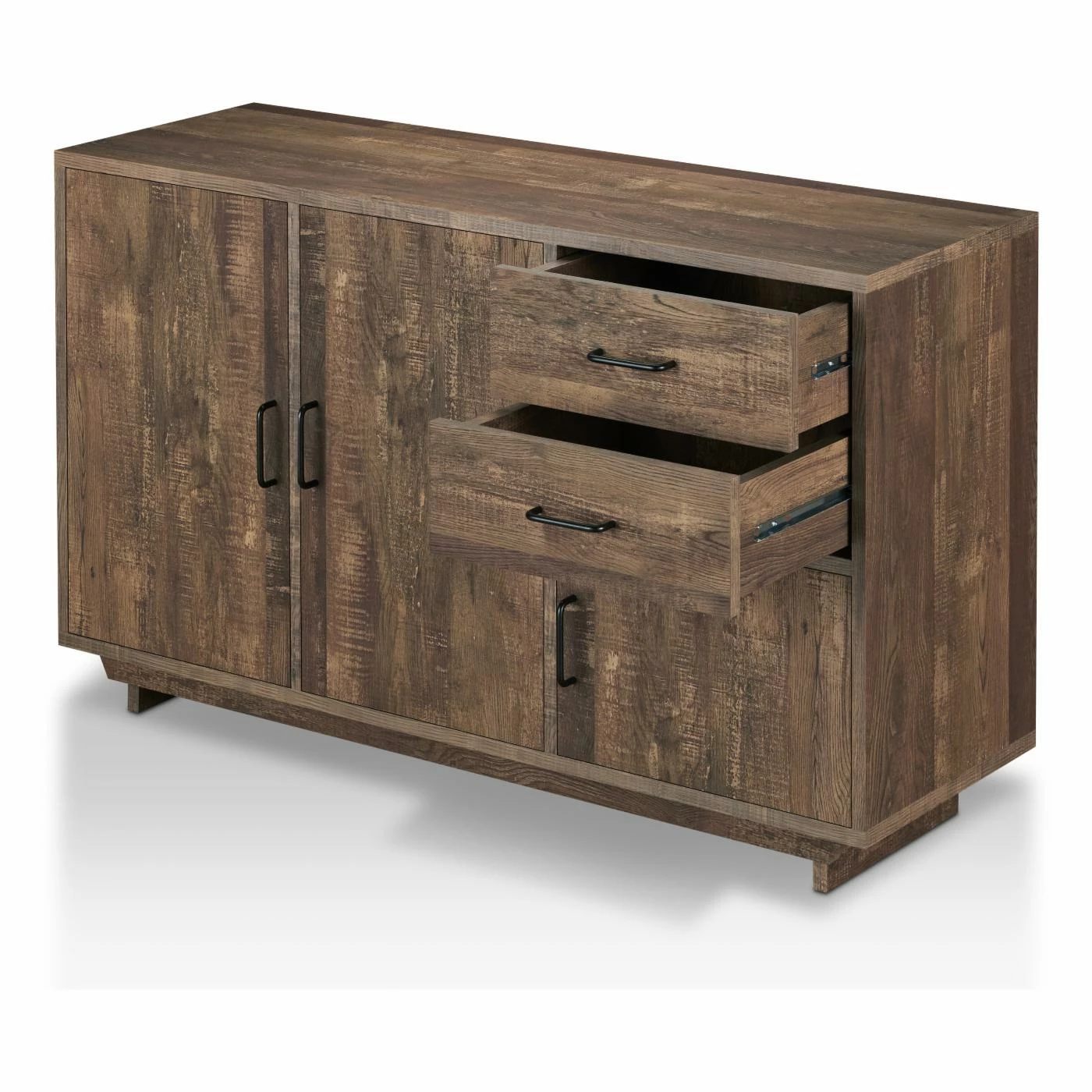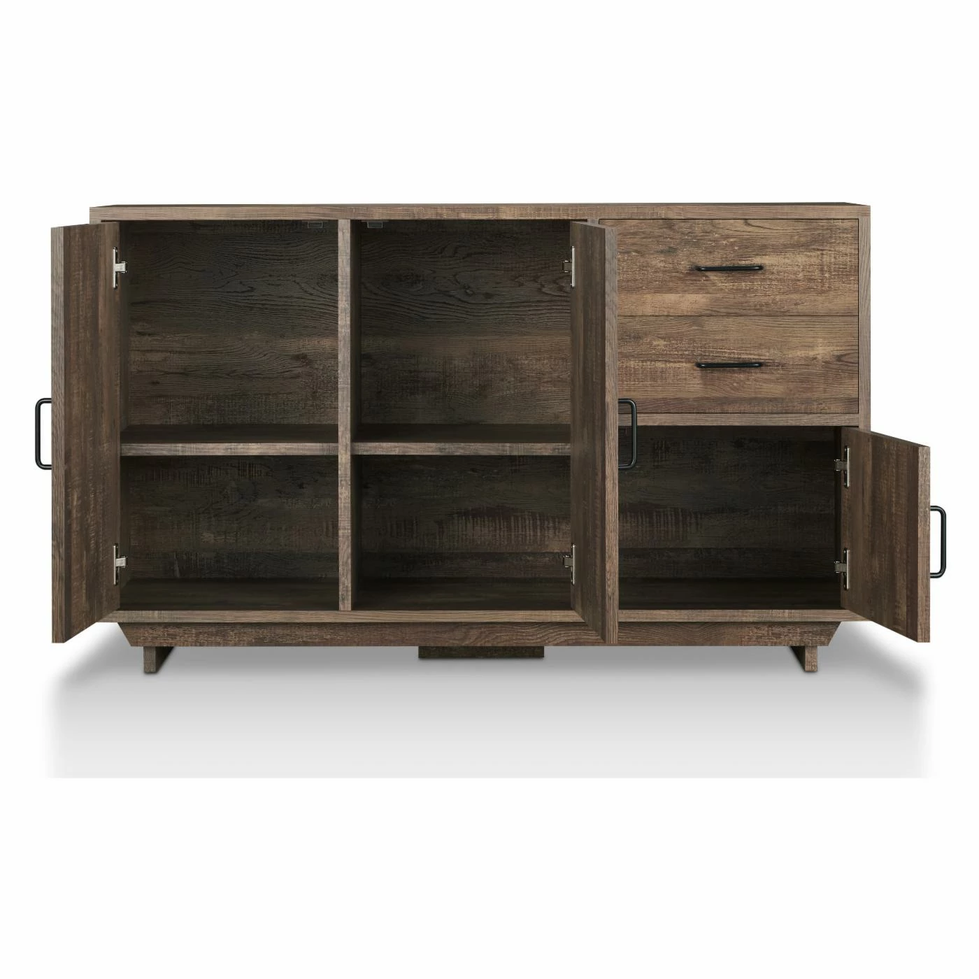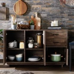 The HN Home Morley Modern Farmhouse Rustic Buffet Server is a rustic stunner with ample storage space. A natural oak finish highlights the exquisite woodgrain detail in this engineered wood buffet server. Store utensils, drinkware, and more in the two drawers, three cabinets, and five shelves.