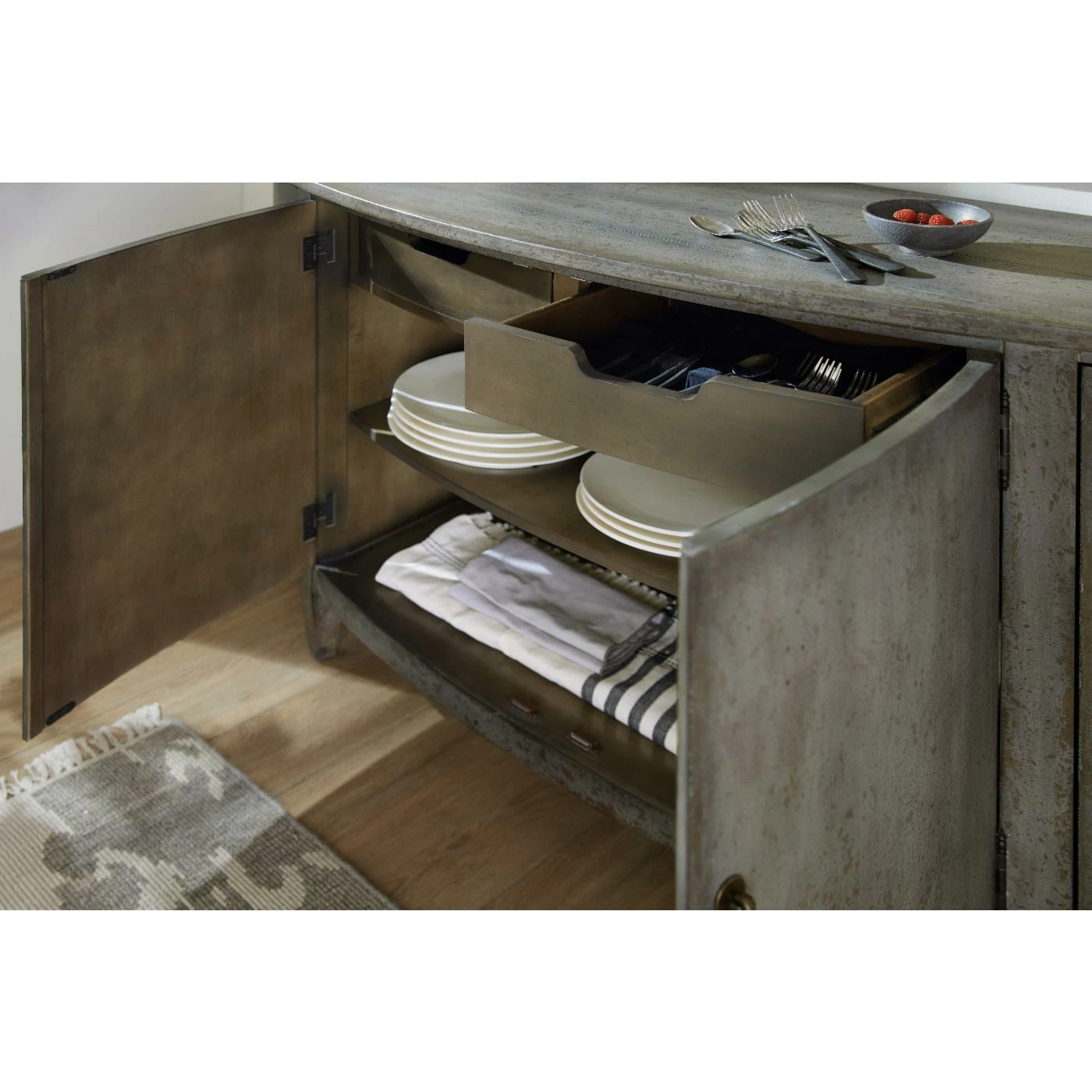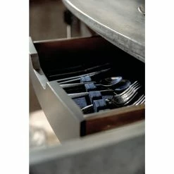 - Drawer have cut-out hand pulls, drop-in felt liners;one with silverware storage