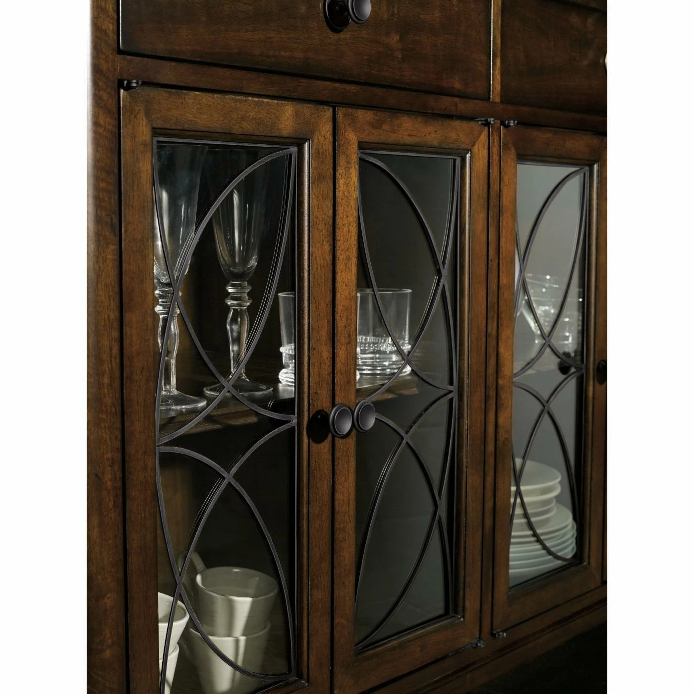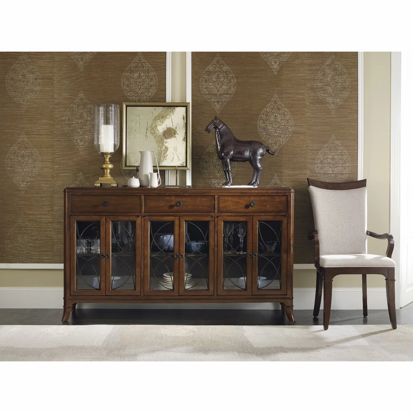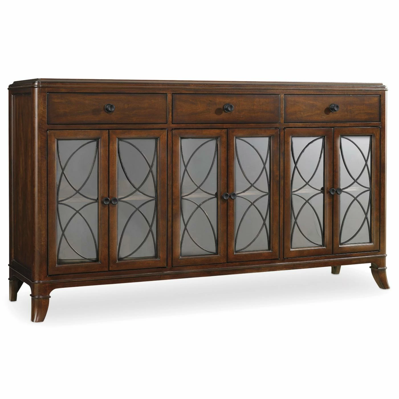 We know you love to entertain, so we recommend the Hooker Furniture Palisade Buffet to make that hobby a little more fun. Complete with adjustable shelving behind each cabinet, this buffet allows you to customize your storage – from tall vases to stackable platters. Each of the drawers features dovetail construction for lasting quality; plus, they all have drop-in felt liners or tray to protect your silver. Construction starts with solid hardwoods and select walnut veneers, then the entire piece undergoes a 16-step finishing process to bring out the wood grain details for a rich, unmatched color. Metal fretwork and understated hardware complete this buffet. Assembly required.
