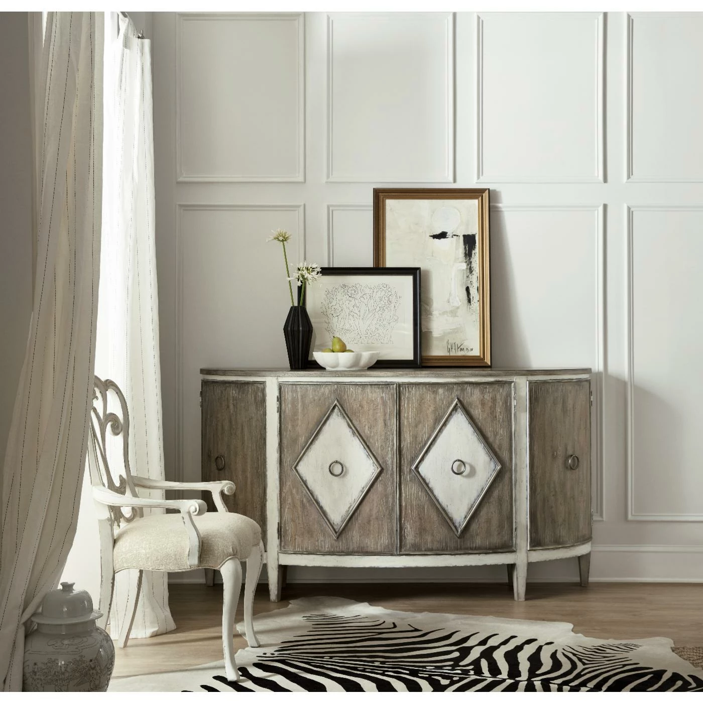 - One drawer behind pair of center doors