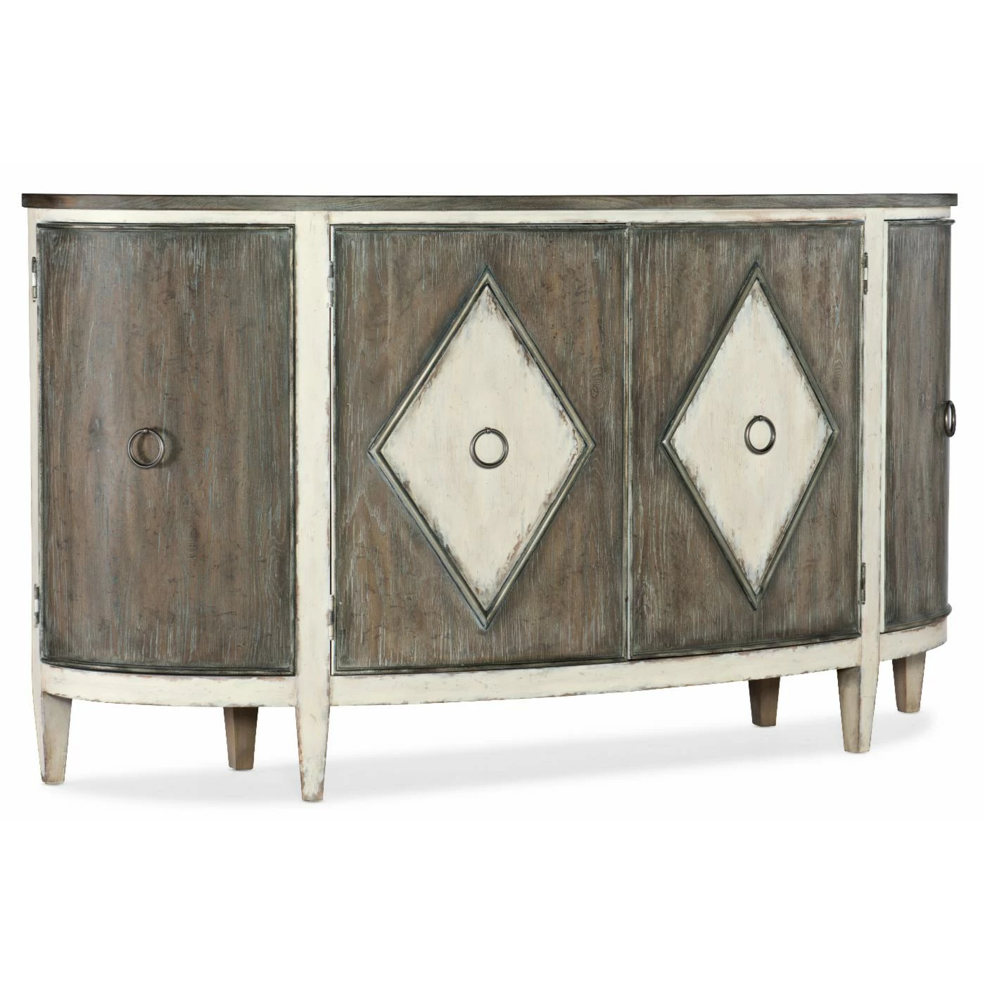 - Distressing includes drawknife, wormholes;stoning. Antique silver colored metal alloy ring pulls.
