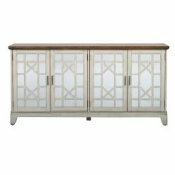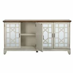 You can use the Kosas Home Jenna 4 Door Sideboard to store your essentials and display some of your favorite items. Perfect in the dining room or living area, this durable sideboard is crafted from hardwood solids and MDF (a dense, warp-resistant engineered wood) with an ivory base and contrasting brown top. The four doors are mirrored to add depth to your room and accented by an ornate overlay that provides visual appeal. The interior features ample shelf space to keep your essentials neatly organized. This versatile sideboard comes complete with wire management, so it can easily double as a TV stand.