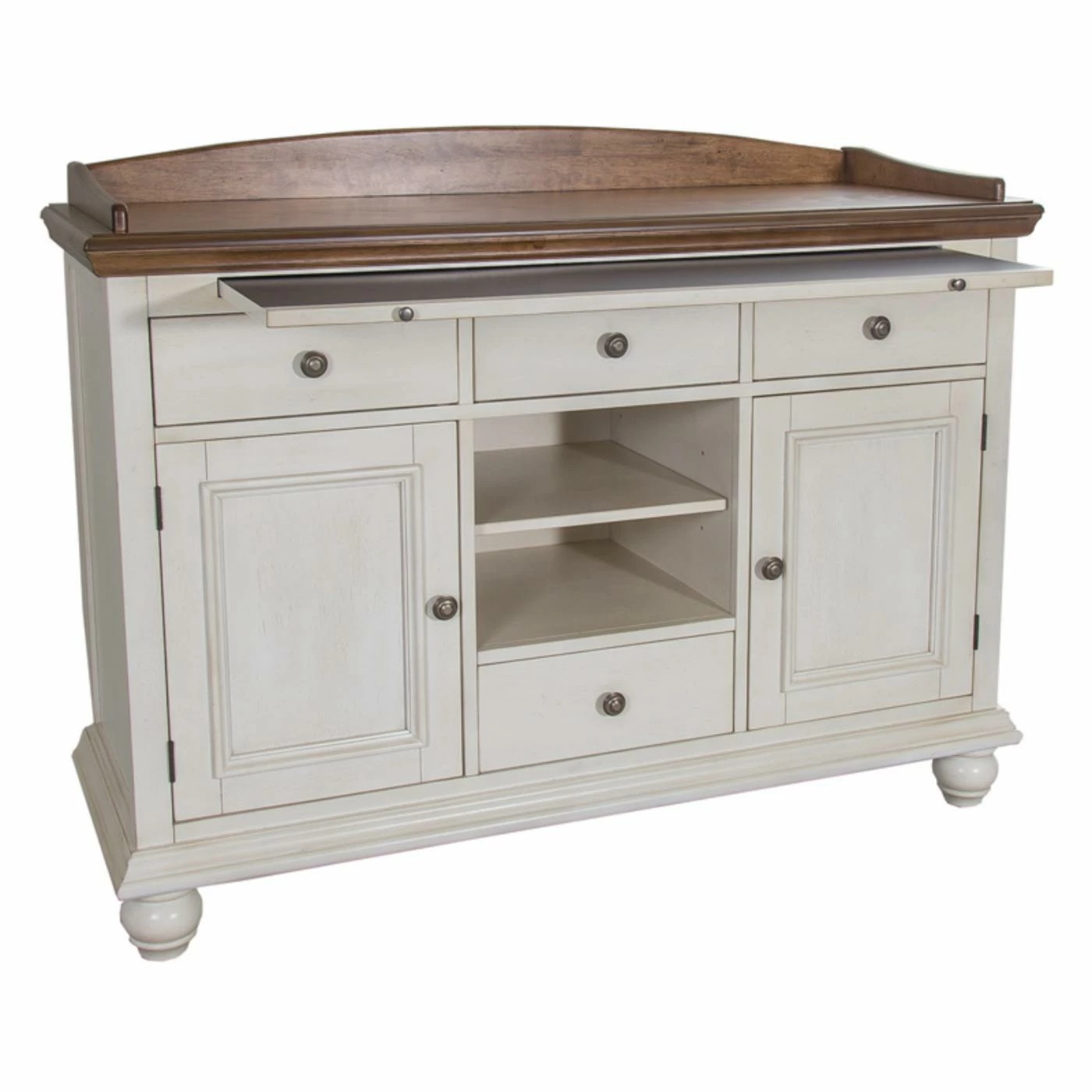 Soft white finishing lends a crisp farmhouse-style charm to the Liberty Furniture Industries Springfield Dining Sideboard. Two cupboards and three drawers let you store dishes and silverware neatly away. Two open shelves let you show off statement dishes. It is crafted from a solid hardwood with rustic oak veneers. The burnished metal hardware gleams gently.