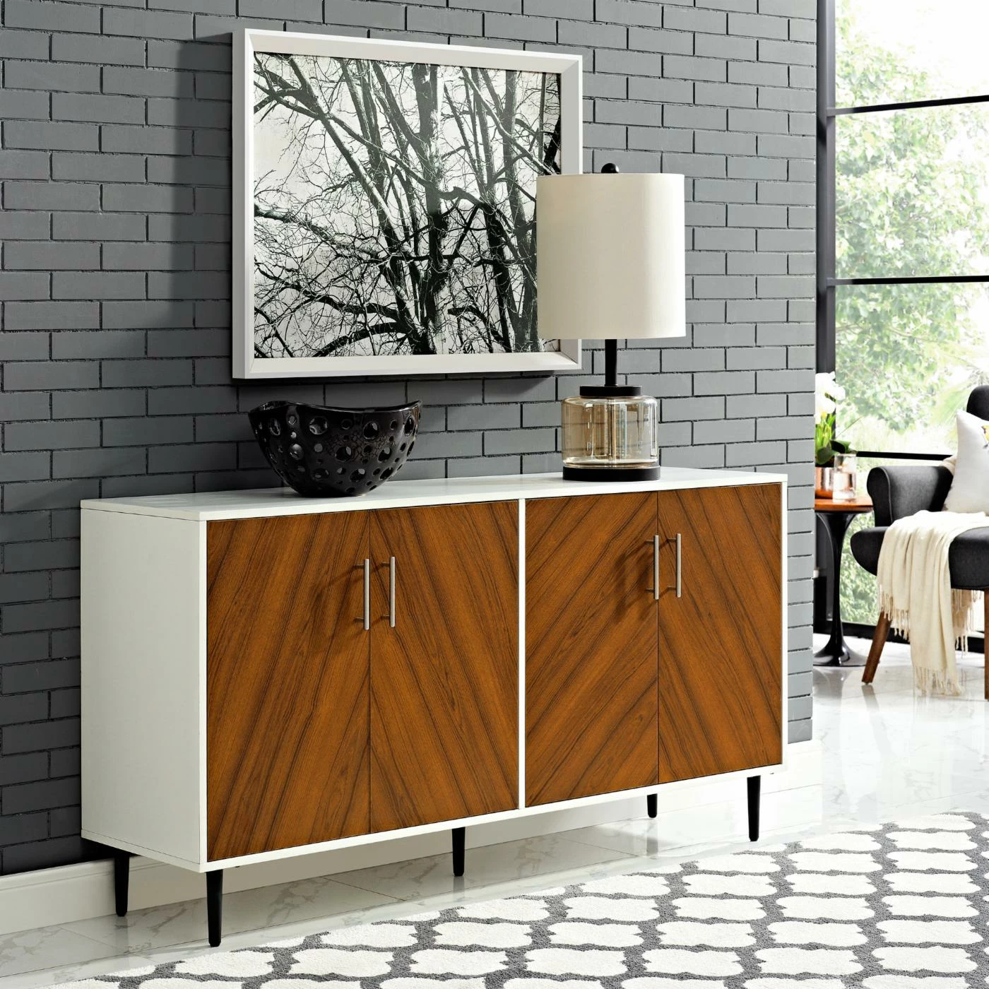 Use the versatile Manor Park 58 in. Modern Bookmatch Buffet to store your china, barware, or extra blankets. Crafted from engineered wood, this buffet boasts a two-tone finish and stands on adjustable rubber feet. The enclosed storage keeps all of your things neat and tidy, while a spacious tabletop offers room to display extra barware, sculptures, and more. Assembly required.