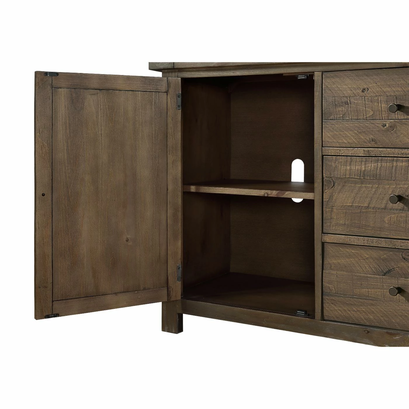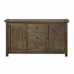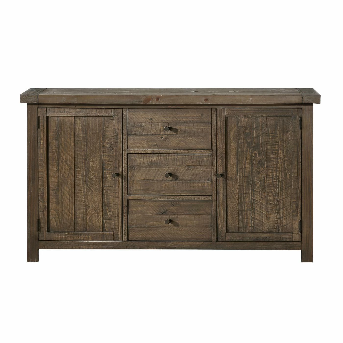 Create industrial farmhouse appeal in your dining area with the Modus Autumn Dining Sideboard. The sideboard is constructed of solid pine wood with a reclaimed distressed look. This features ample storage with a fixed shelf behind each of the 2 doors and 3 drawers with a 50 lb. weight capacity. The flint oak finish adds to the historic farmhouse design.