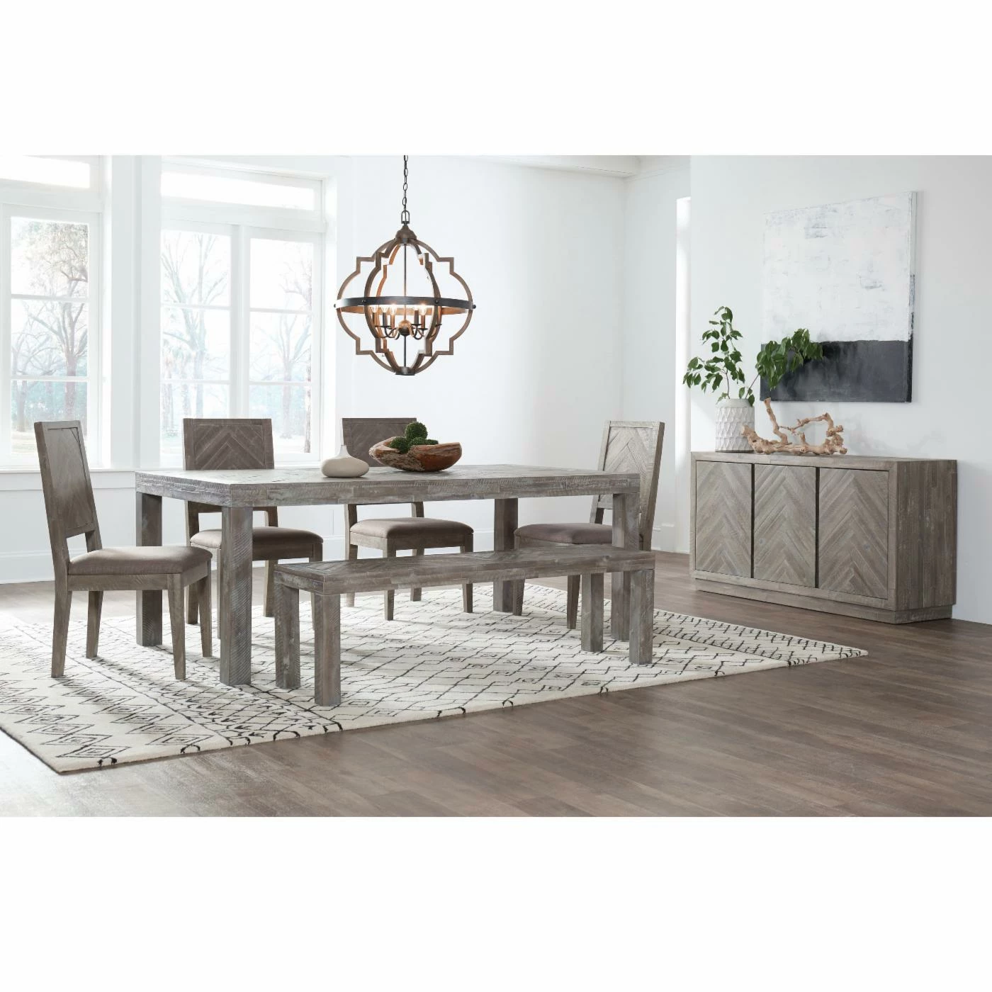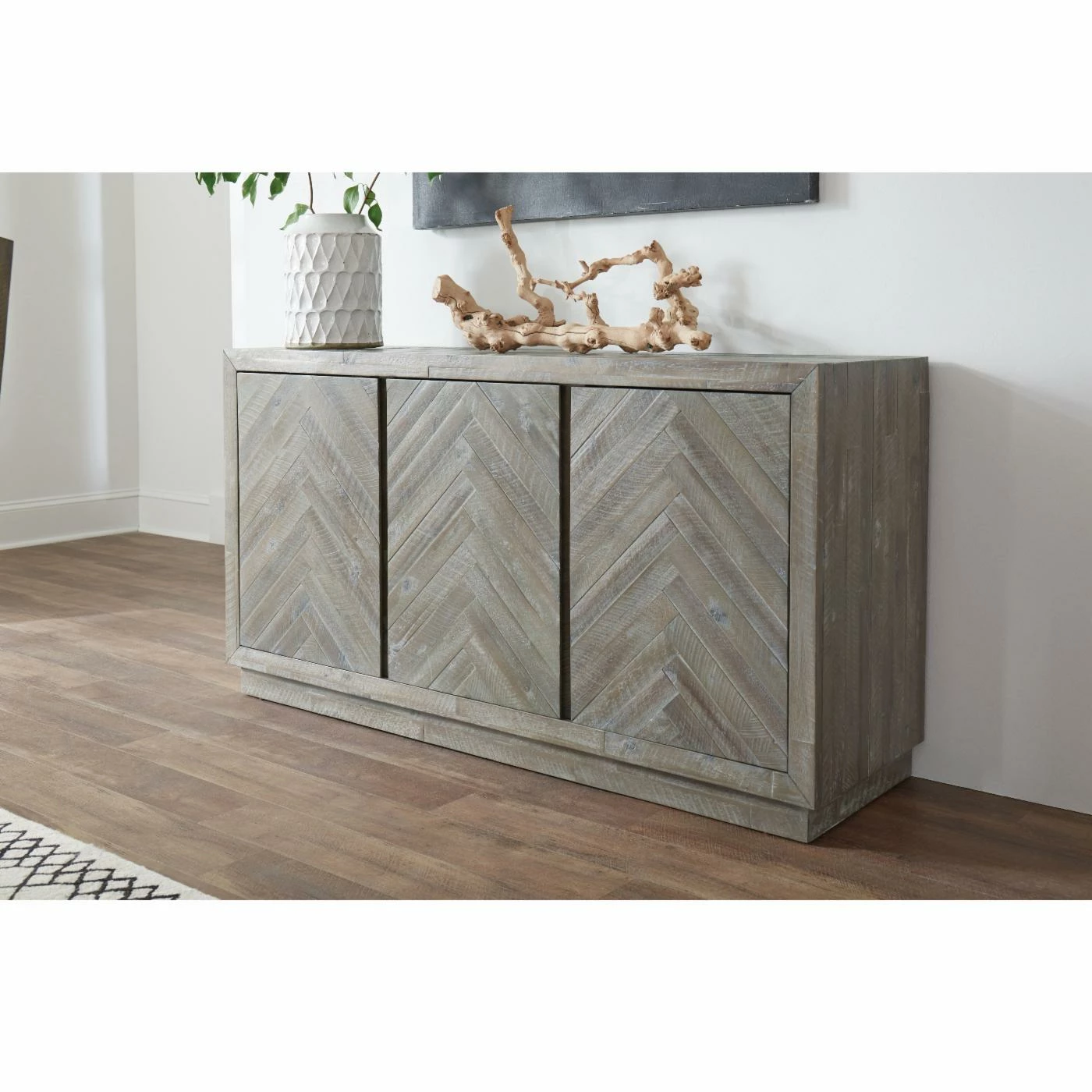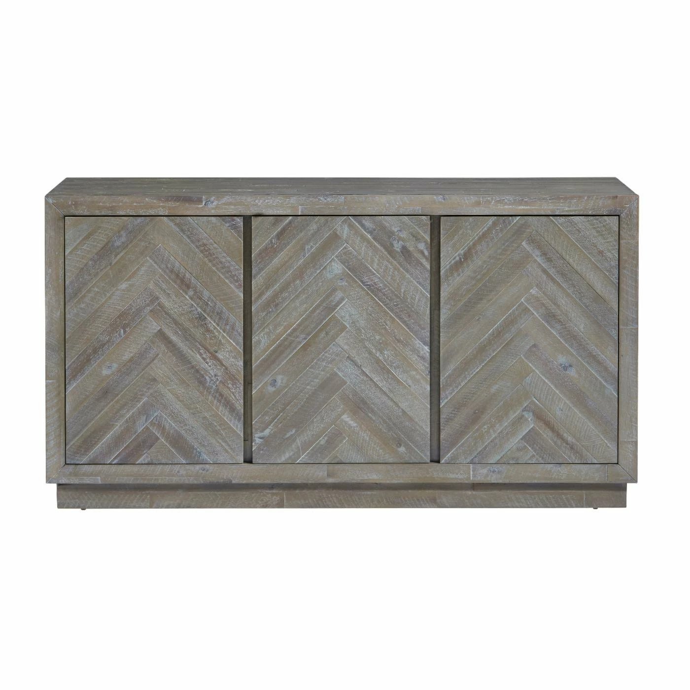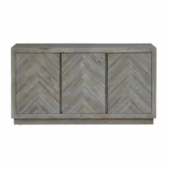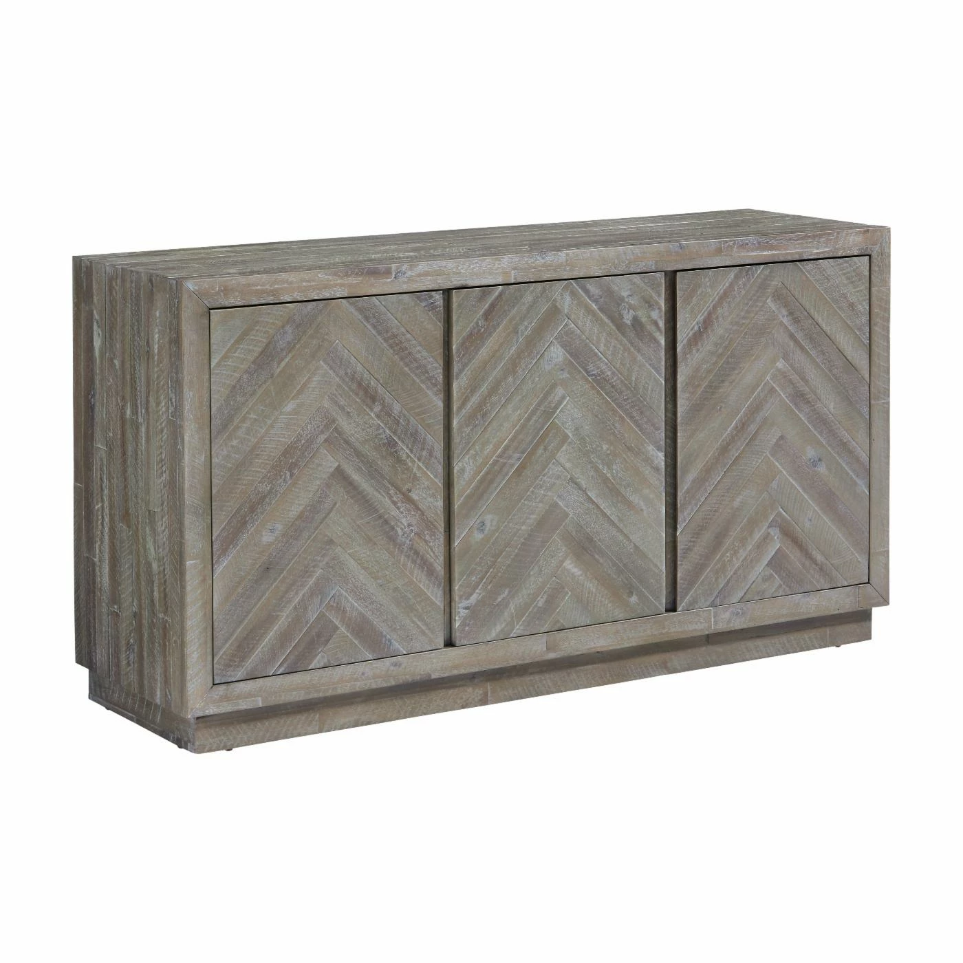 When your dining room storage needs farmhouse style, consider the Modus Herringbone Solid Wood 3 Door Sideboard. This buffet is crafted of acacia wood, and sports a rustic latte finish of varying gray and white tones. The wood pieces give a feeling of reclaimed wood, and are constructed in a herringbone pattern on the doors. There’s plenty of storage behind the three doors, with a total of six shelves inside.