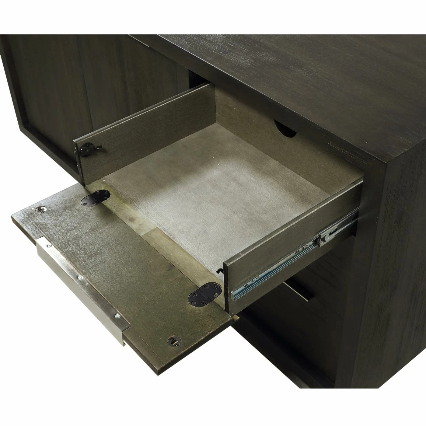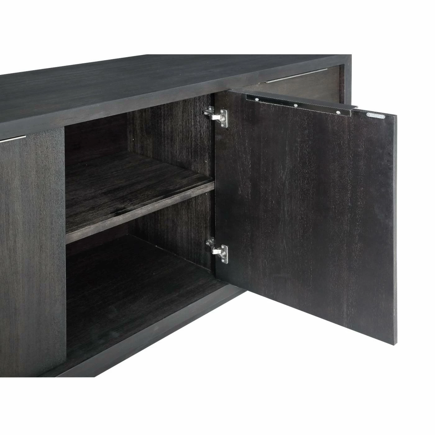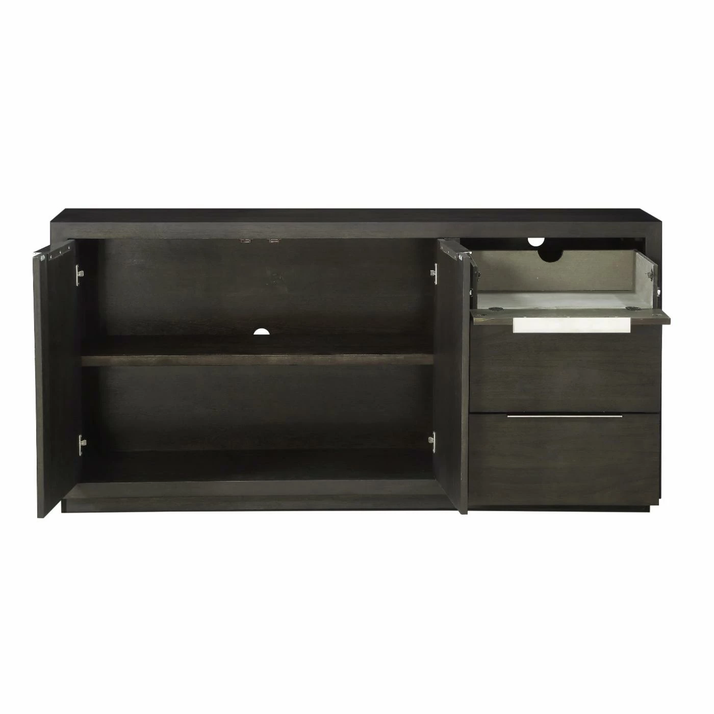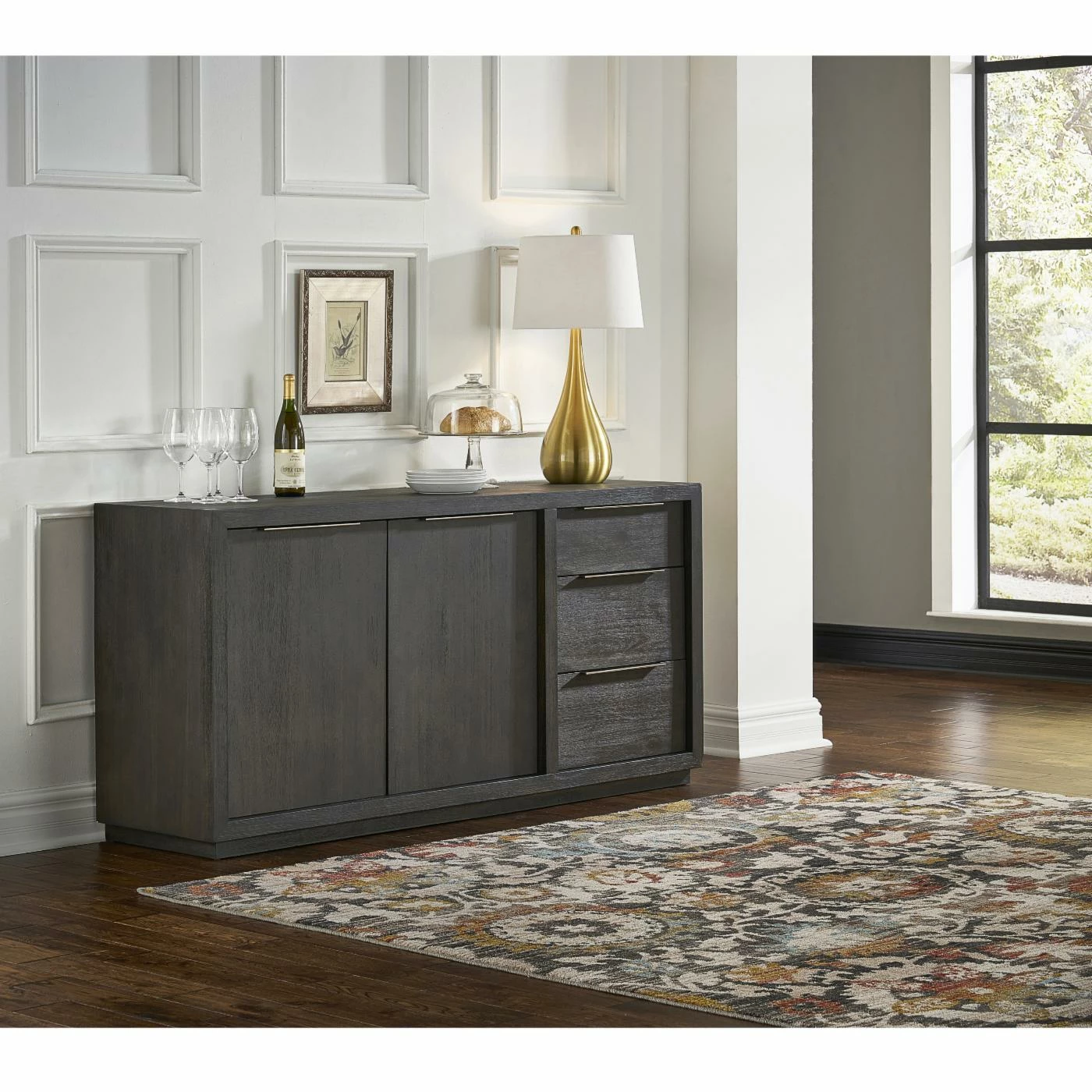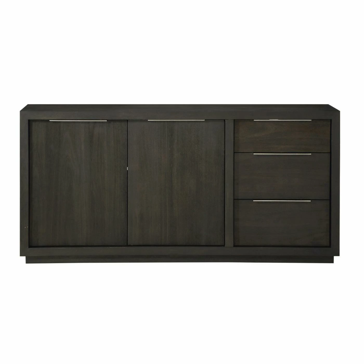 Use the Modus Oxford Sideboard as a buffet in your modern dining room or for added storage in your living area. The sideboard is made of acacia wood and veneers with a weathered basalt gray finish for a hint of rustic style. Store cups, dishes and more in the cabinet with adjustable shelving. Three drawers offer space for flatware and linens – the top drawer has a fold-out front. Sleek lines and floating plinth give this sideboard plenty of modern, minimalist appeal.