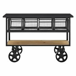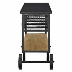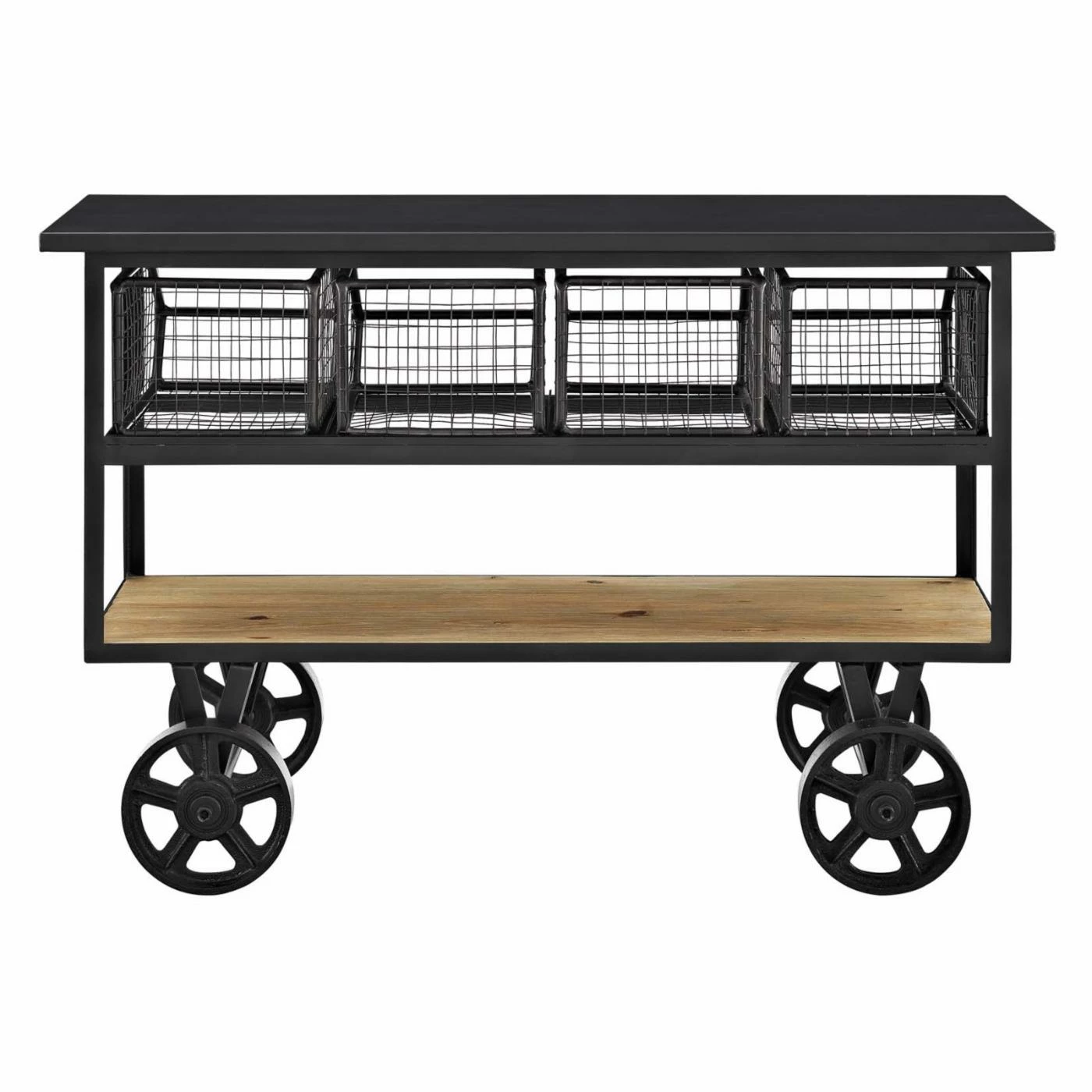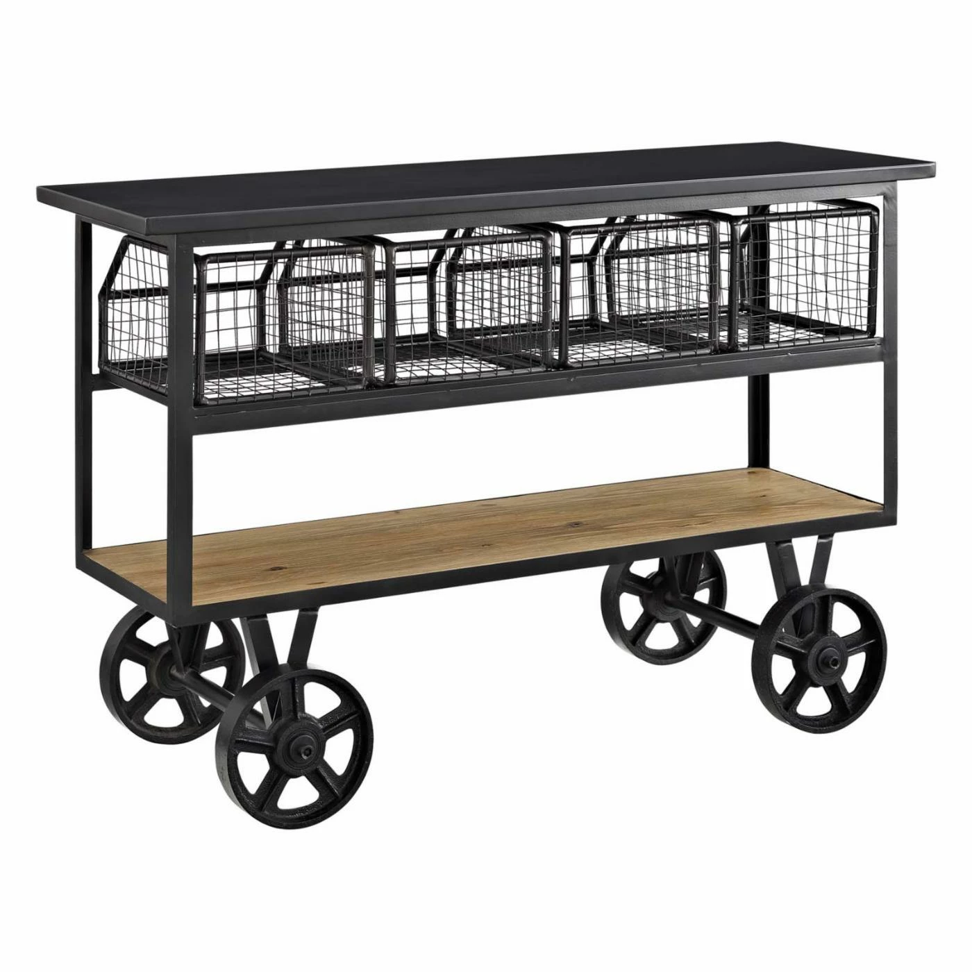 Organize your kitchen with the farmhouse-styled Modway Fairground Serving Stand β Brown. This charming and unique stand features a black lacquered steel frame with four baskets that are perfect for storing food, silverware, and more. The flat upper surface is perfect for prepping food or for using as a display space. The lower pine wood shelf offers additional storage for dishes, glasses, and more. Four large wheels make it easy to move this serving stand from room to room.