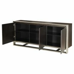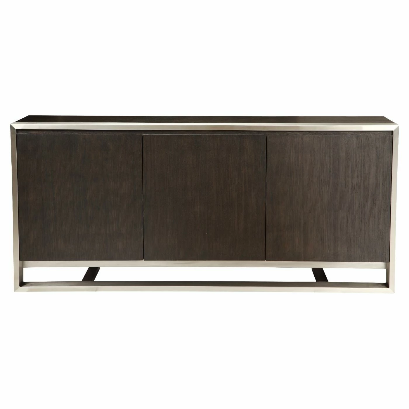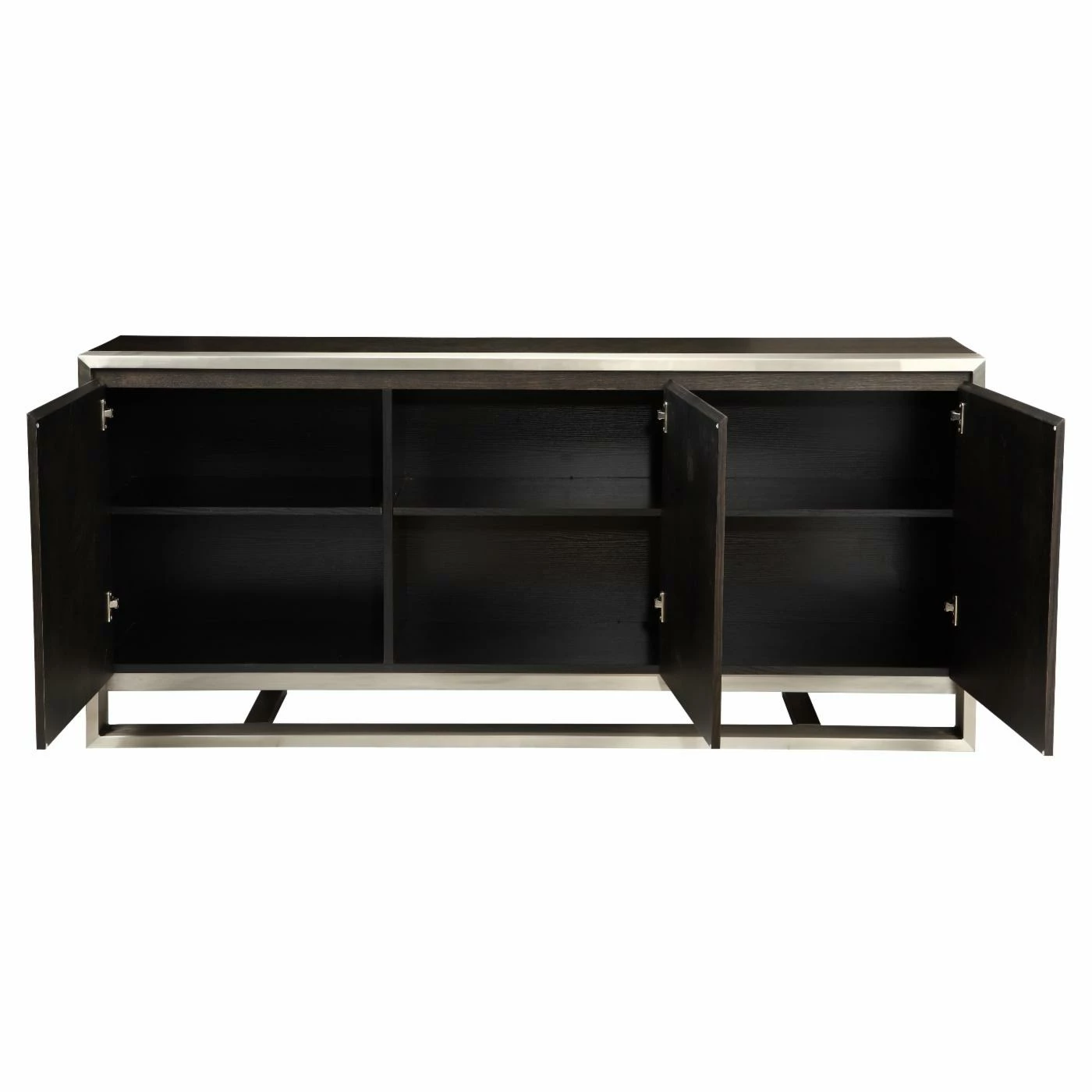 The Moe’s Home Collection Vincent Sideboard is a stylish, contemporary storage solution for your kitchen and dining space. Featuring dark wood veneers contrasting with a brushed stainless steel frame, this striking piece features plentiful storage with three doors that open to three storage compartments with fixed shelves.