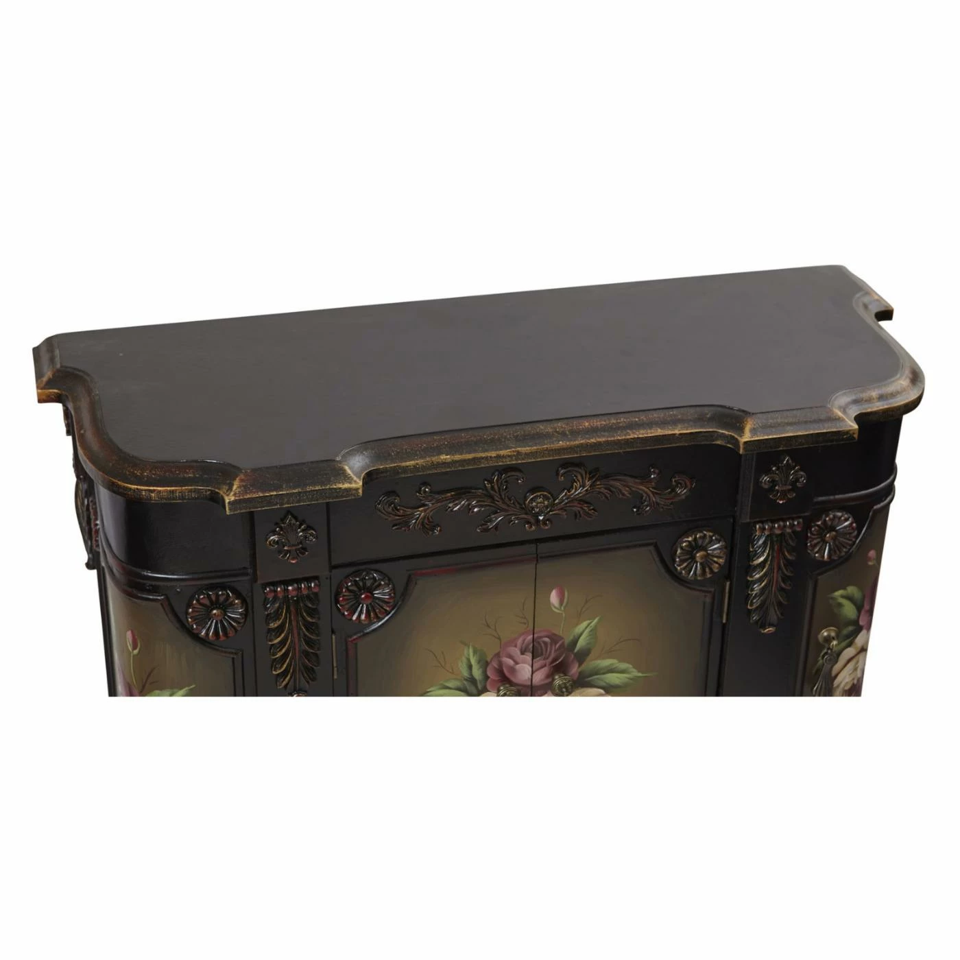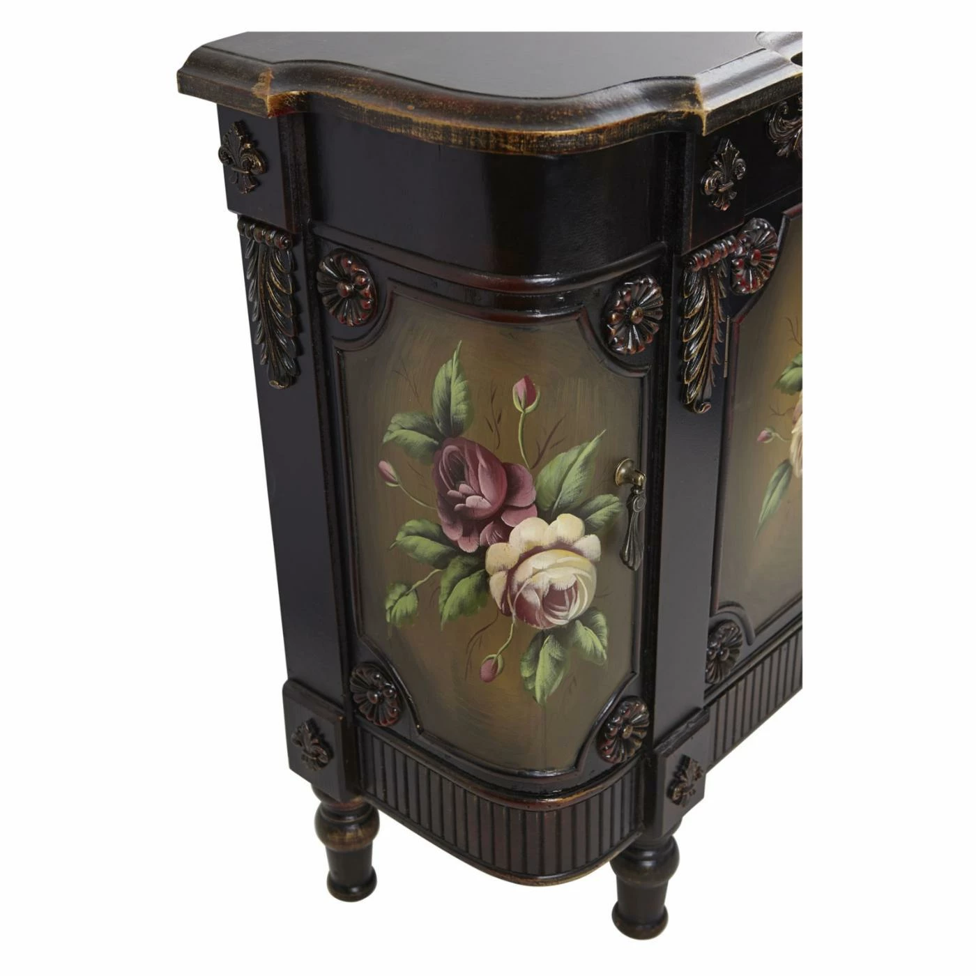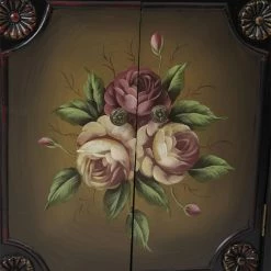 Reminiscent of antique furnishings, the Nearly Natural French Vintage Style Sideboard is an elegant way to add extra storage to your dining room, hallway, or living room. The trim of the engineered and solid wood sideboard features floral, leaf, and fleur-de-lis carvings, while the four doors are adorned with a feminine rose motif in dusty shades of pink. Gold accents along the top, base, and turned feet add a touch of glamour.