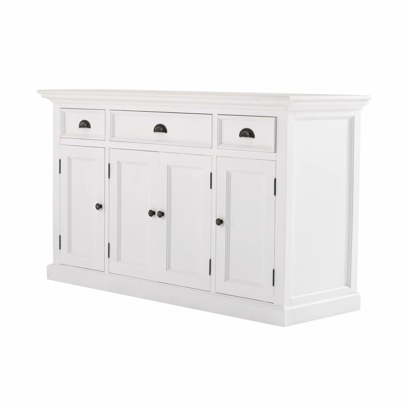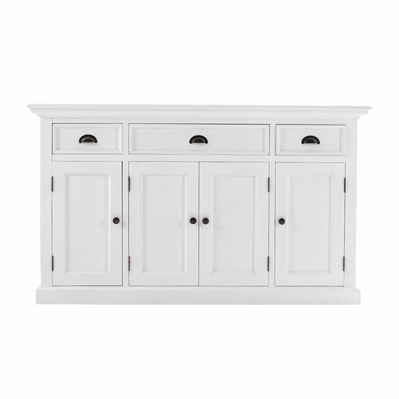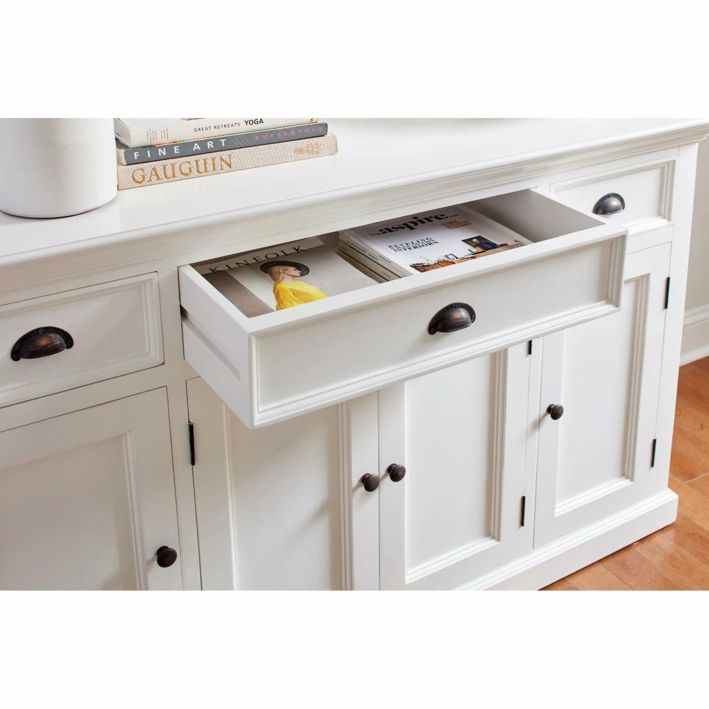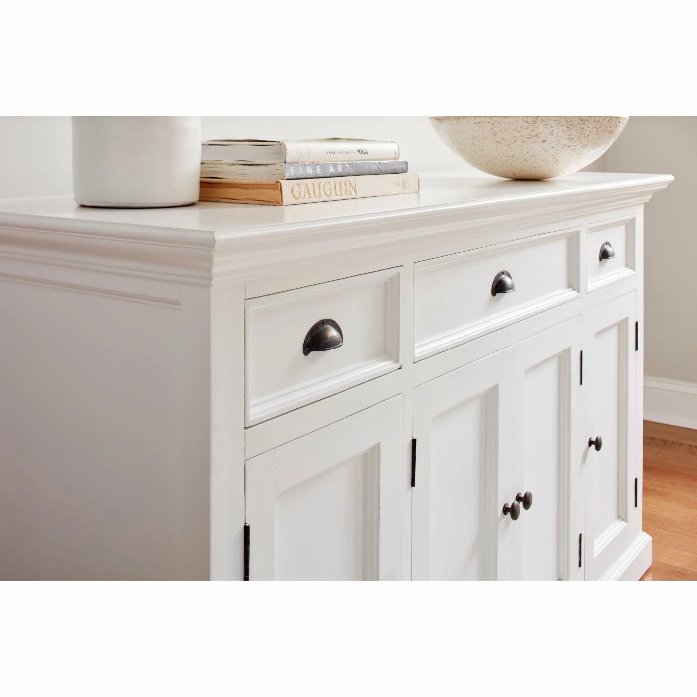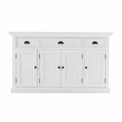 Style meets function with the Nova Solo Halifax 4 Door Dining Buffet. This 4 door and 3 drawer buffet is designed in the coastal shaker style with crown moldings and a classic white finish. The antique brass hardware provides a stunning contrast to the finish on this useful dining buffet.