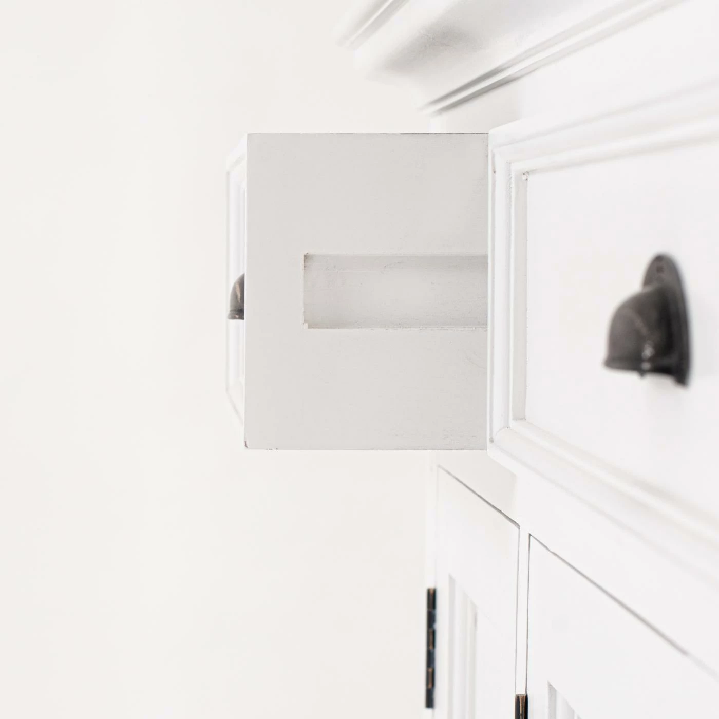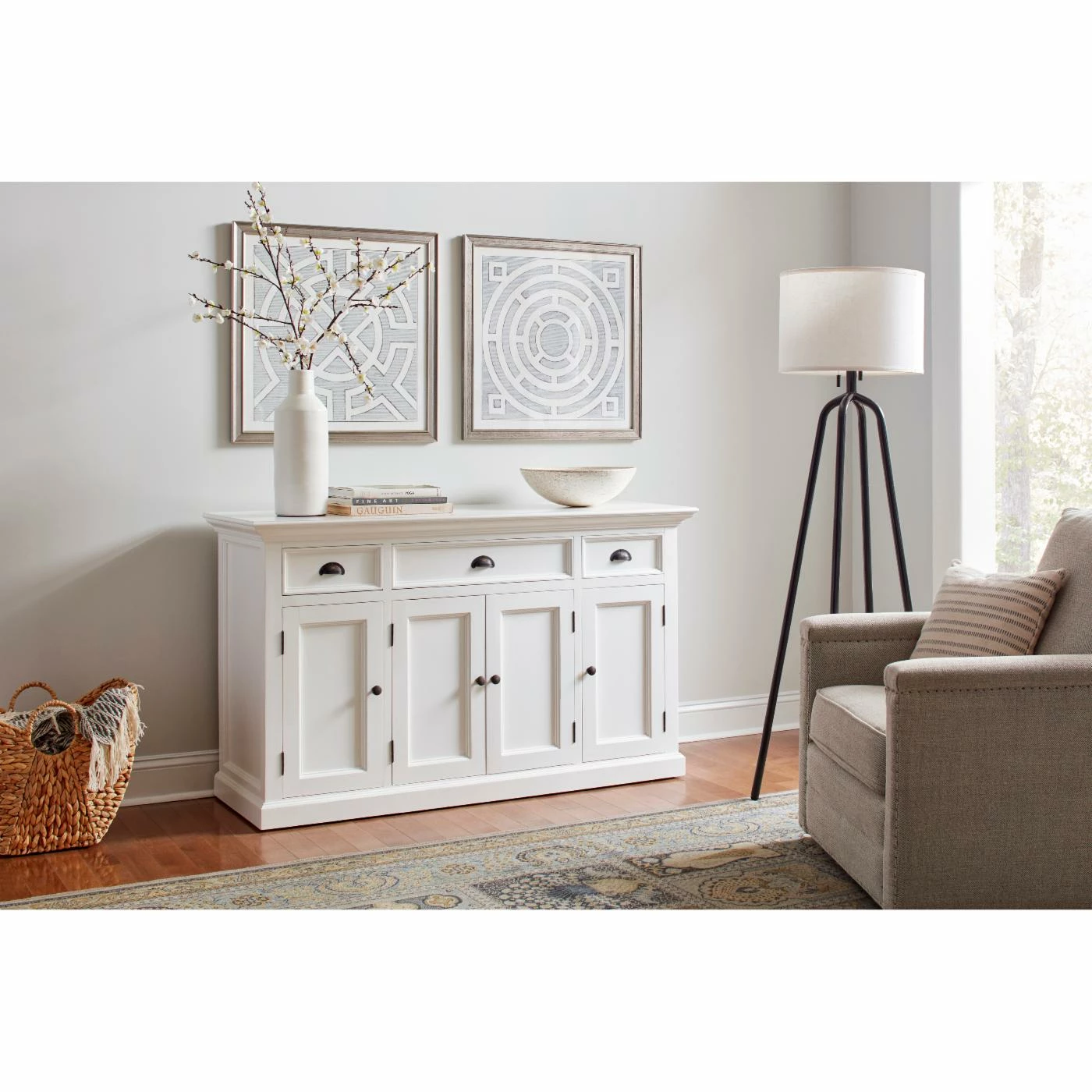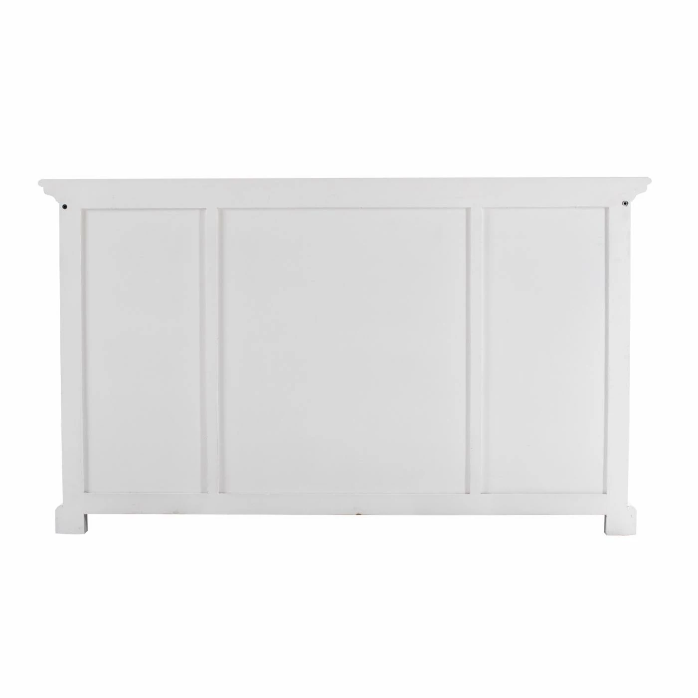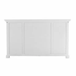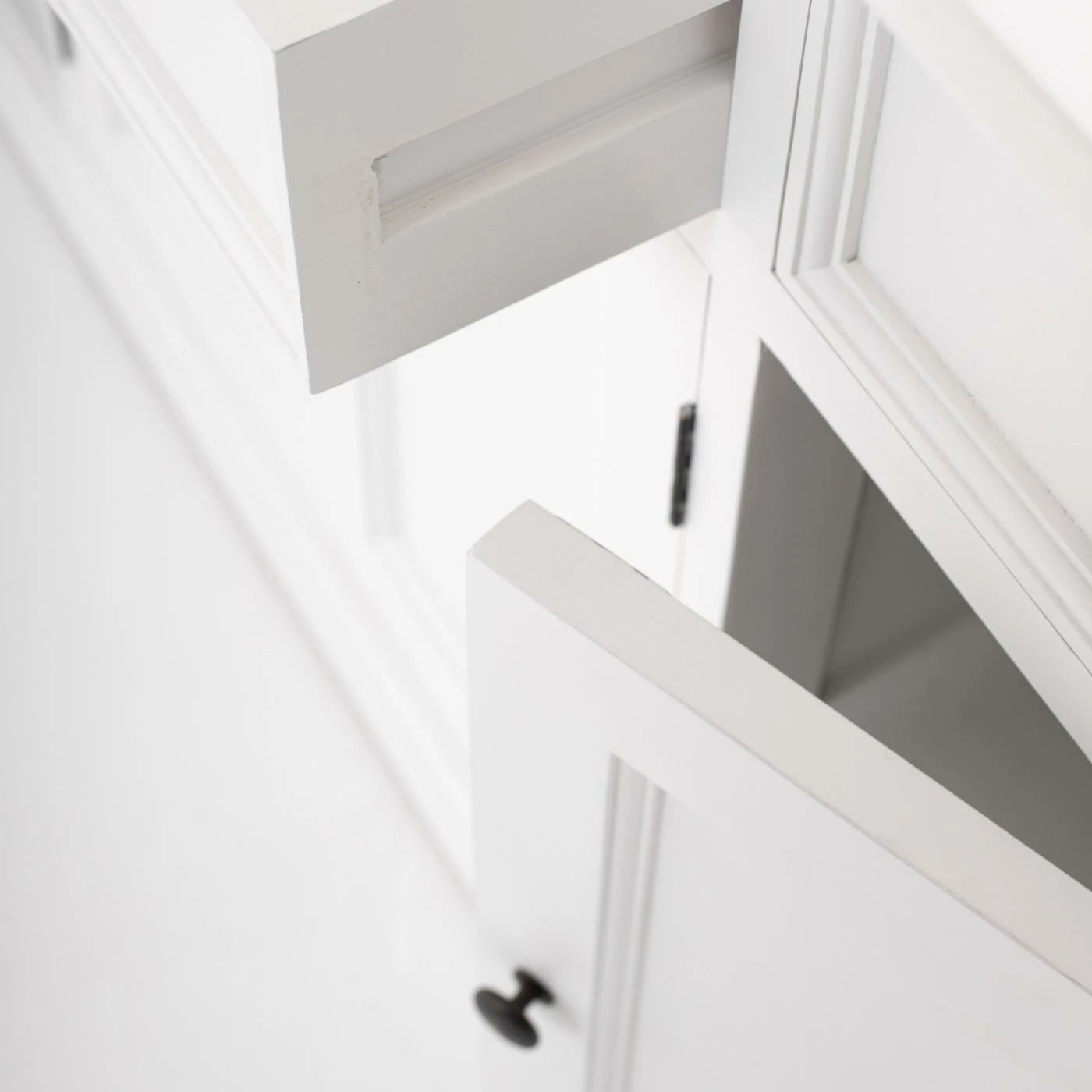 Style meets function with the Nova Solo Halifax 4 Door Dining Buffet. This 4 door and 3 drawer buffet is designed in the coastal shaker style with crown moldings and a classic white finish. The antique brass hardware provides a stunning contrast to the finish on this useful dining buffet.