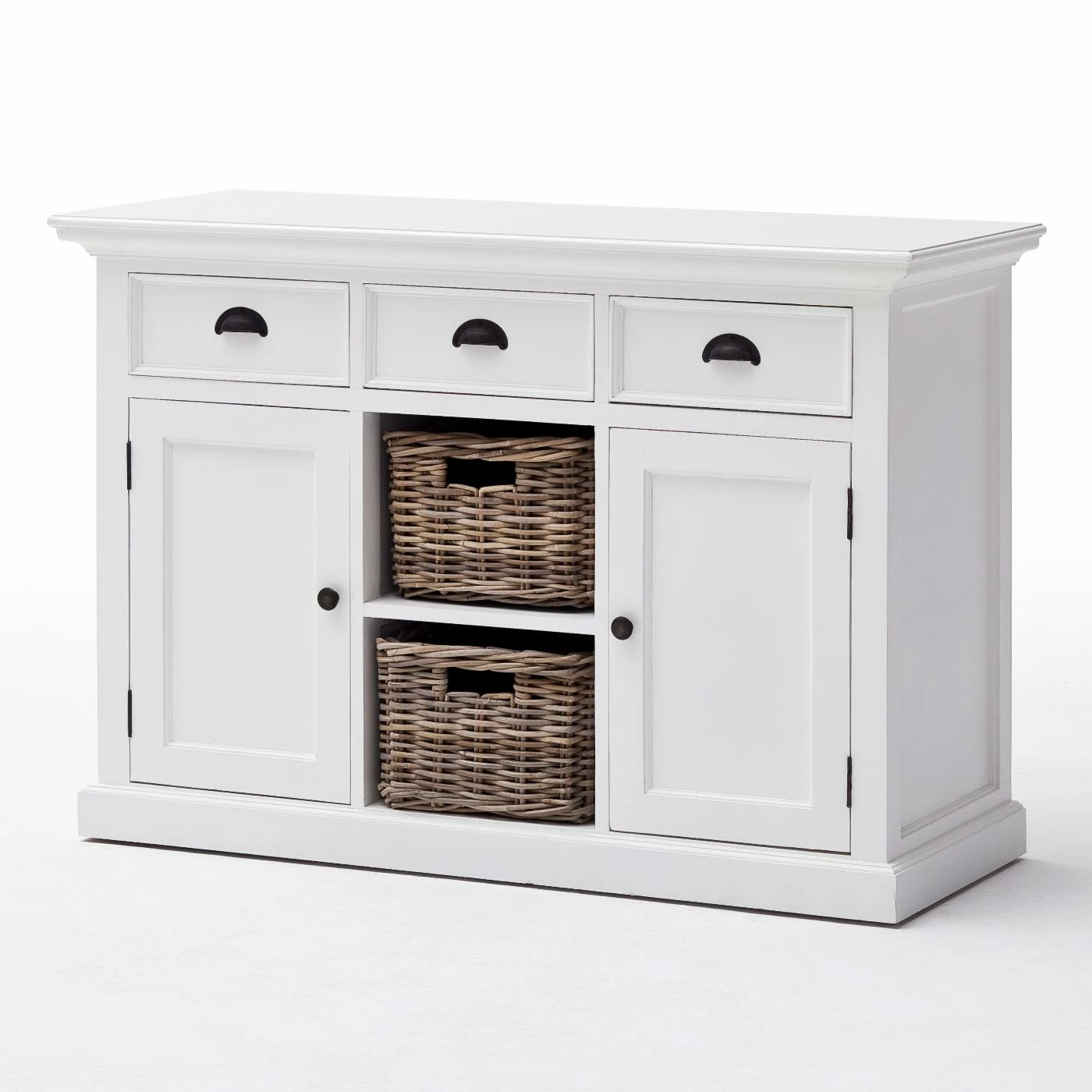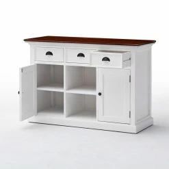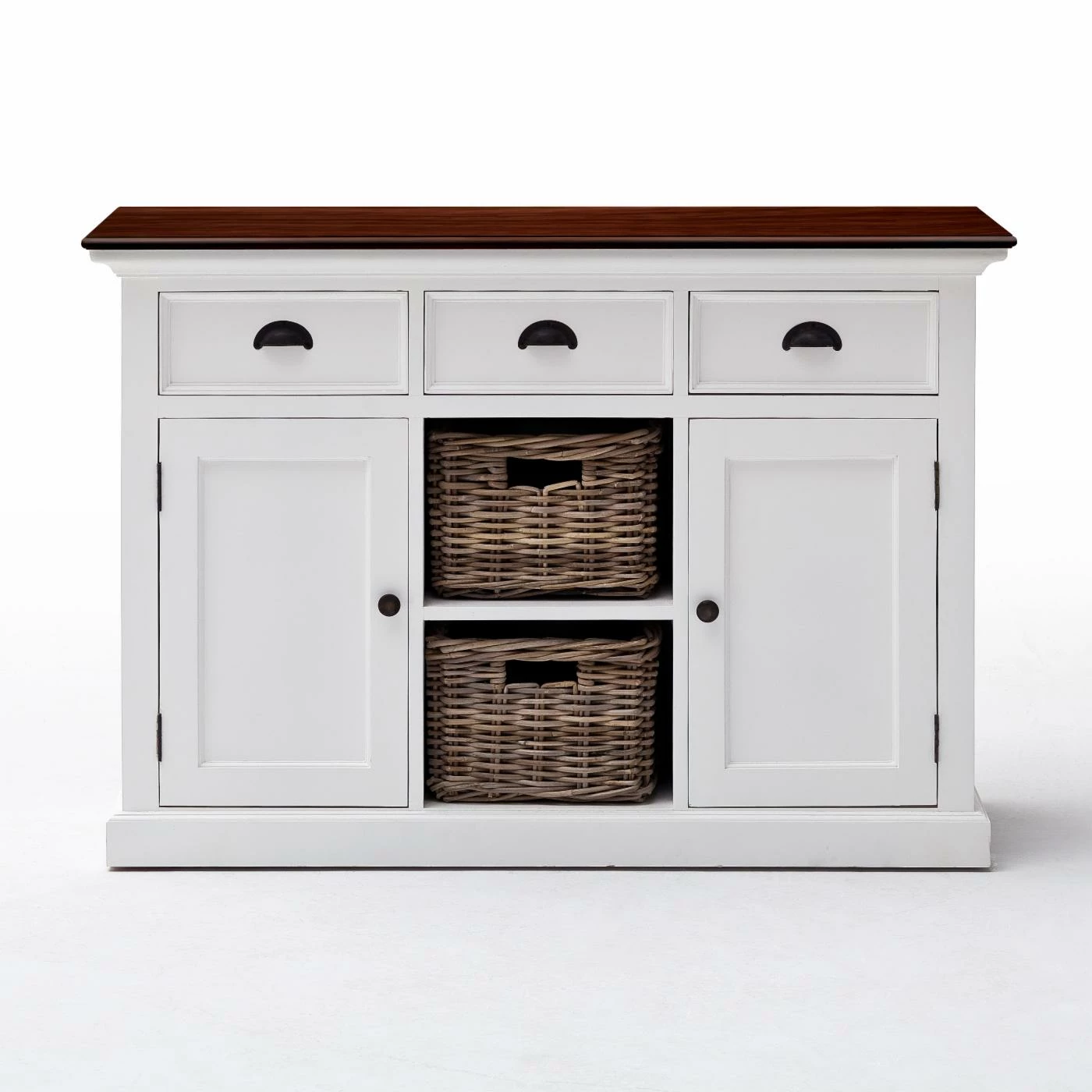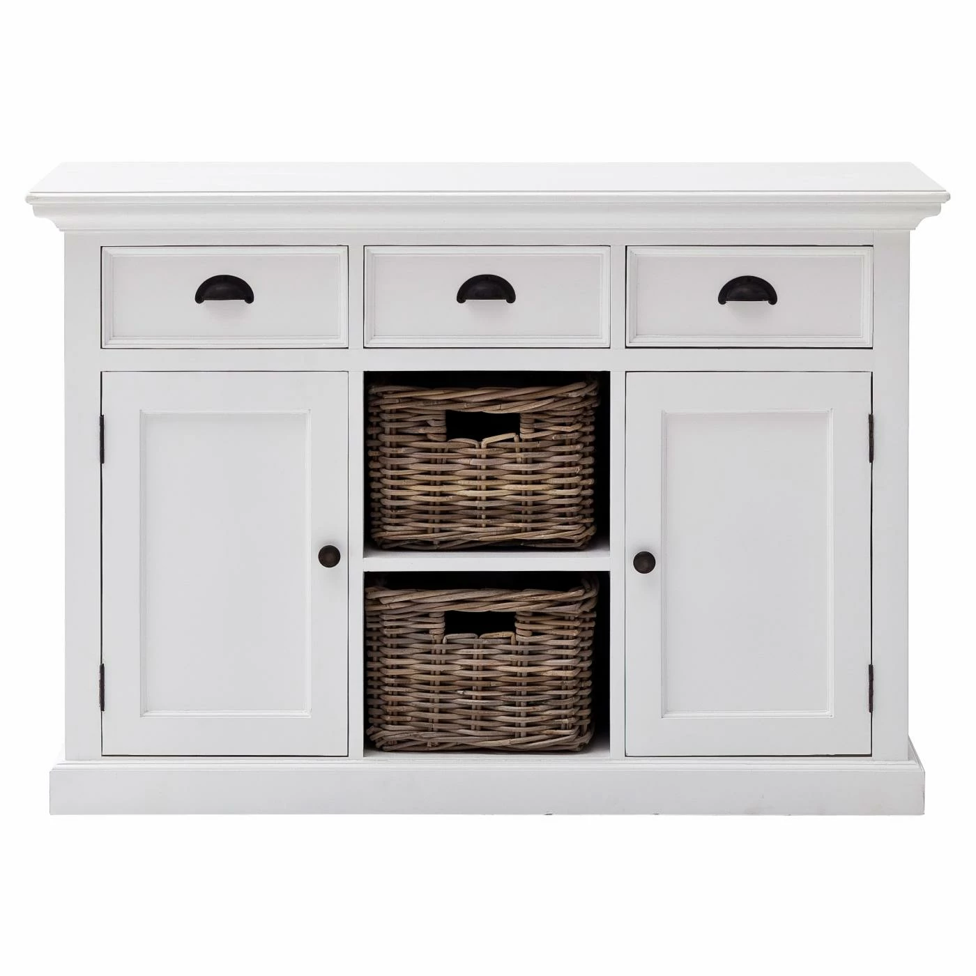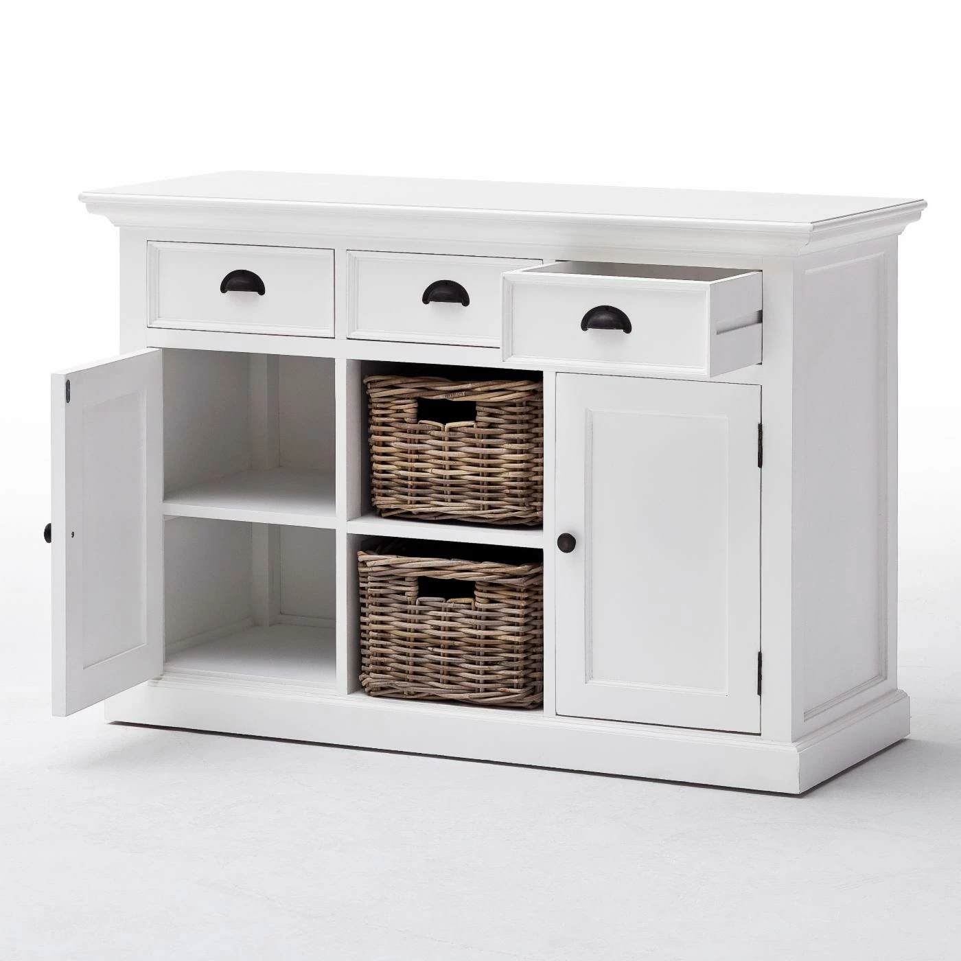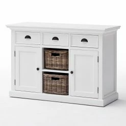 The Nova Solo Halifax Buffet with 2 Baskets provides your kitchen or dining room with an essential piece of storage that fits right in with your country- or cottage-style space. Its sturdy frame is constructed from solid mahogany and is supported by composite wood panels. The frame is available in select finishes and is distressed for a well-loved feel. Two open shelves are incorporated into the center of the piece, complete with two rattan baskets. A single-door cabinet flanks each side of the open shelves, each concealing an interior shelf. Three full-extension pull-out drawers come built above the shelving. Antique brass metal hardware adorns the buffet.
