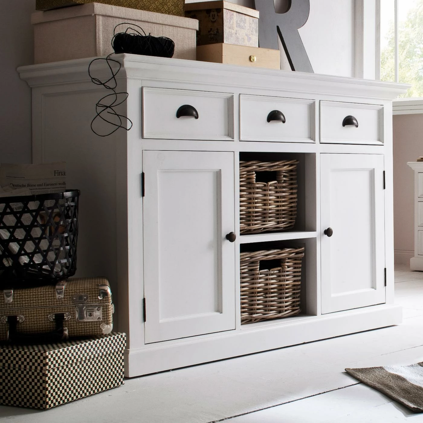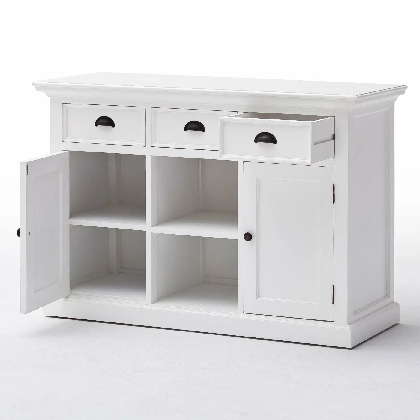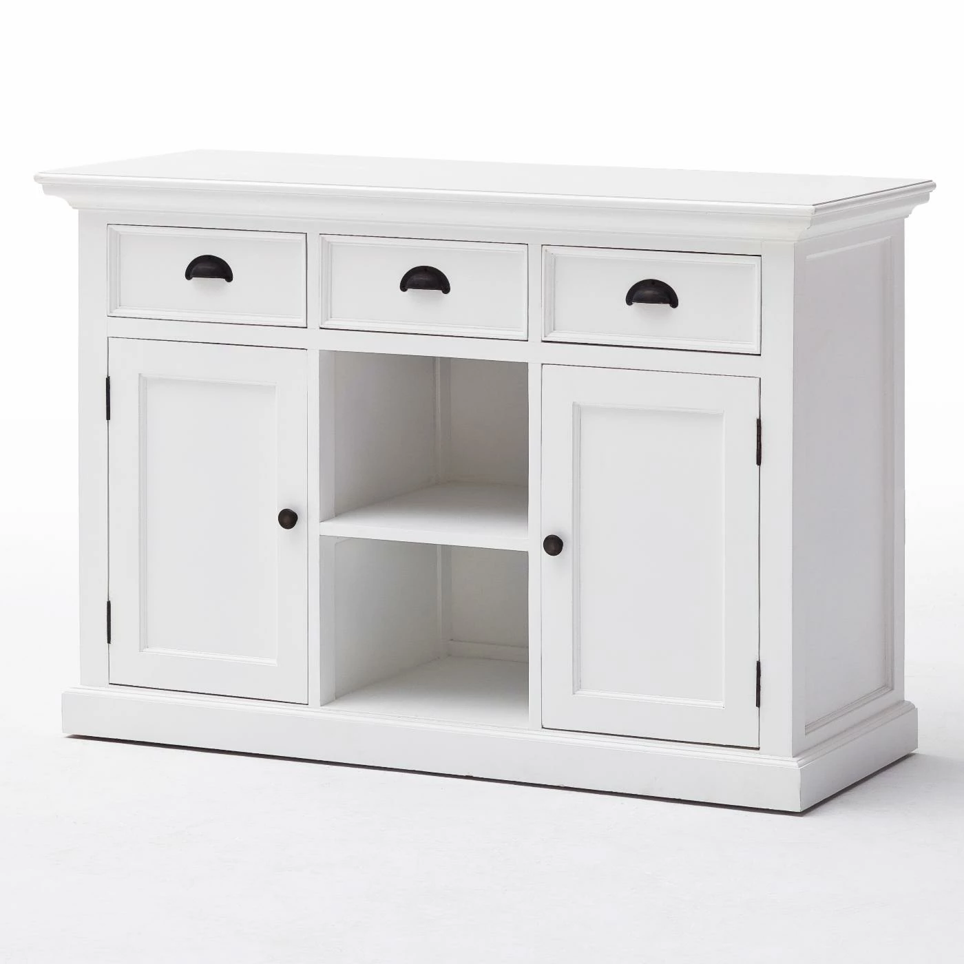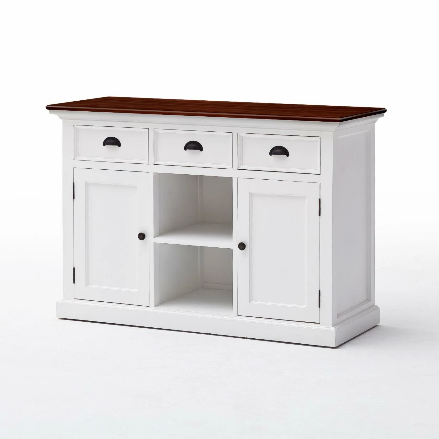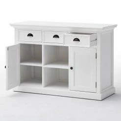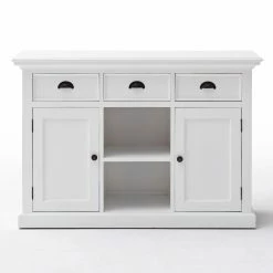 The Nova Solo Halifax Buffet with 2 Baskets provides your kitchen or dining room with an essential piece of storage that fits right in with your country- or cottage-style space. Its sturdy frame is constructed from solid mahogany and is supported by composite wood panels. The frame is available in select finishes and is distressed for a well-loved feel. Two open shelves are incorporated into the center of the piece, complete with two rattan baskets. A single-door cabinet flanks each side of the open shelves, each concealing an interior shelf. Three full-extension pull-out drawers come built above the shelving. Antique brass metal hardware adorns the buffet.