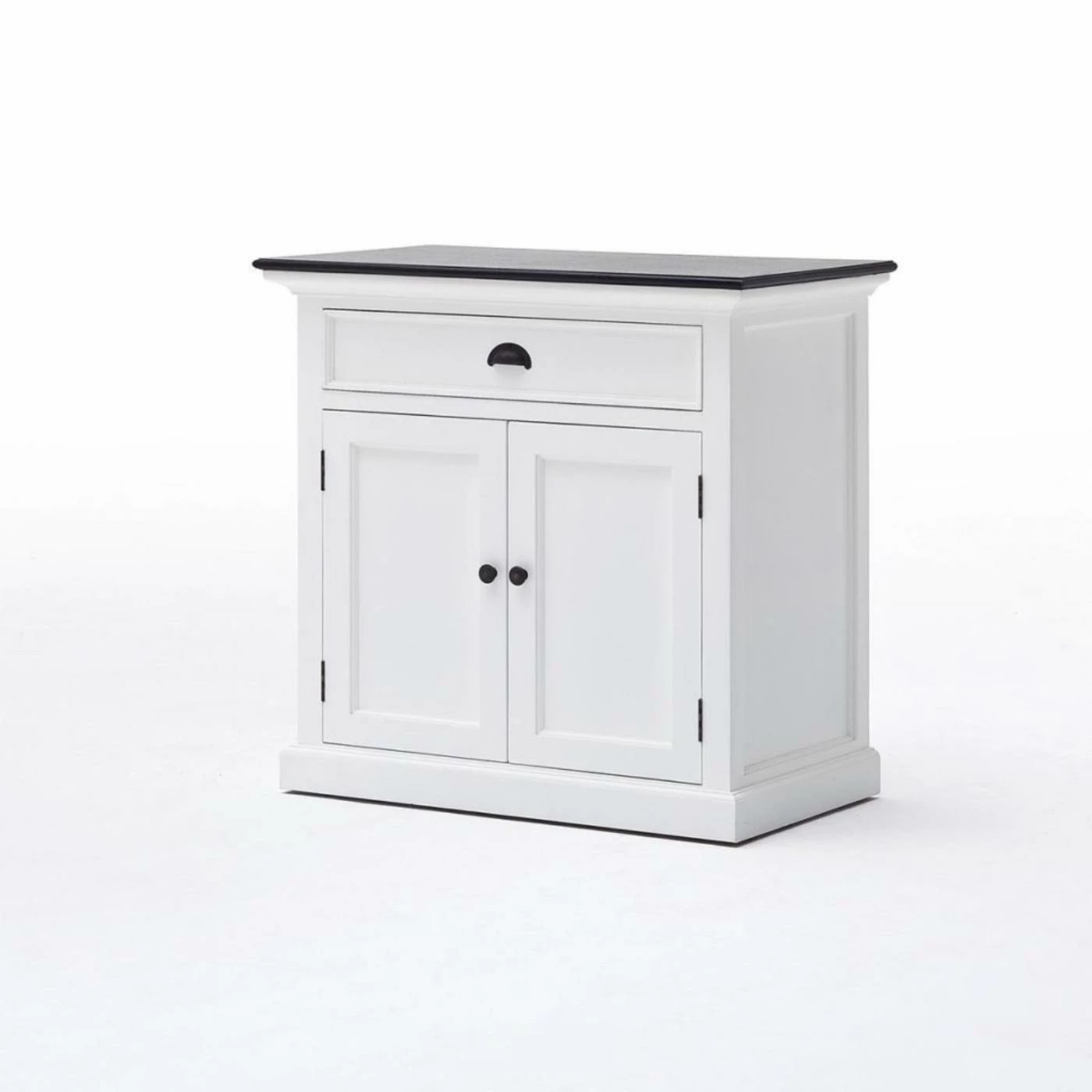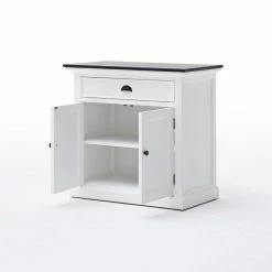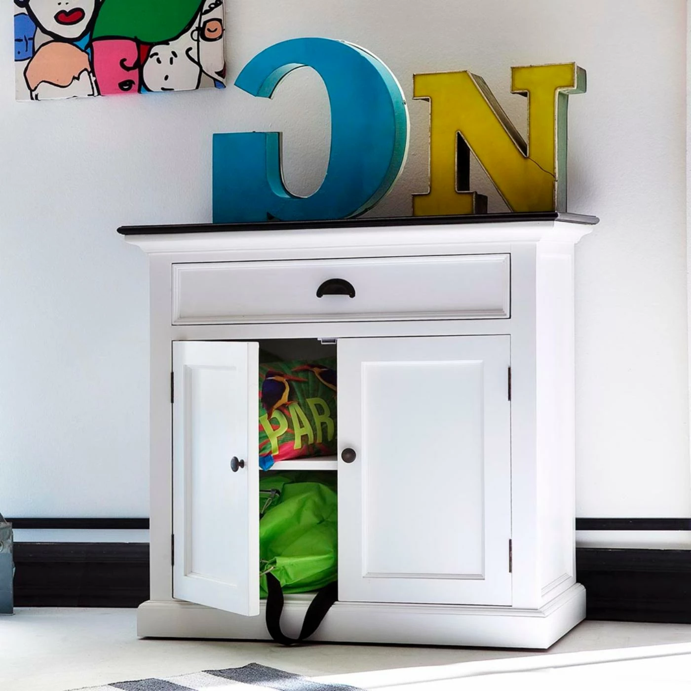 Modest but mighty, the Nova Solo Halifax Contrast 2 Door Buffet is a smart storage addition to any space. This clever buffet is crafted from kiln dried mahogany and engineered wood in a crisp white finish with contrasting black top, antique brass hardware, and bevelled accents. Open the cabinet doors for interior shelving and use the large top drawer for additional storage.