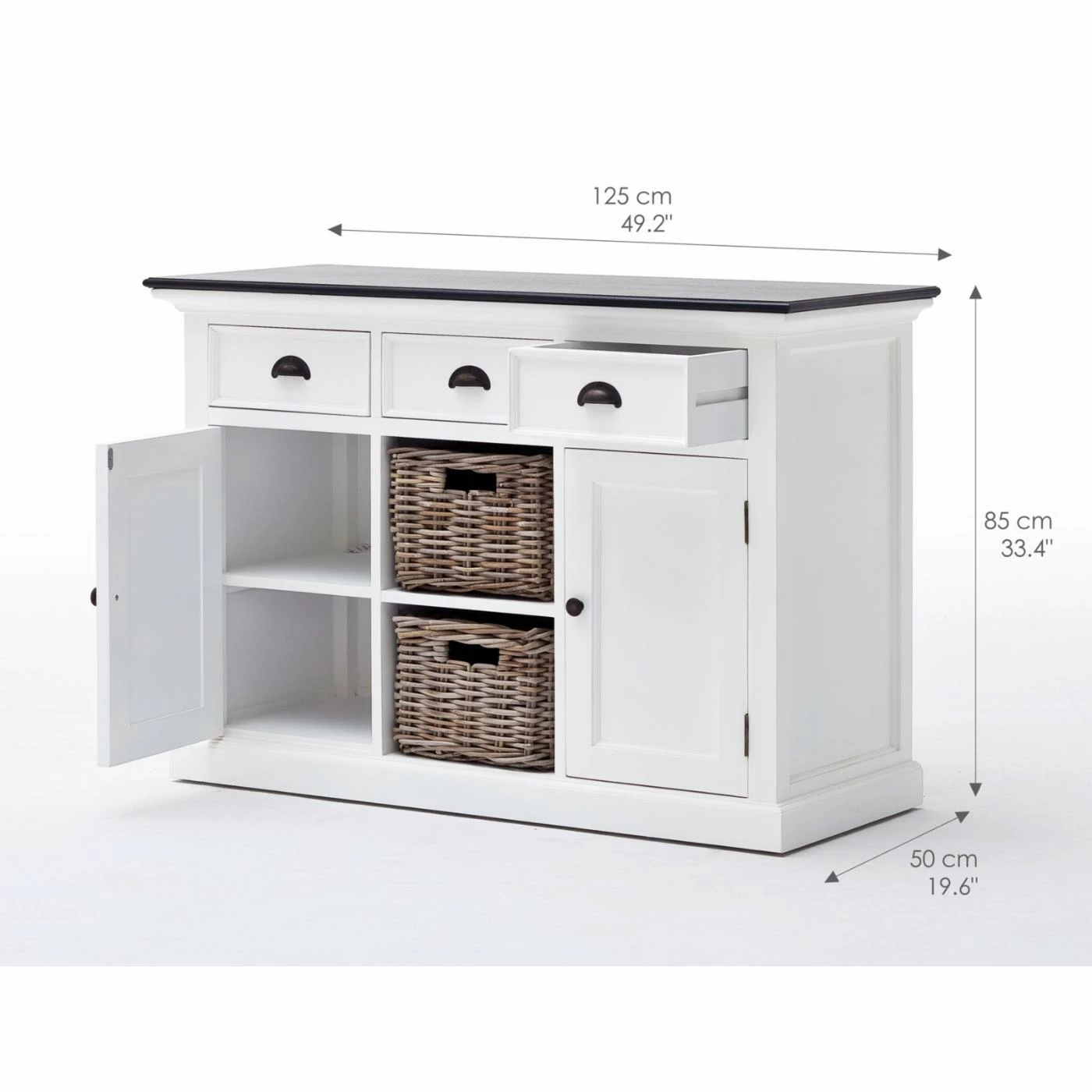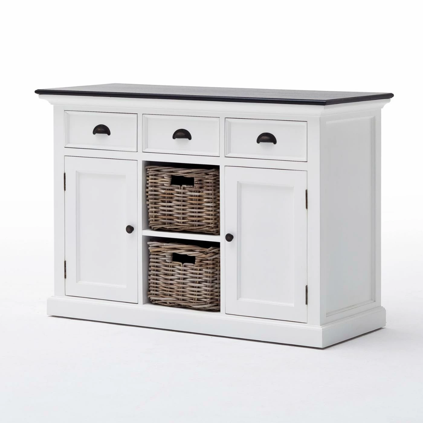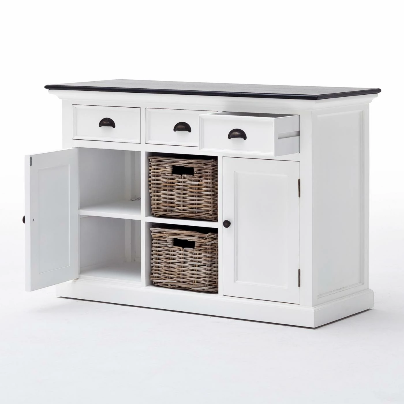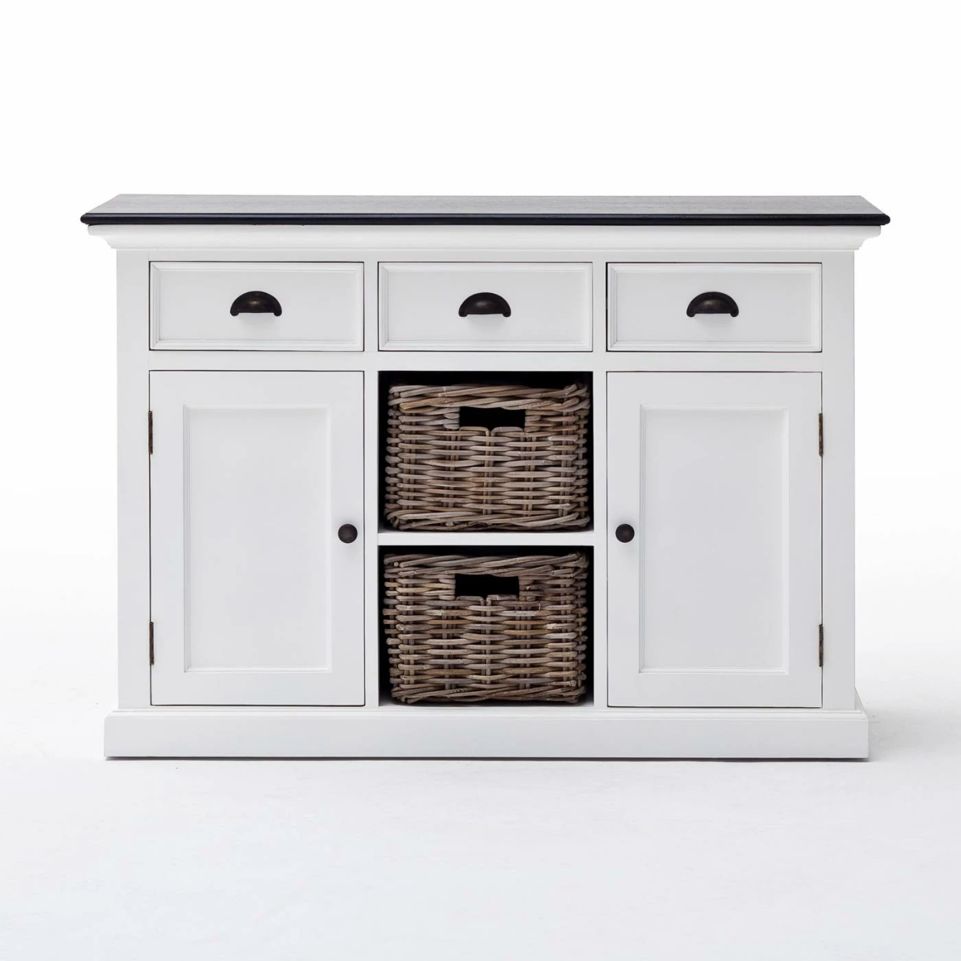 With a mix of smart storage options, the Nova Solo Halifax Contrast Buffet with 2 Baskets is a clever and stylish addition to any space. Crafted from kiln dried mahogany and engineered wood, this buffet has a crisp white finish with contrasting black top, antique brass hardware, and bevelled accents. Two cubbies provide space for the included hand-woven rattan baskets, and each cabinet contains a shelf to keep you organized. Three drawers keep essentials close-at-hand.