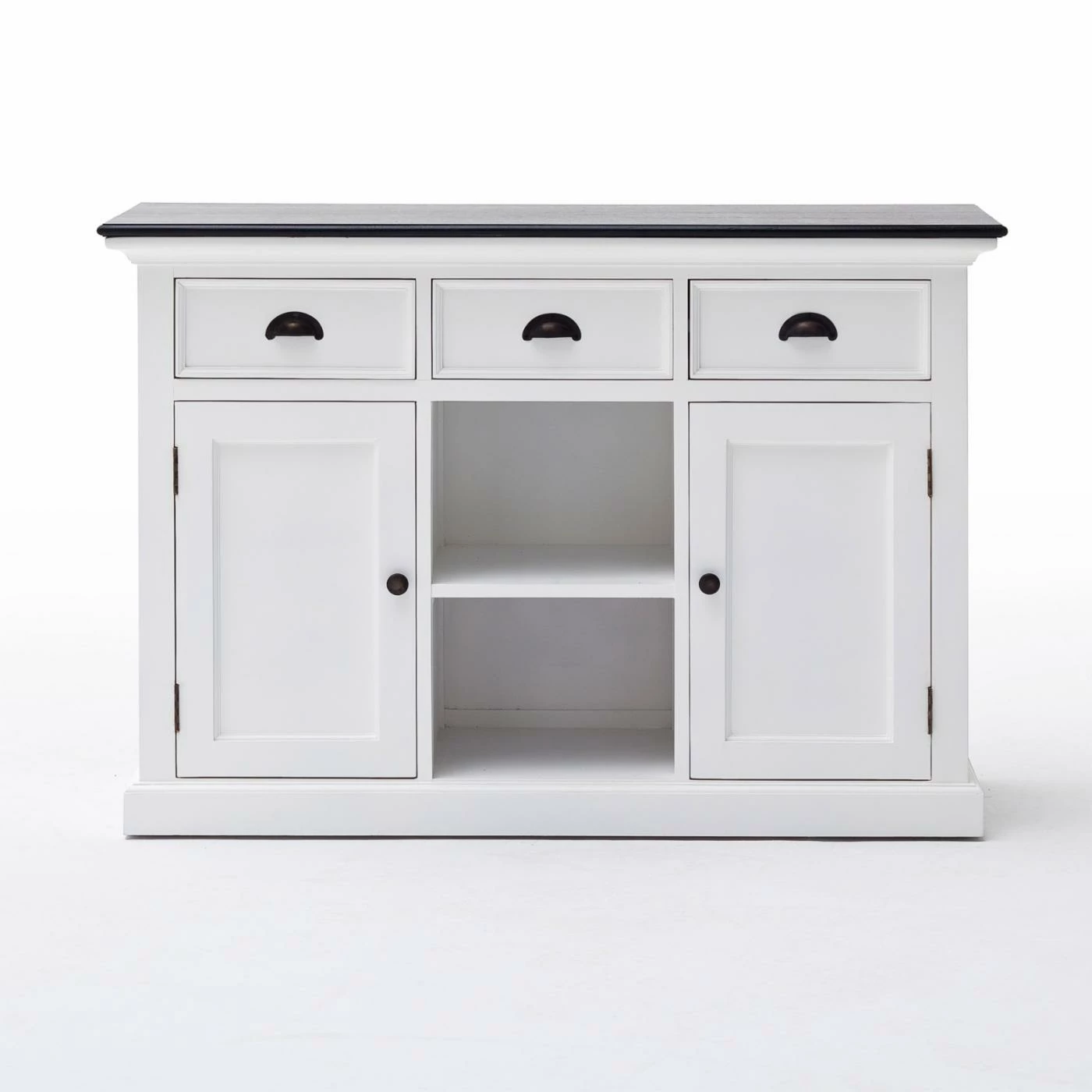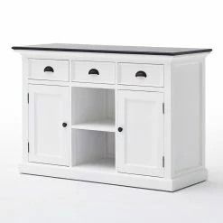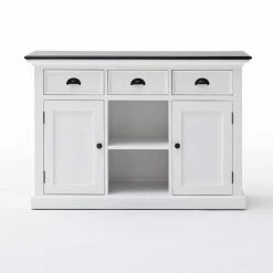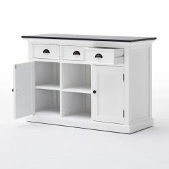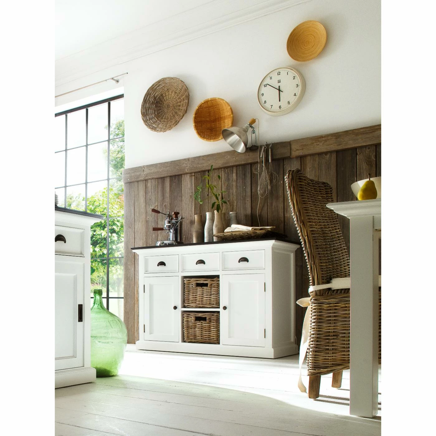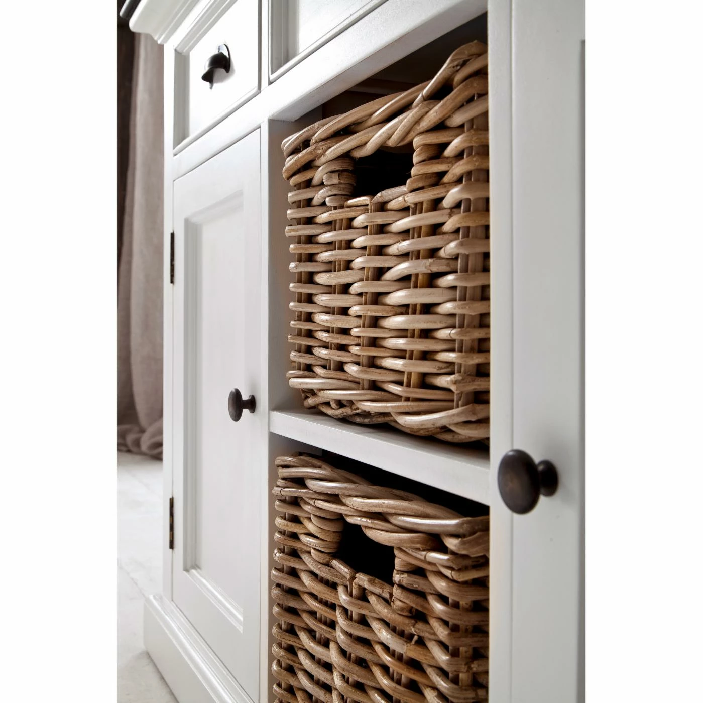 With a mix of smart storage options, the Nova Solo Halifax Contrast Buffet with 2 Baskets is a clever and stylish addition to any space. Crafted from kiln dried mahogany and engineered wood, this buffet has a crisp white finish with contrasting black top, antique brass hardware, and bevelled accents. Two cubbies provide space for the included hand-woven rattan baskets, and each cabinet contains a shelf to keep you organized. Three drawers keep essentials close-at-hand.